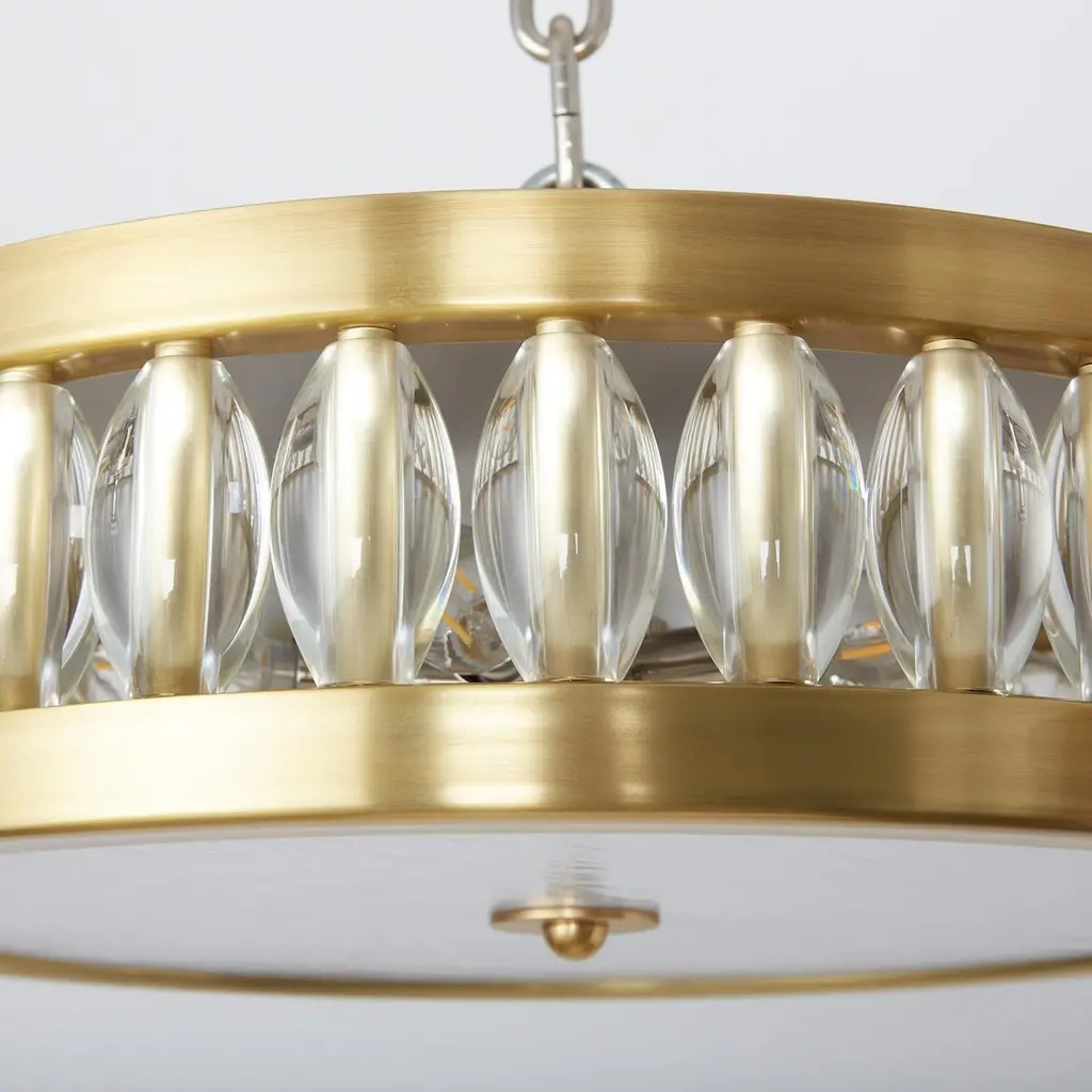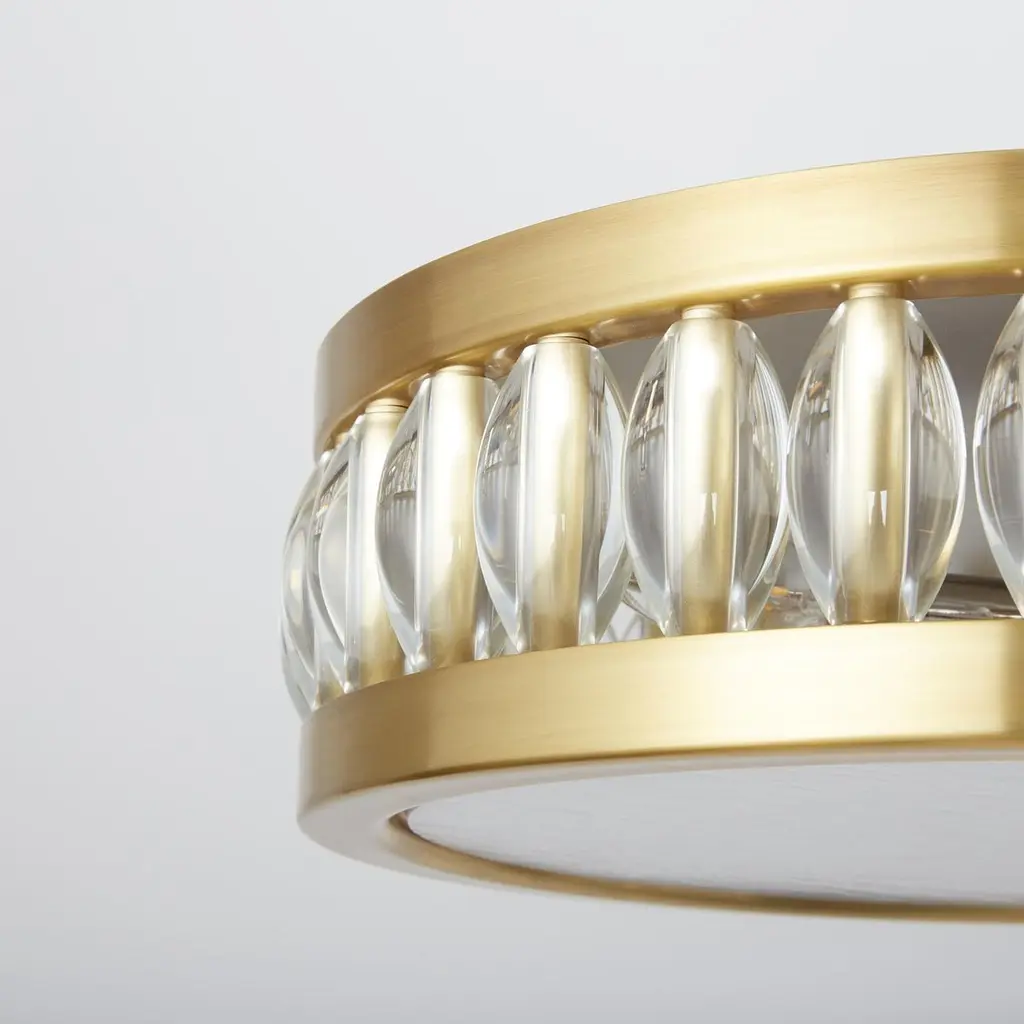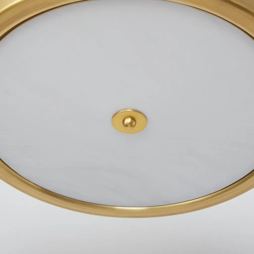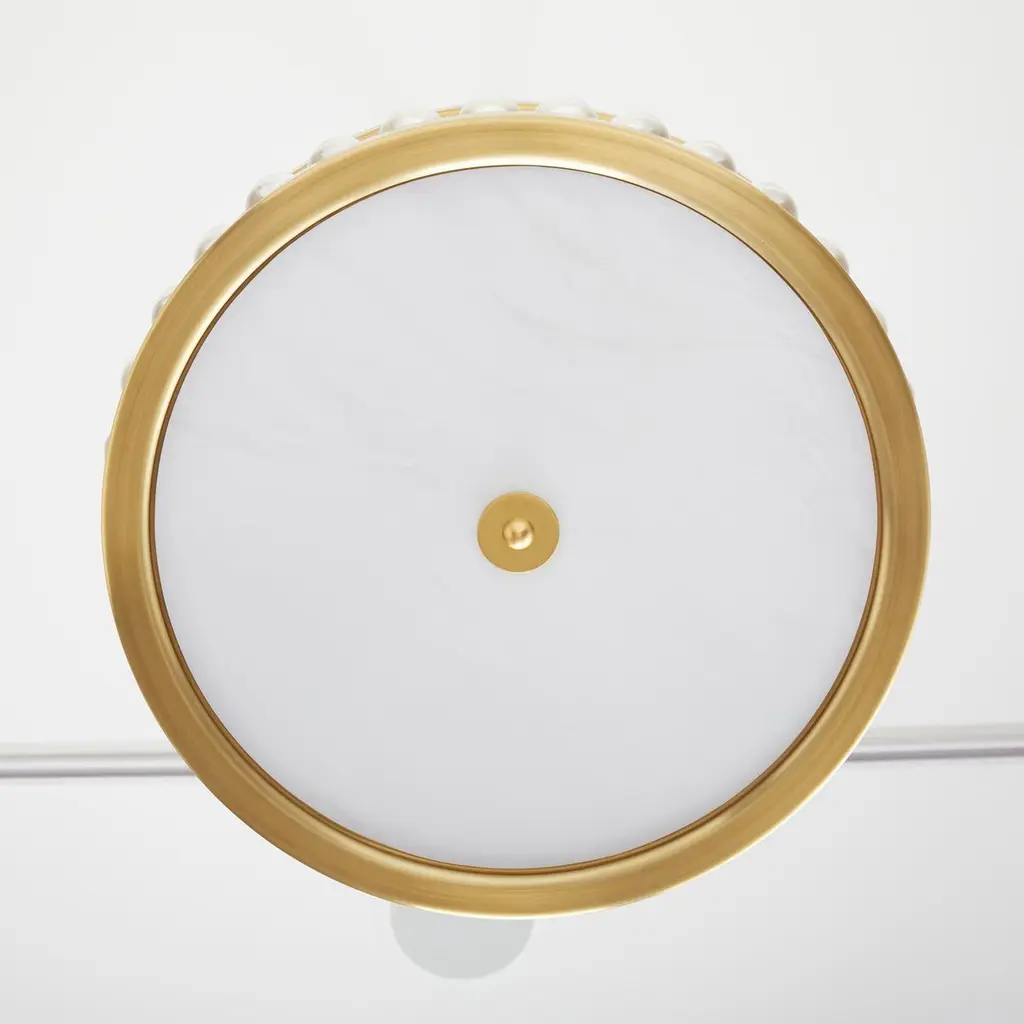 A 19.5" round flush-mounted ceiling fixture, the metal frame securing a flat piece of white swirl glass with finial in center on underside, the sides with over-scaled oval Murano glass beads.Includes five standard Edison sockets.Maximum wattage 100/socket (Recommended wattage 60/socket).Pricing includes standard non-UL wiring.