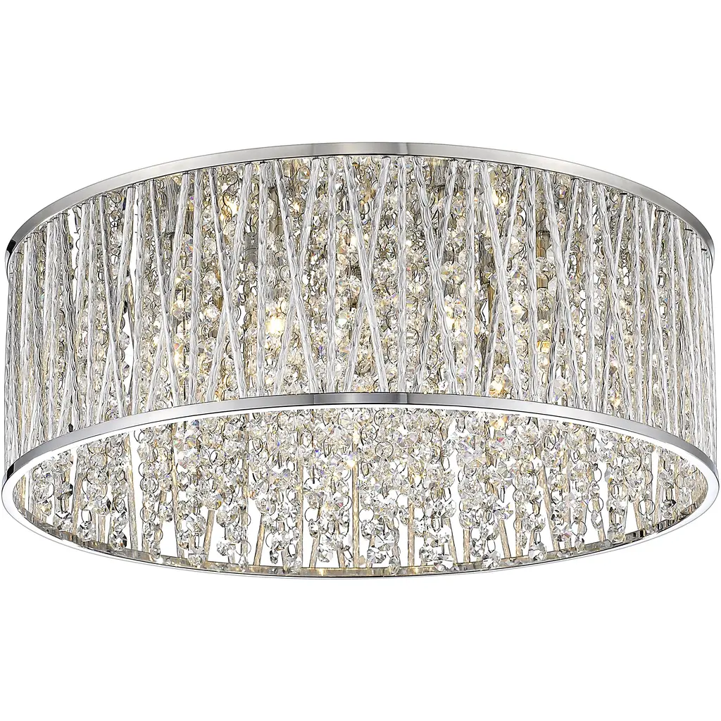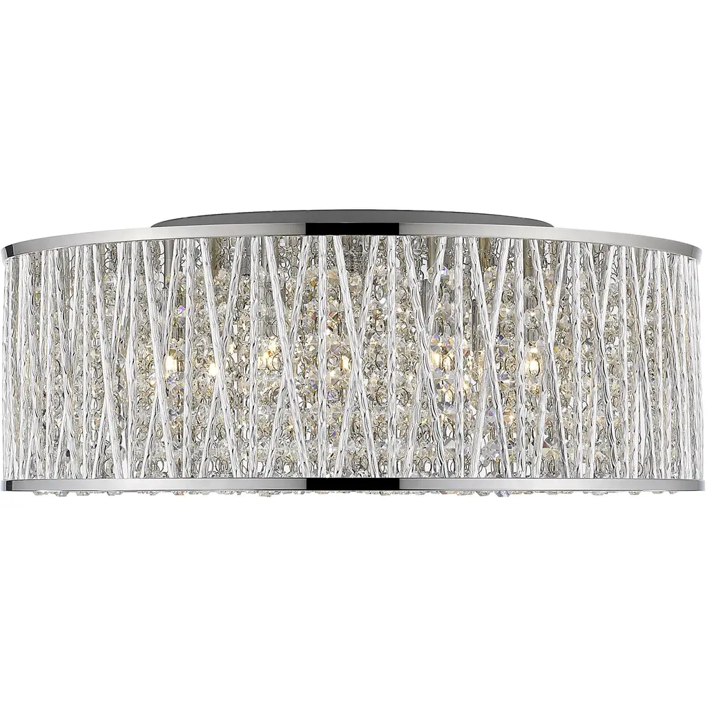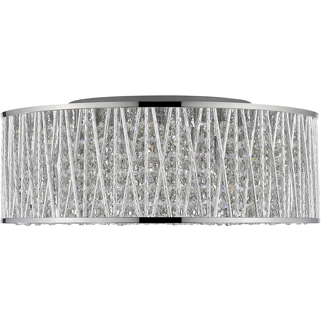 A chic gleam complements lean lines of this chrome finished aluminum strikingly contemporary seven-light flush mount lighting fixture. Gleaming and glowing lines of polished crystals intertwined with the unusual crossed and single line chrome shade pattern shines in an elegantly modern style.