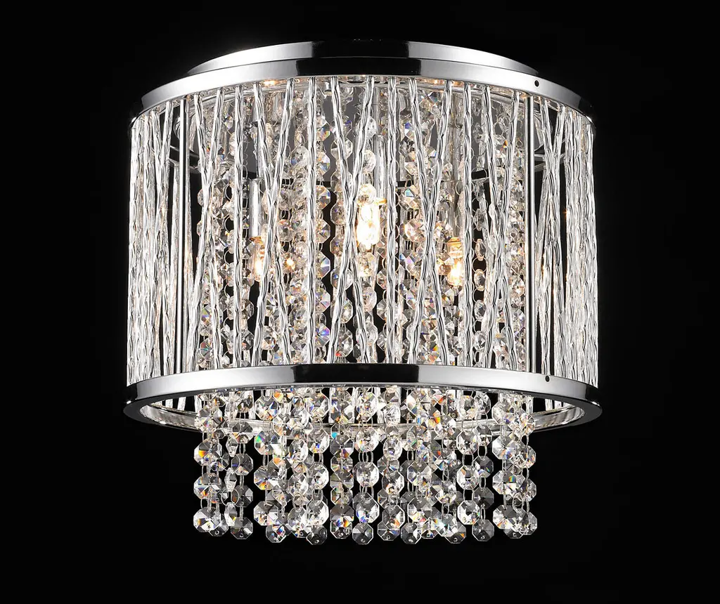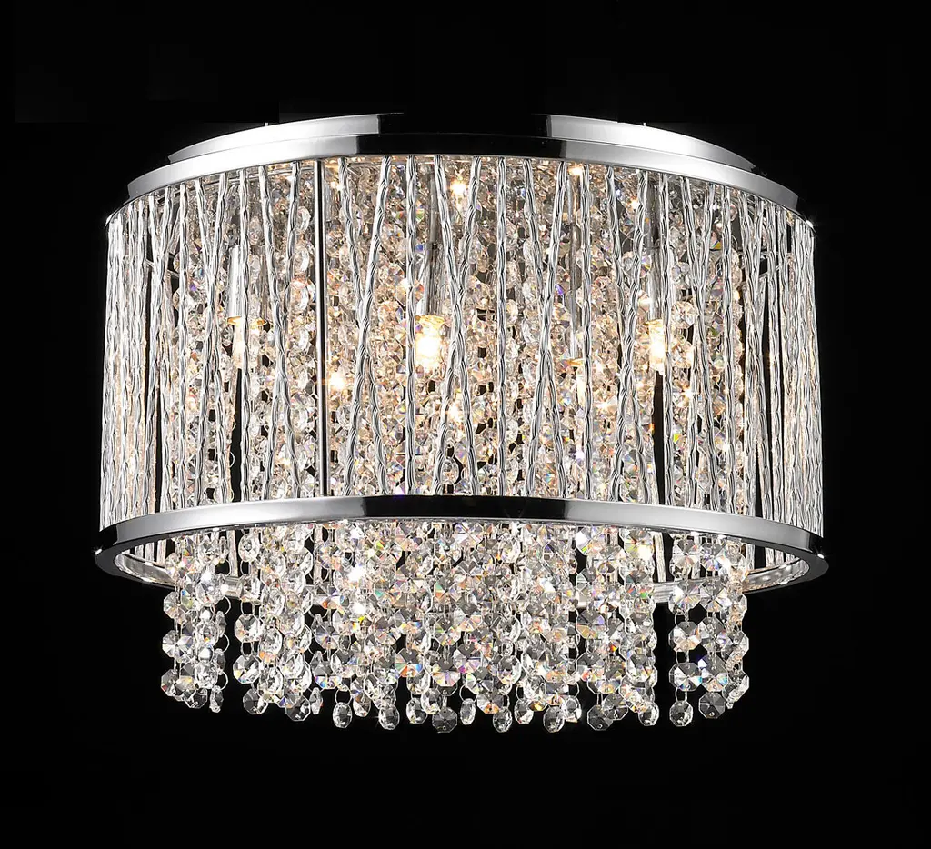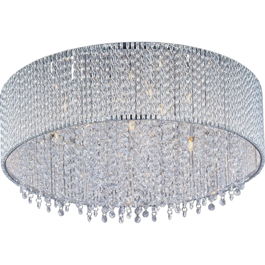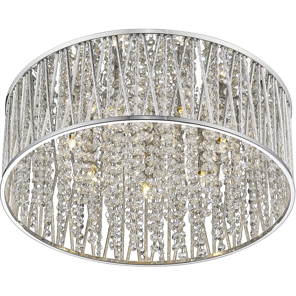 A chic gleam complements lean lines of this chrome finished aluminum strikingly contemporary seven-light flush mount lighting fixture. Gleaming and glowing lines of polished crystals intertwined with the unusual crossed and single line chrome shade pattern shines in an elegantly modern style.