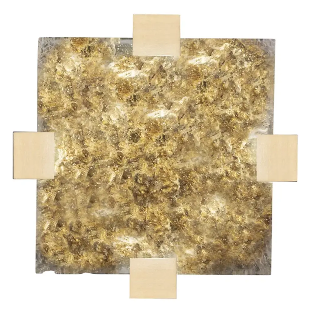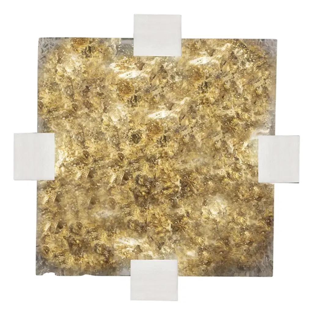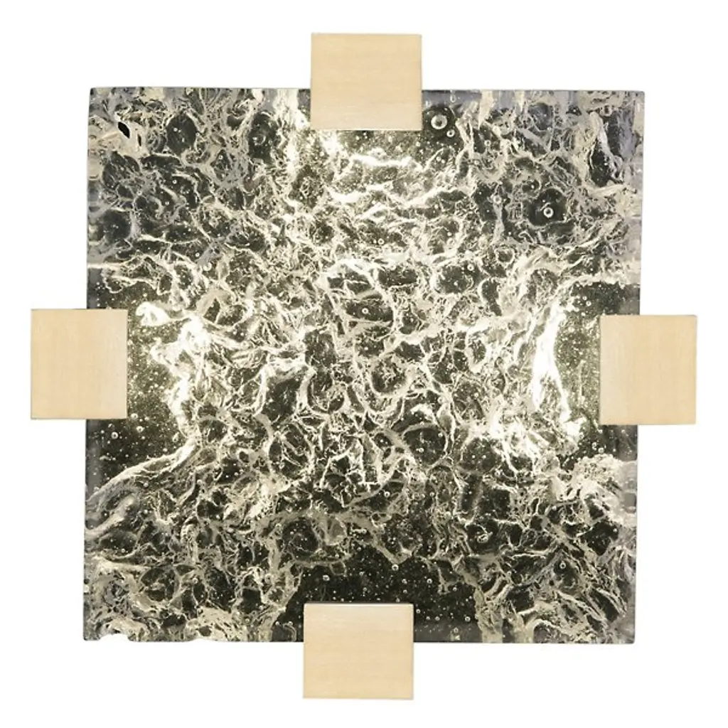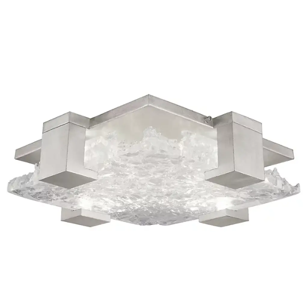 Add a restrained natural accent to your indoor spaces with the eye-catching lines of the Terra LED Flushmount from Fine Art Handcrafted Lighting. Starting with a square metal canopy, it sends down a bracket from each side to hold a similarly square late of cast glass set over LED lamping. The glass is left alone on its upper edge but is polished on its sides and base. This combination of textures offers a sculptural presence when the irregular glass is viewed from the side, growing warm and encompassing as it diffuses glare from the light below.