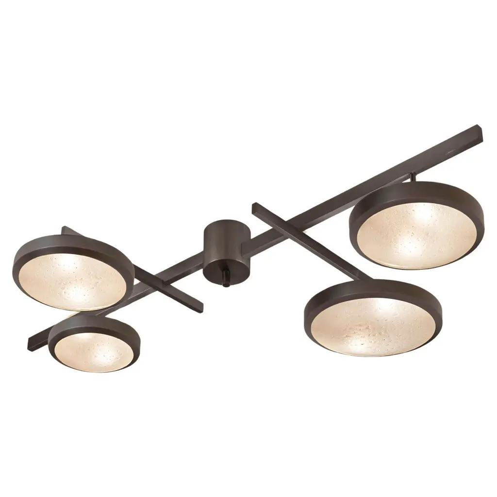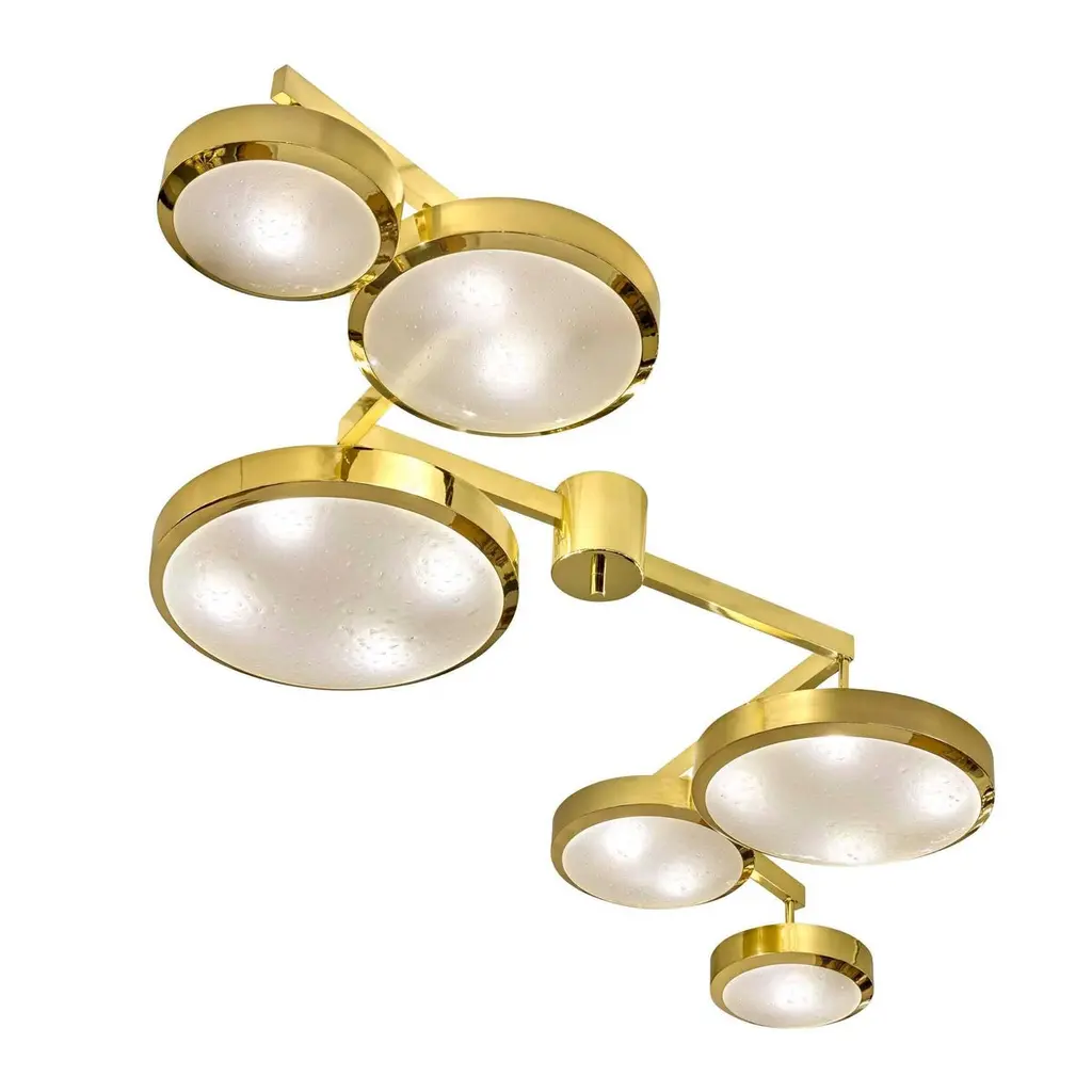 The Tetrix ceiling light features a composition of variable sized Murano glass shades on a brass machined frame highlighting perpendicular and intersecting lines. The first images show the fixture in our satin brass finish-subsequent pictures show it in a selection of alternative finishes. Starts at 12,900. for standard finishes.Starts at 14,200 for premium finishes.Customization Options: Each fixture is hand crafted in Italy and can be customized in size, layout and number of shades. Available in any of our 10 finishes and 8 enamel colors. Compatible with our Murano bubble glass and Murano frosted glass. Can be installed as a flush mount or on a stem.Lead Time: 10-12 weeks plus shipping. May be available for quick ship in 6 weeks or under.Width: 62”Depth: 37”Height: 11”. Overall height can be adjusted as needed. 9” minimum height Electrical: Eight E12 40W incandescent or 75W LED equivalentModel#: LTZ600