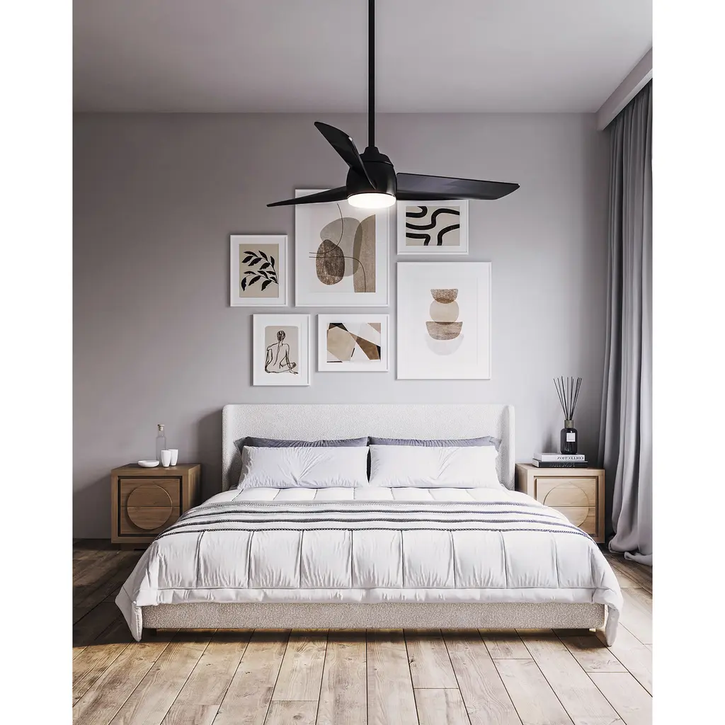 Elevate your decor with the Thalia Fan, where customization meets contemporary elegance. With a wide array of finish options, you have the freedom to mix and match to suit your style. Choose between a sleek black, brushed gold, or brushed nickel body, and complement it with matte black or matte white blades. Thalia offers both a down rod fan and a ceiling flush mount fan option to seamlessly integrate into your space. Experience the future of comfort with smart fan technology, effortlessly controlled through the Smart by Bond app or the included handheld remote. Enjoy six adjustable speeds, a convenient reverse function for year-round comfort, and the ability to set the perfect ambiance with dimming capabilities down to 10% light emission.