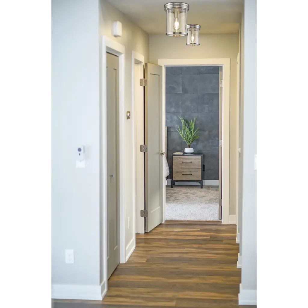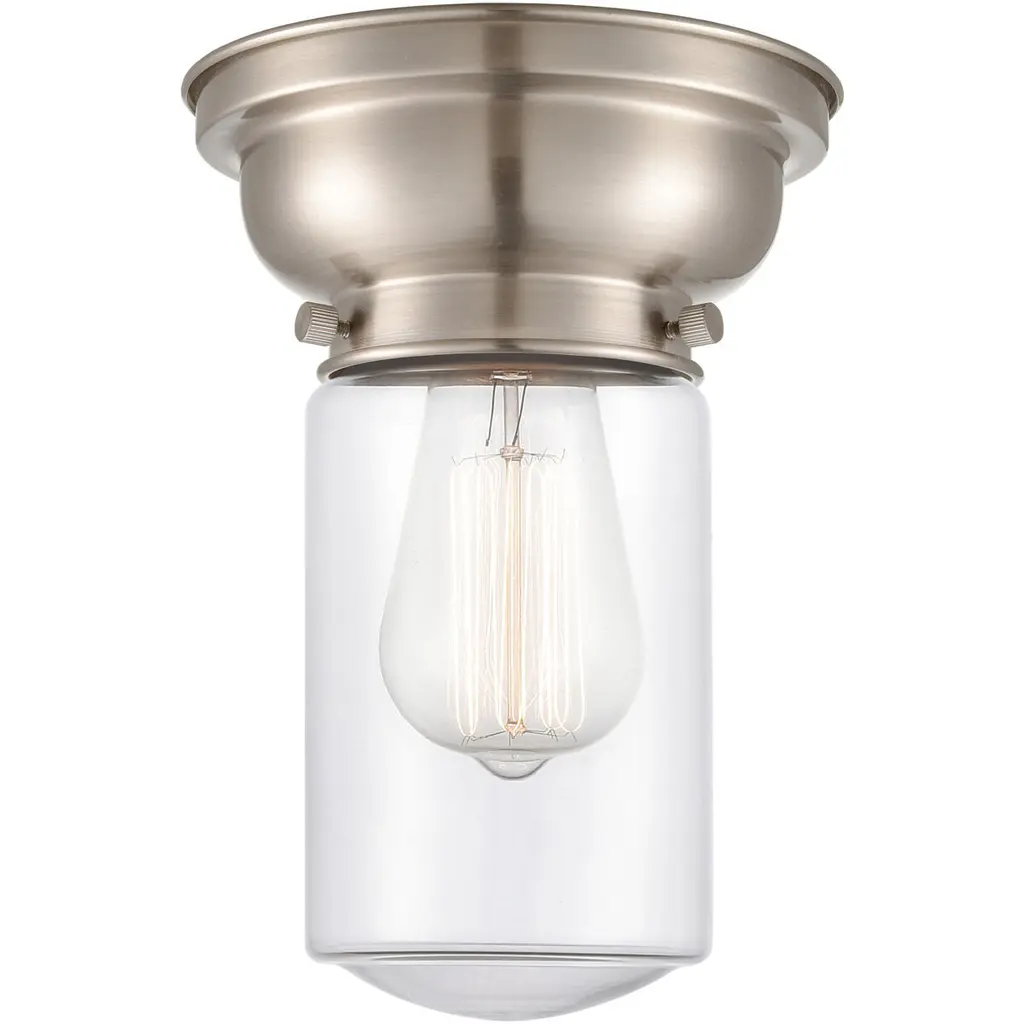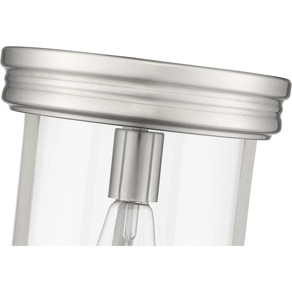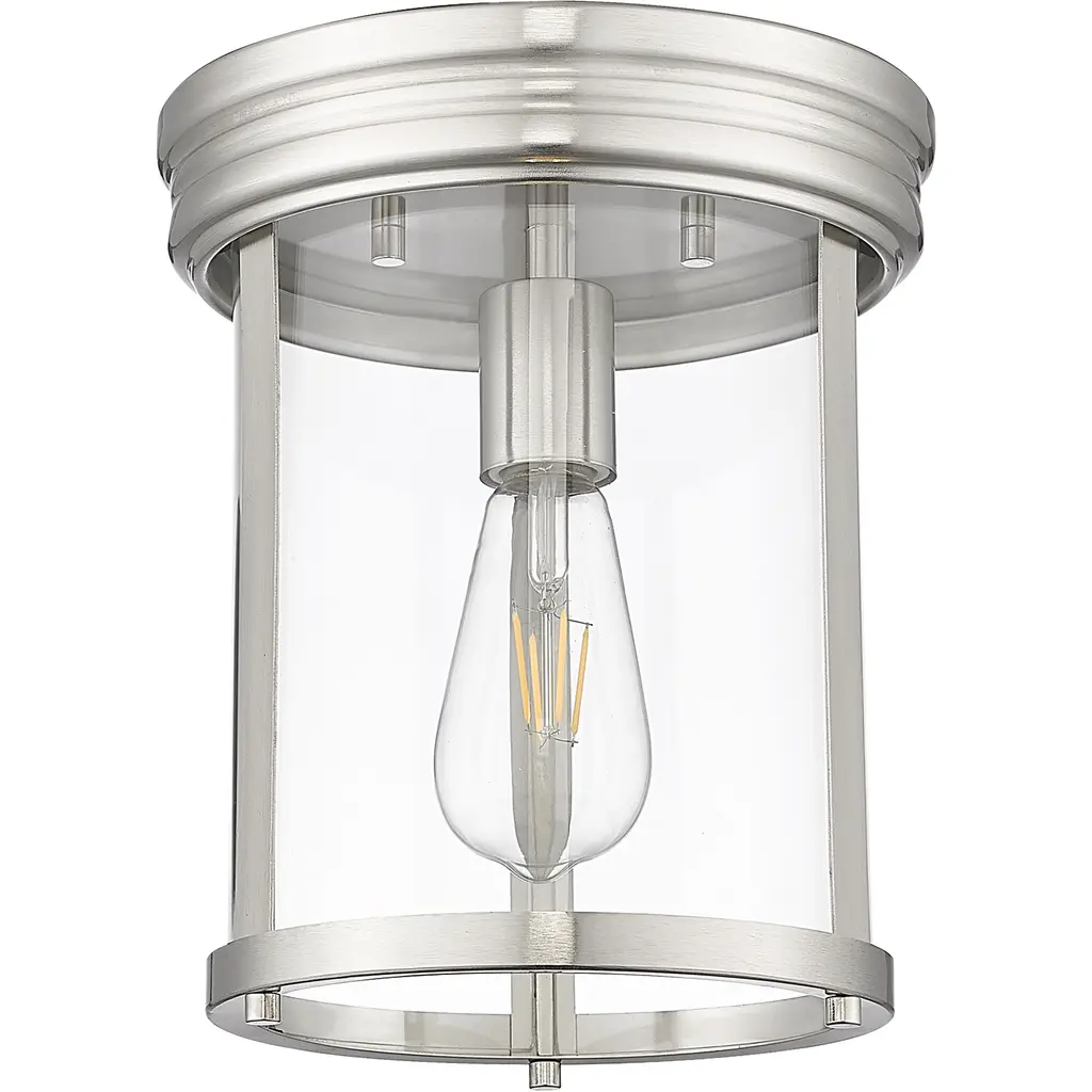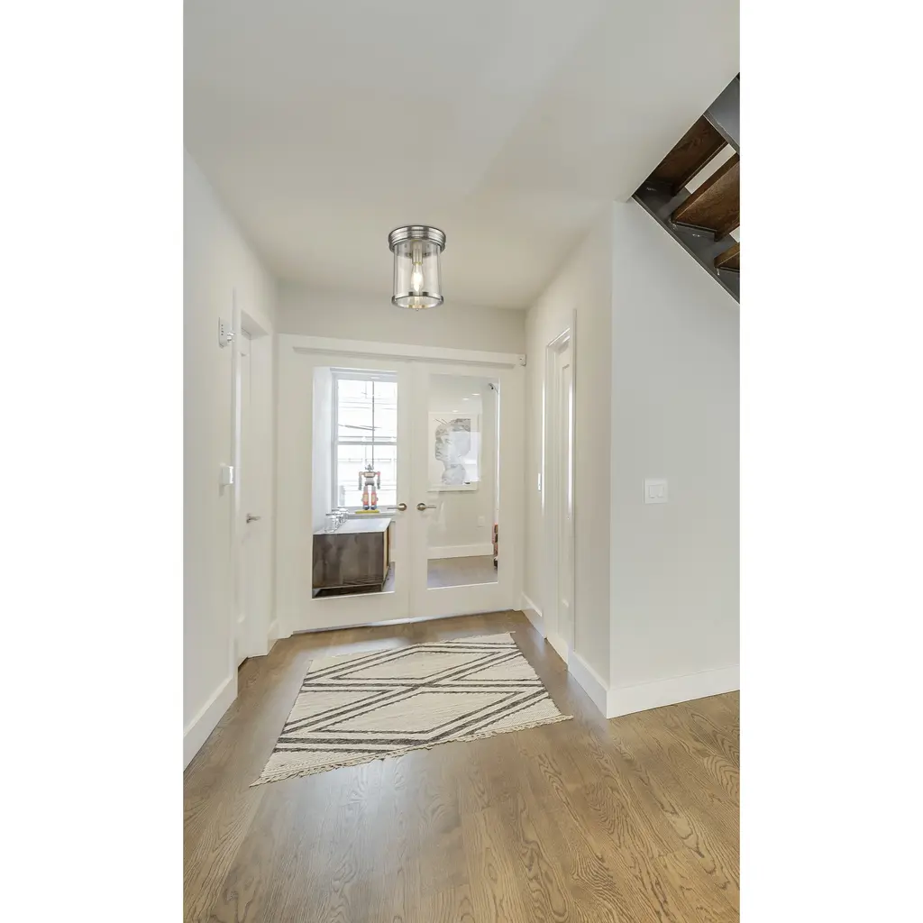 Embrace sleek style with the minimalist silhouette of a modern one-light flush mount ceiling light. From the Thayer collection, it pairs a cylinder of clear glass with a sleek brushed nickel finish and installs at the ceiling for maximum versatility in bedrooms, halls and other living areas.