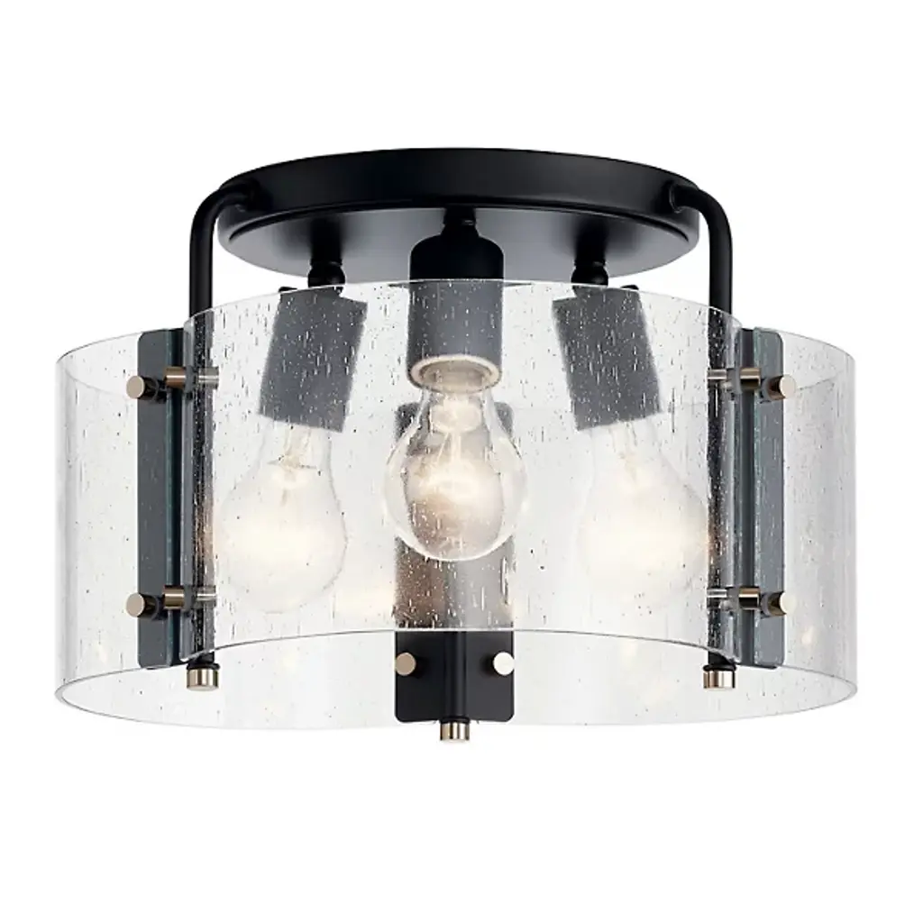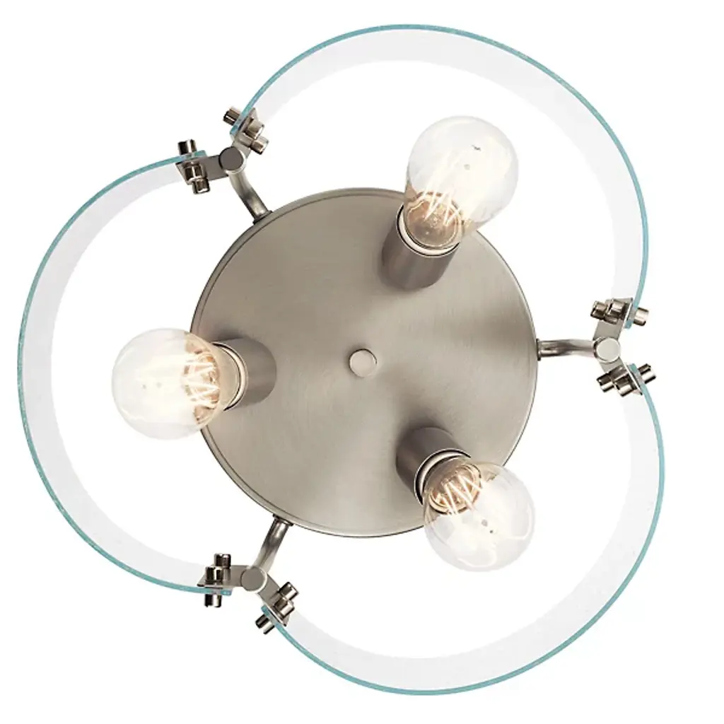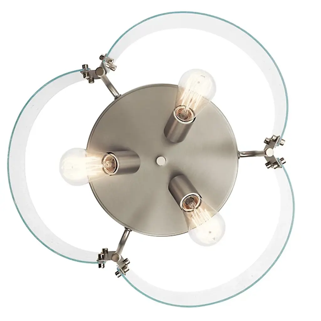 The Thoreau Flushmount from Kichler graces bedrooms or living rooms with exquisite glass, reminiscent of a window on a cozy and drizzly afternoon. A bold metal canopy frames the curving design with a clean circular shape, bending arms stream down, doubling as brackets for its panels of glass. Two separate arches of clear glass come together for a chic contour as seen from below, accented by a sophisticated seeded texture. Clear incandescent bulbs give the piece a wondrous quality as they glow brilliantly in a scrabbling filamented design.