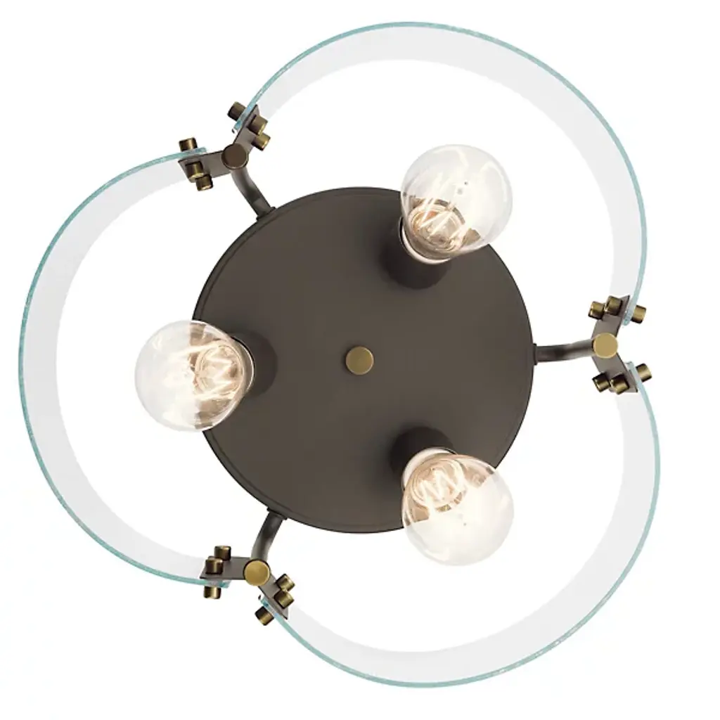 The Thoreau Flushmount from Kichler graces bedrooms or living rooms with exquisite glass, reminiscent of a window on a cozy and drizzly afternoon. A bold metal canopy frames the curving design with a clean circular shape, bending arms stream down, doubling as brackets for its panels of glass. Two separate arches of clear glass come together for a chic contour as seen from below, accented by a sophisticated seeded texture. Clear incandescent bulbs give the piece a wondrous quality as they glow brilliantly in a scrabbling filamented design.