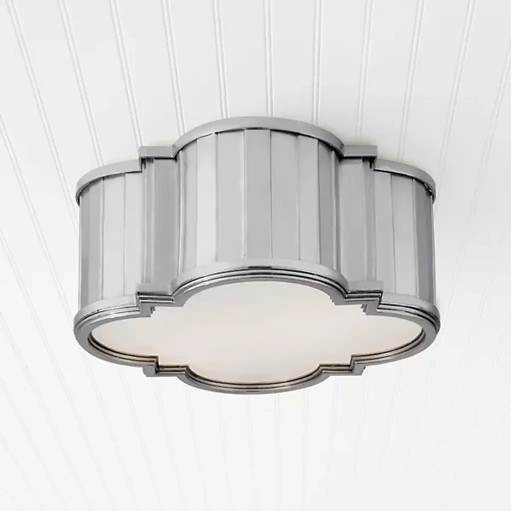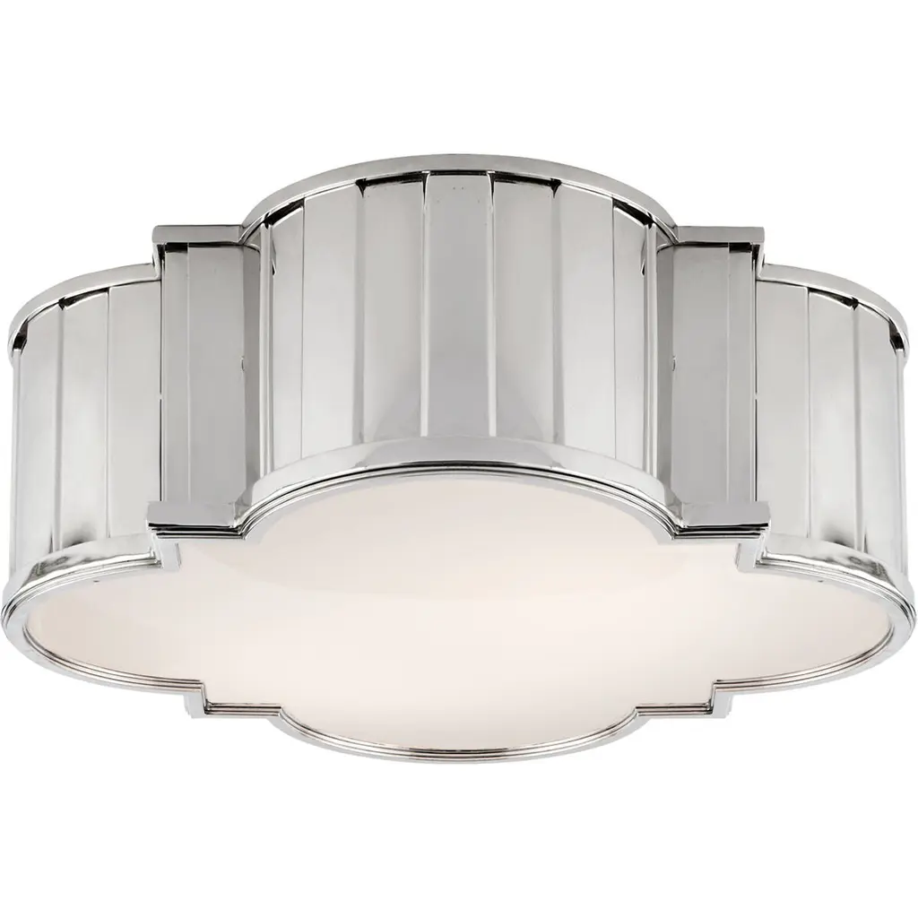 With its decorative design and warm ambient lighting, the Tilden Small Flushmount by Visual Comfort Signature, formerly known as Visual Comfort, creates a refined atmosphere for any interior space. Sculpted metal framework takes center stage, wrapping around a White glass diffuser in a visually compelling pattern. The lighting provided is soft and even, playing beautifully off the frame for a compelling contrast of seamless and faceted surfaces.