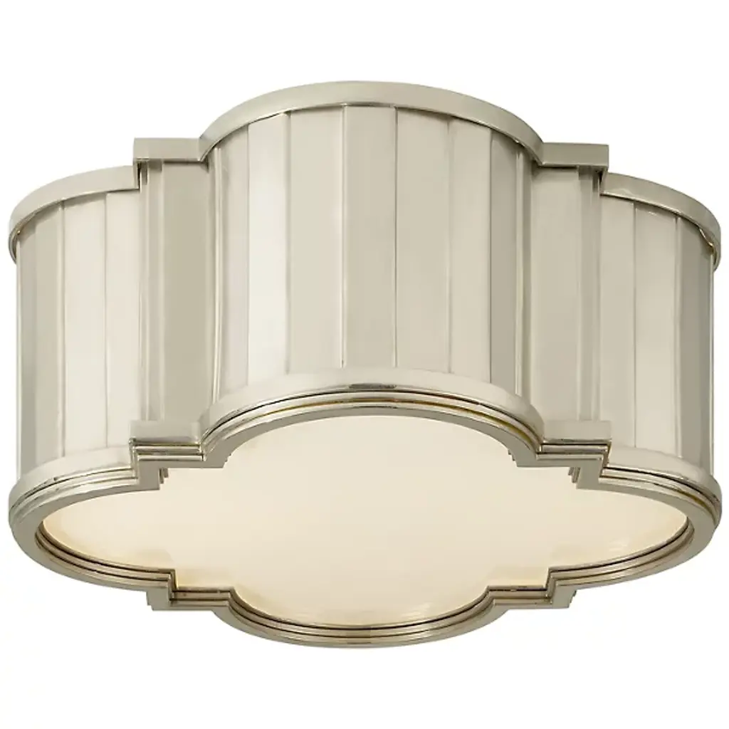 With its decorative design and warm ambient lighting, the Tilden Small Flushmount by Visual Comfort Signature, formerly known as Visual Comfort, creates a refined atmosphere for any interior space. Sculpted metal framework takes center stage, wrapping around a White glass diffuser in a visually compelling pattern. The lighting provided is soft and even, playing beautifully off the frame for a compelling contrast of seamless and faceted surfaces.