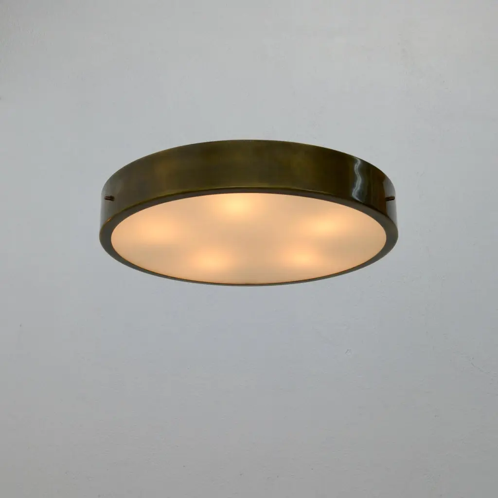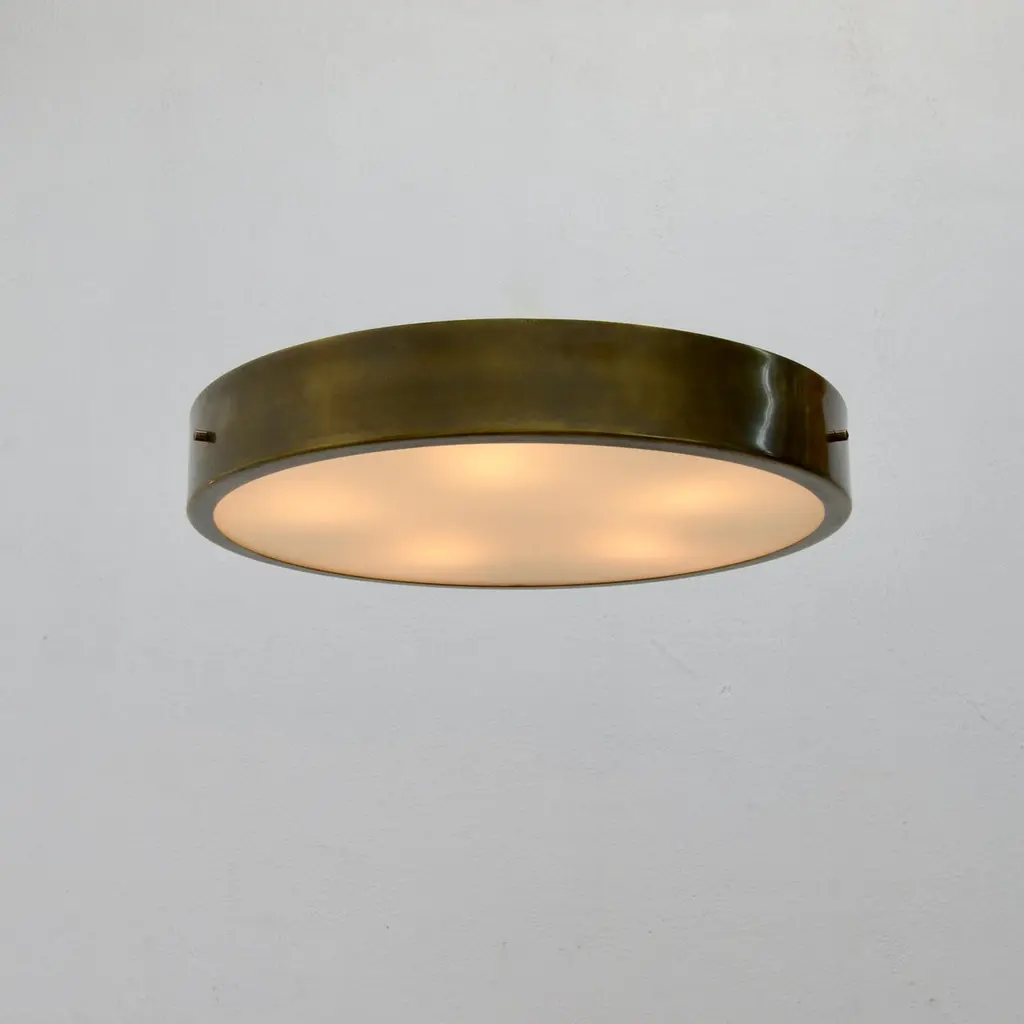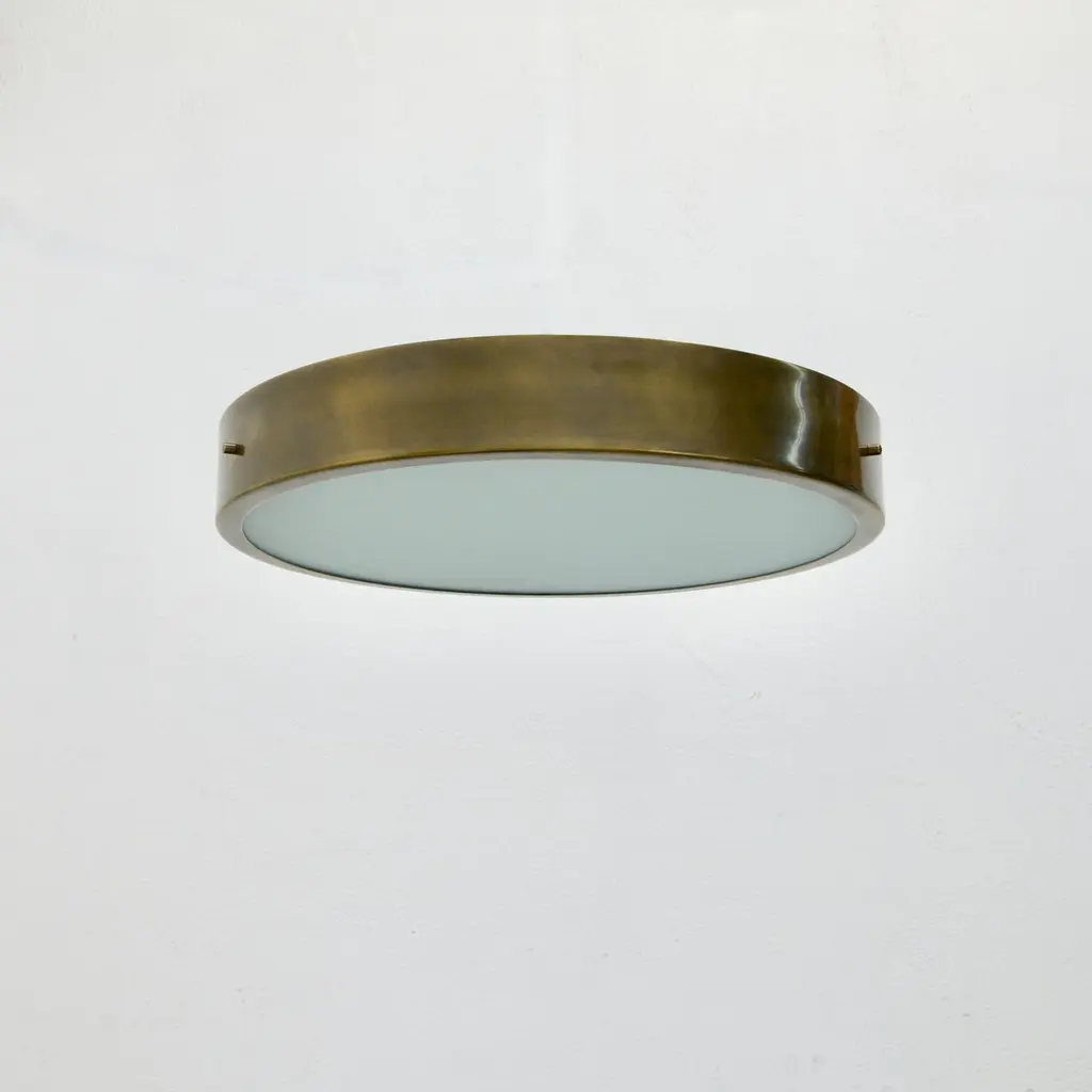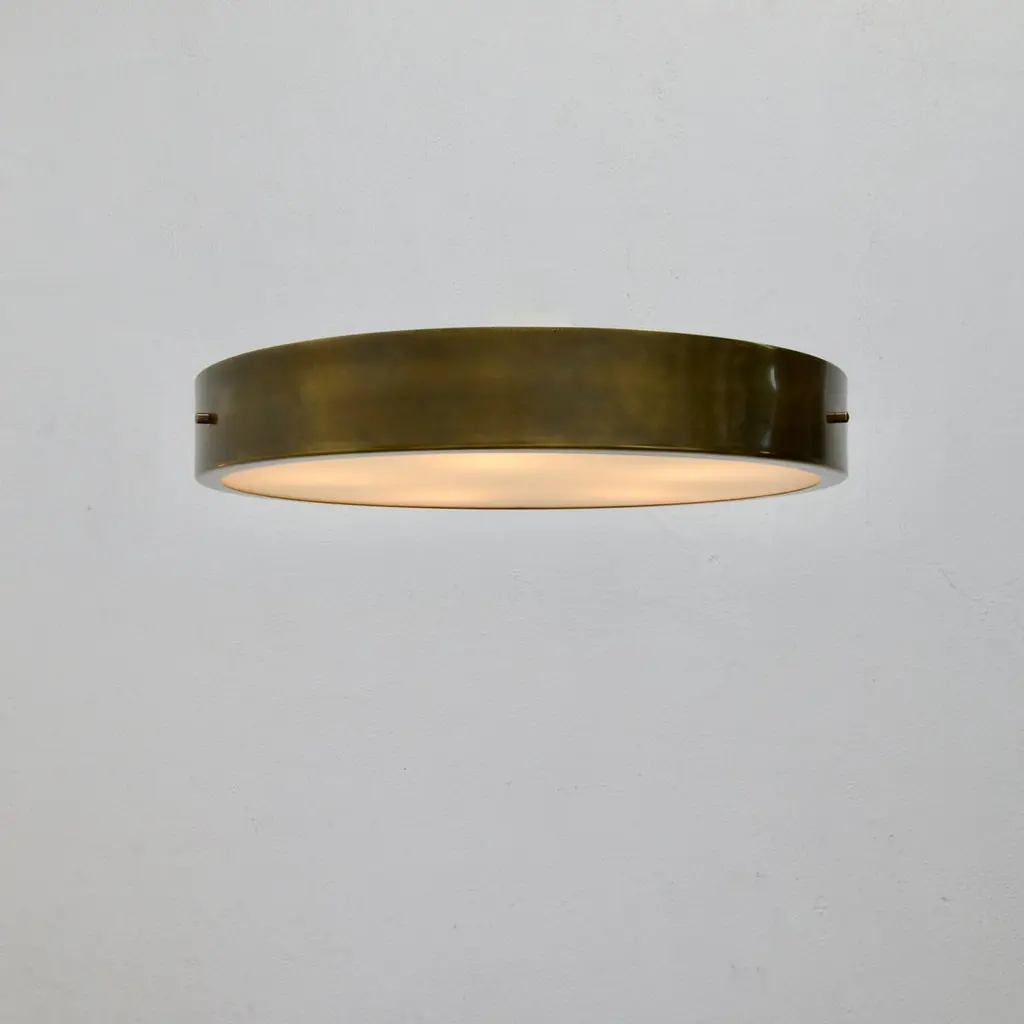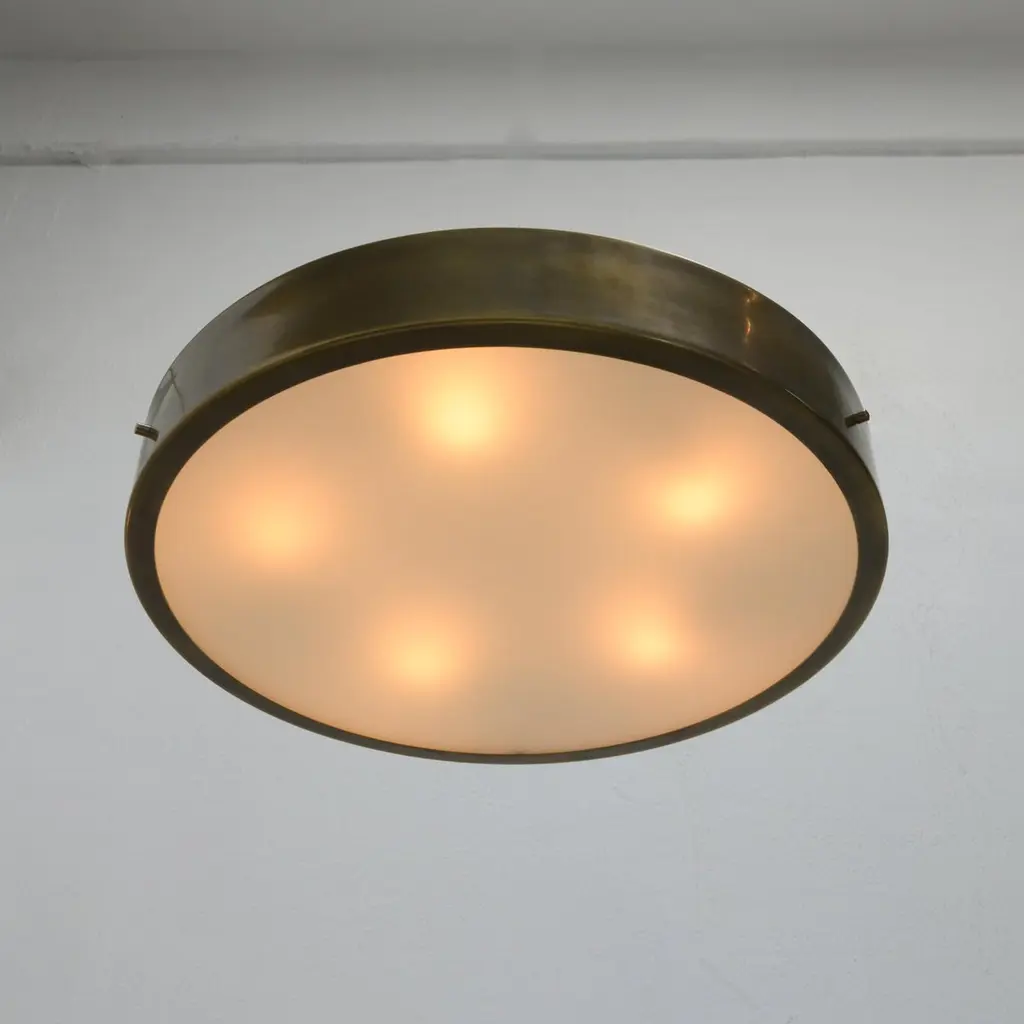 TLUnnel is a simple effective circular flush mount design. Modern in nature yet Classic vintage light source set up. Made in brass, aluminum and glass. Also available in satin aged nickel finish. Wired with 5-E26 medium based sockets (24") and can also be wired for use anywhere in the world. Light bulbs and mounting hardware included with order. order. Made to order. We offer 4 sizes: 10", 18”, 20” and 24”. 24” and 10” pictured. Quantity of lightbulbs vary depending on diameter. Measurements:Height: 4.25Width: 10" ($1940), 18" ($2400) , 20" ($2650) or 24” ($3200).
