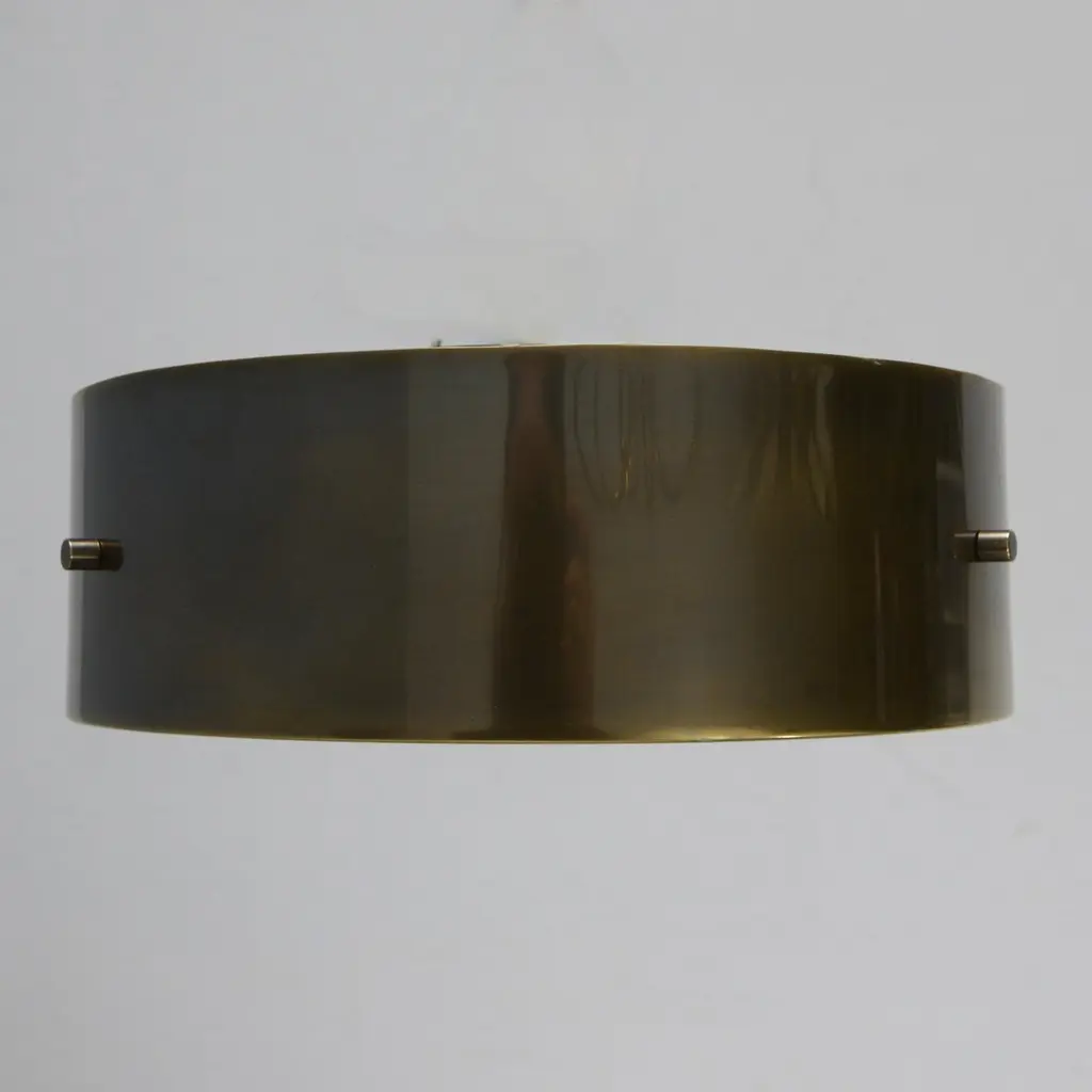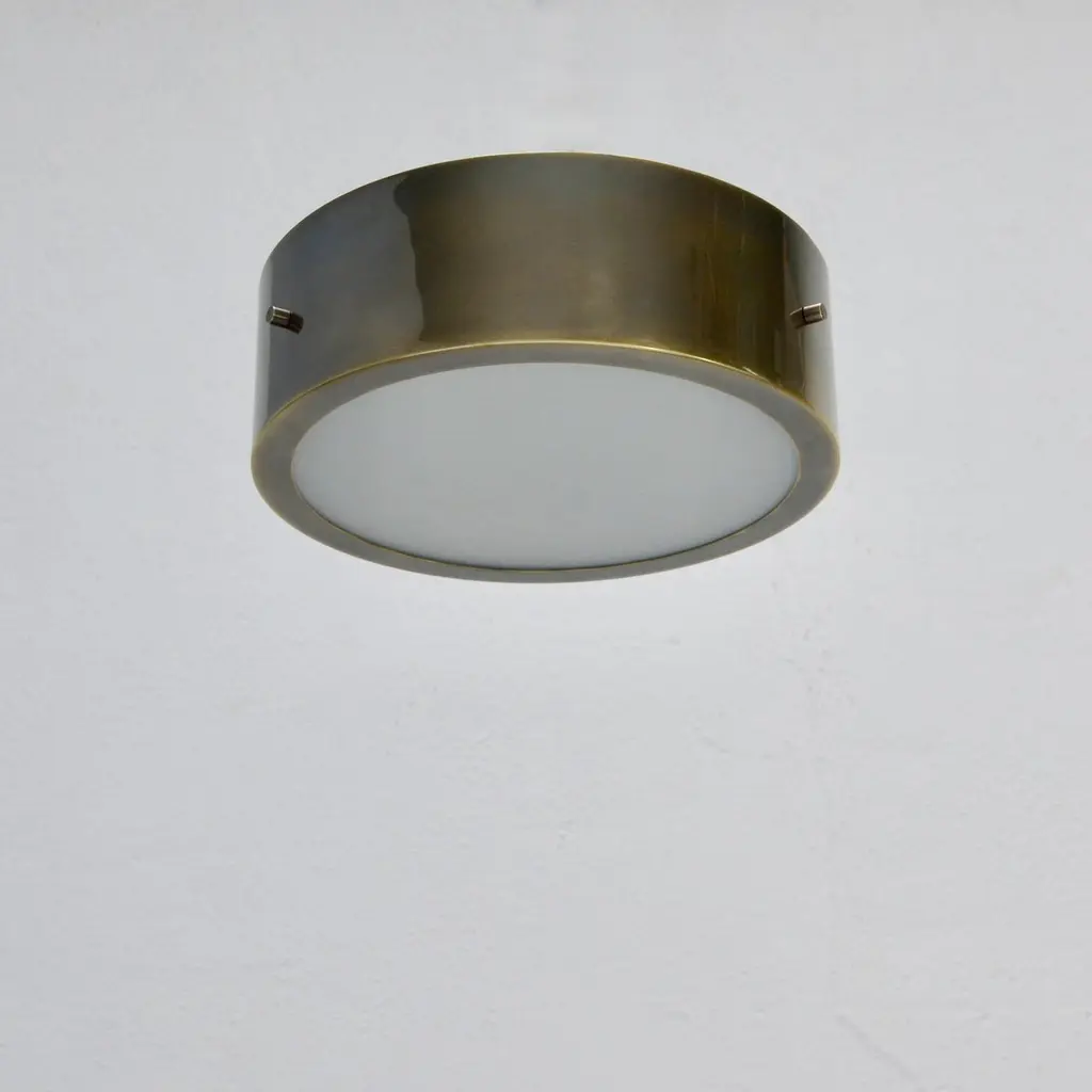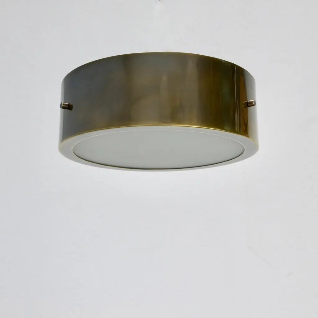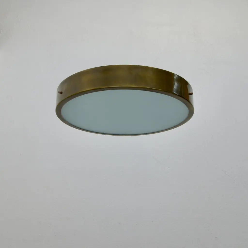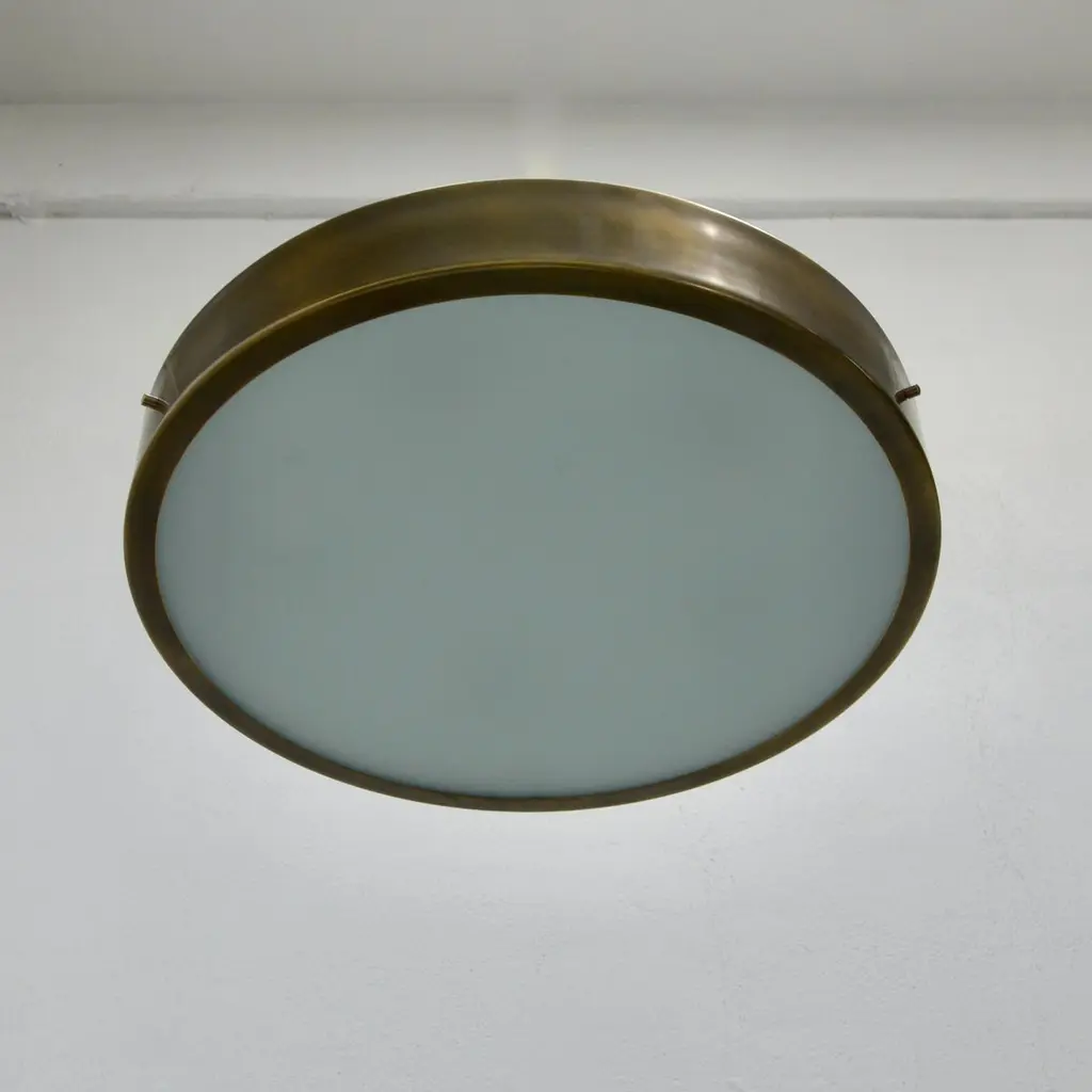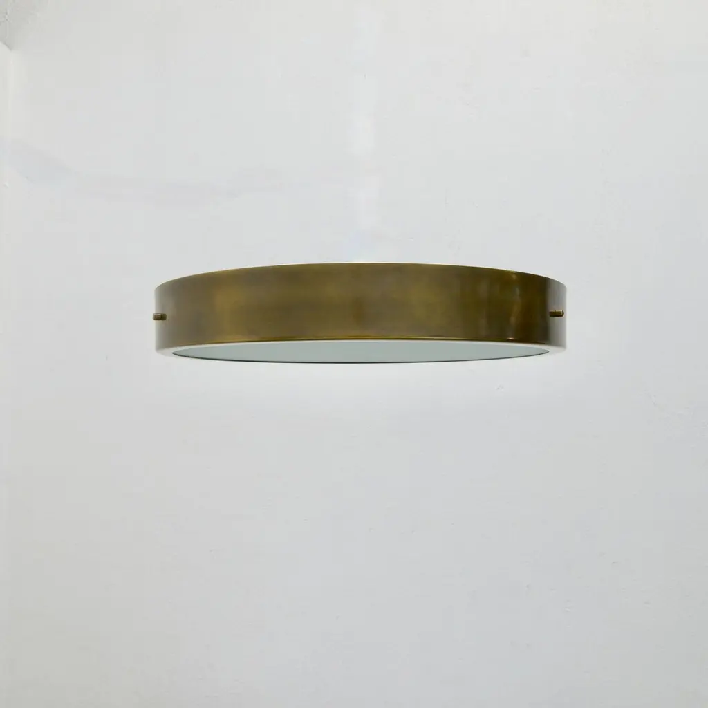 TLUnnel is a simple effective circular flush mount design. Modern in nature yet Classic vintage light source set up. Made in brass, aluminum and glass. Also available in satin aged nickel finish. Wired with 5-E26 medium based sockets (24") and can also be wired for use anywhere in the world. Light bulbs and mounting hardware included with order. order. Made to order. We offer 4 sizes: 10", 18”, 20” and 24”. 24” and 10” pictured. Quantity of lightbulbs vary depending on diameter. Measurements:Height: 4.25Width: 10" ($1940), 18" ($2400) , 20" ($2650) or 24” ($3200).
