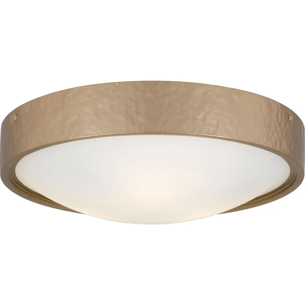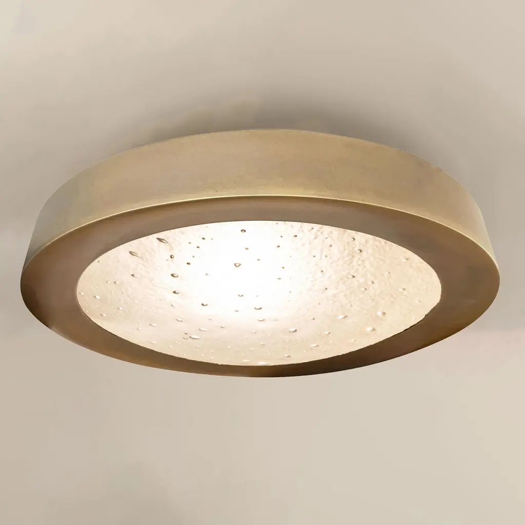 The Tondo Grande flush mount was designed to elavate smaller and low clearance spaces with its 4” drop. The concave bevel holding the convex Murano glass shade and its offset stance make it a highly sculptural piece despite its size. Shown in our Ottone Nuvolato finish with Murano Bubble glass. See the standard Tondo for the smaller 12” version.Starting at $ 3,600 for standard finishes.Starting at $ 3,900 for premium finishes.Customization Options: Available in any of our 10 finishes and 8 enamel colors. Compatible with our Murano bubble glass and Murano frosted glass. Custom sizes available on request.Lead Time: 10-12 weeks plus shipping.Diameter: 18”Height: 4” (Custom drops on request)Electrical: Three E12 75W incandescent or 100W + LED equivalentModel#: LTZ818.