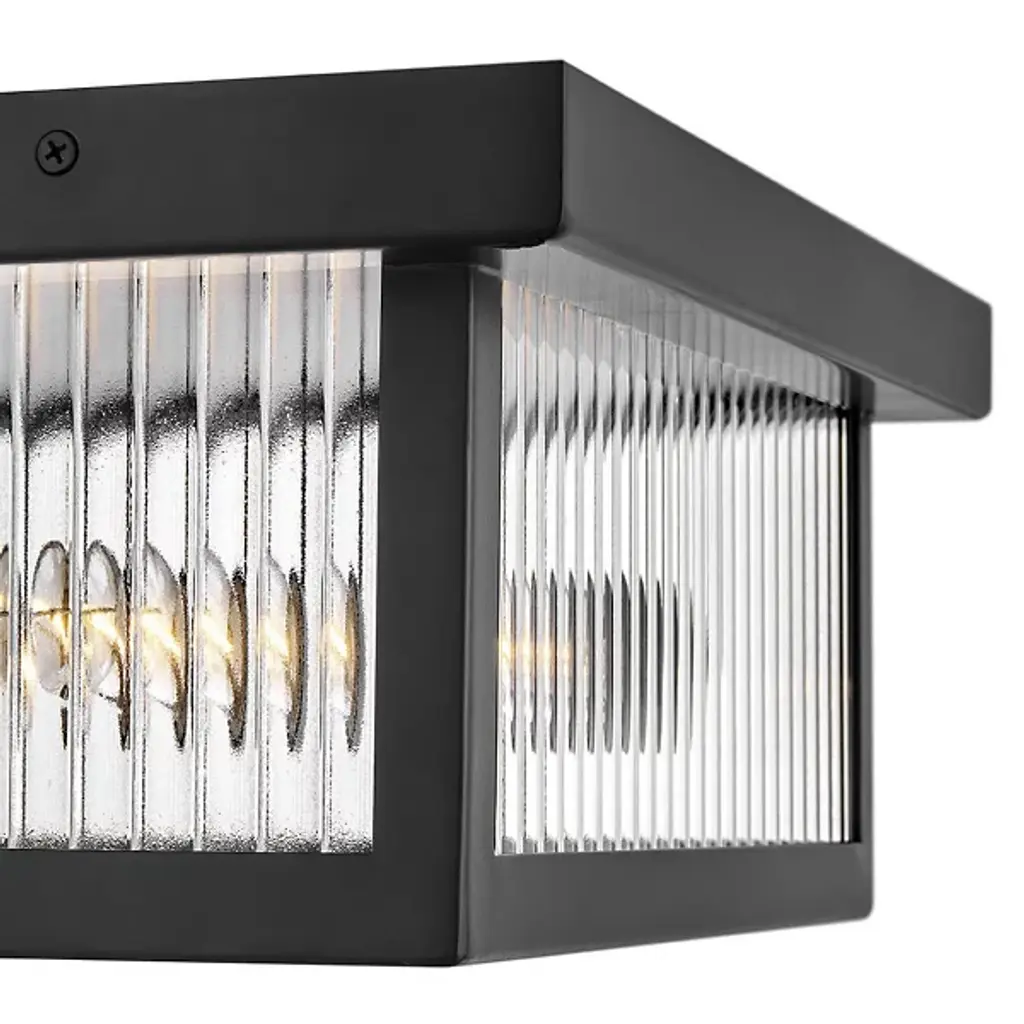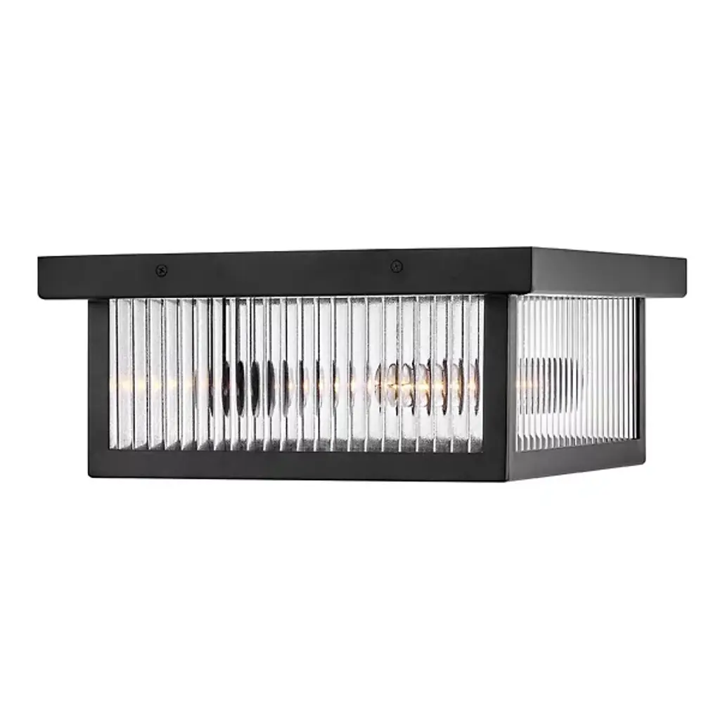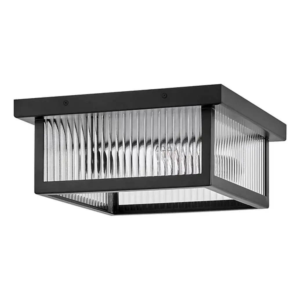 The Torrent Outdoor Flushmount from Hinkley takes a modern approach with clear ribbed glass panels set within a rectangular aluminum frame. Vertical ridges run across the glass surface, bending and scattering light as it passes through to create linear patterns on surrounding surfaces. The close-to-ceiling design keeps the profile low, and the textured glass transforms standard illumination into something more dynamic. Aluminum construction provides the structural framework, while the ribbed glass handles both diffusion and visual interest within this compact ceiling-mounted fixture.