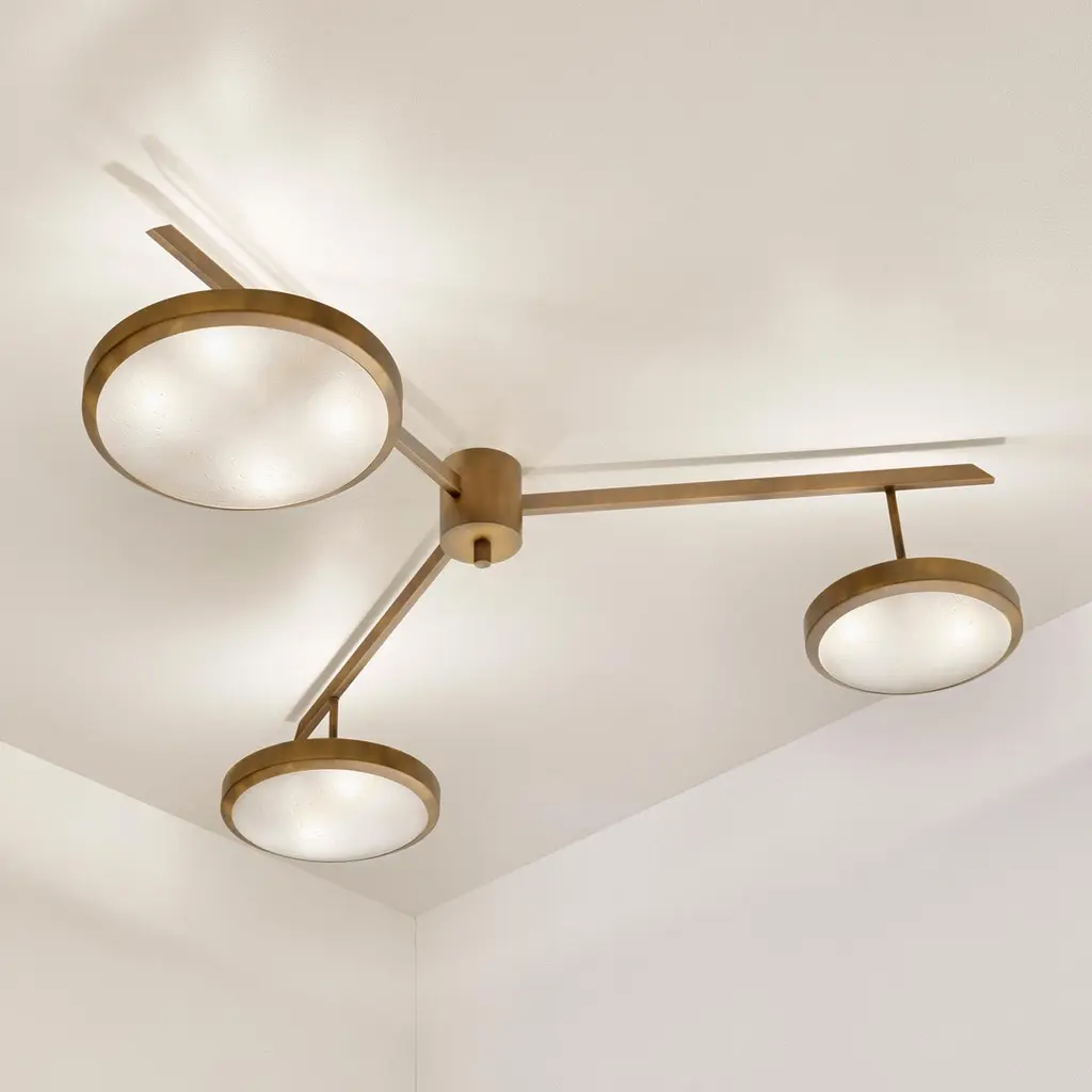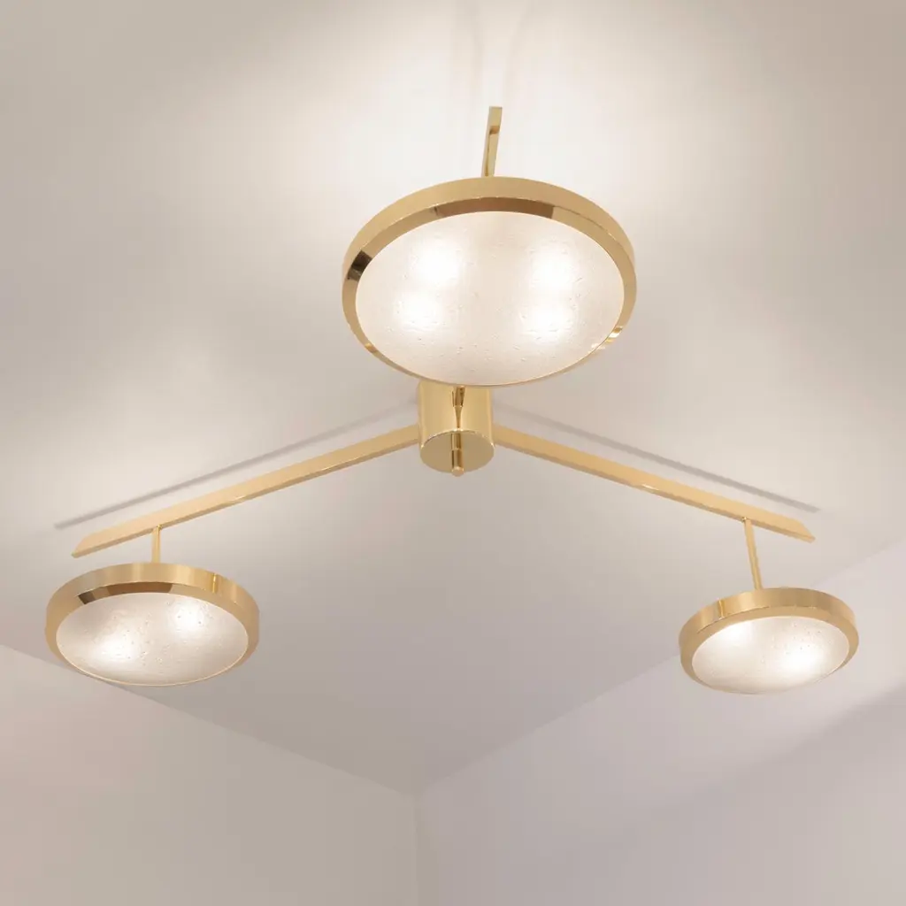 The Tre ceiling light harmoniously juxtaposes the balance of its three evenly spaced arms with the asymmetry of its variable size shades staggered at different heights. The first images show the fixture in our polished nickel finish-subsequent pictures show it in a selection of alternative finishes. Starting at $ 9,200 for standard finishes.Starting at $ 9,900 for premium finishes.Customization Options:Each fixture is hand crafted in Italy and can be customized in size, layout and number of shades. Available in any of our 10 finishes and 8 enamel colors. Compatible with our Murano bubble glass and Murano frosted glass. Can be installed as a flush mount or on a stem.Lead Time: 10-12 weeks plus shipping. May be available for quick ship in 6 weeks or under.Diameter: 60”Height: 10”. Overall height can be adjusted as needed. 8” minimum heightElectrical: Eight E12 40W incandescent or 75W LED equivalentModel#: LTZ325