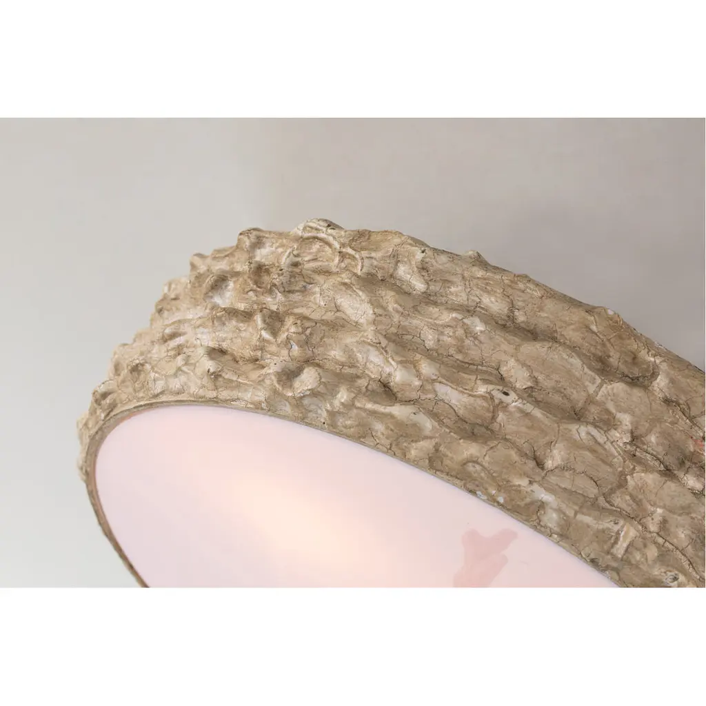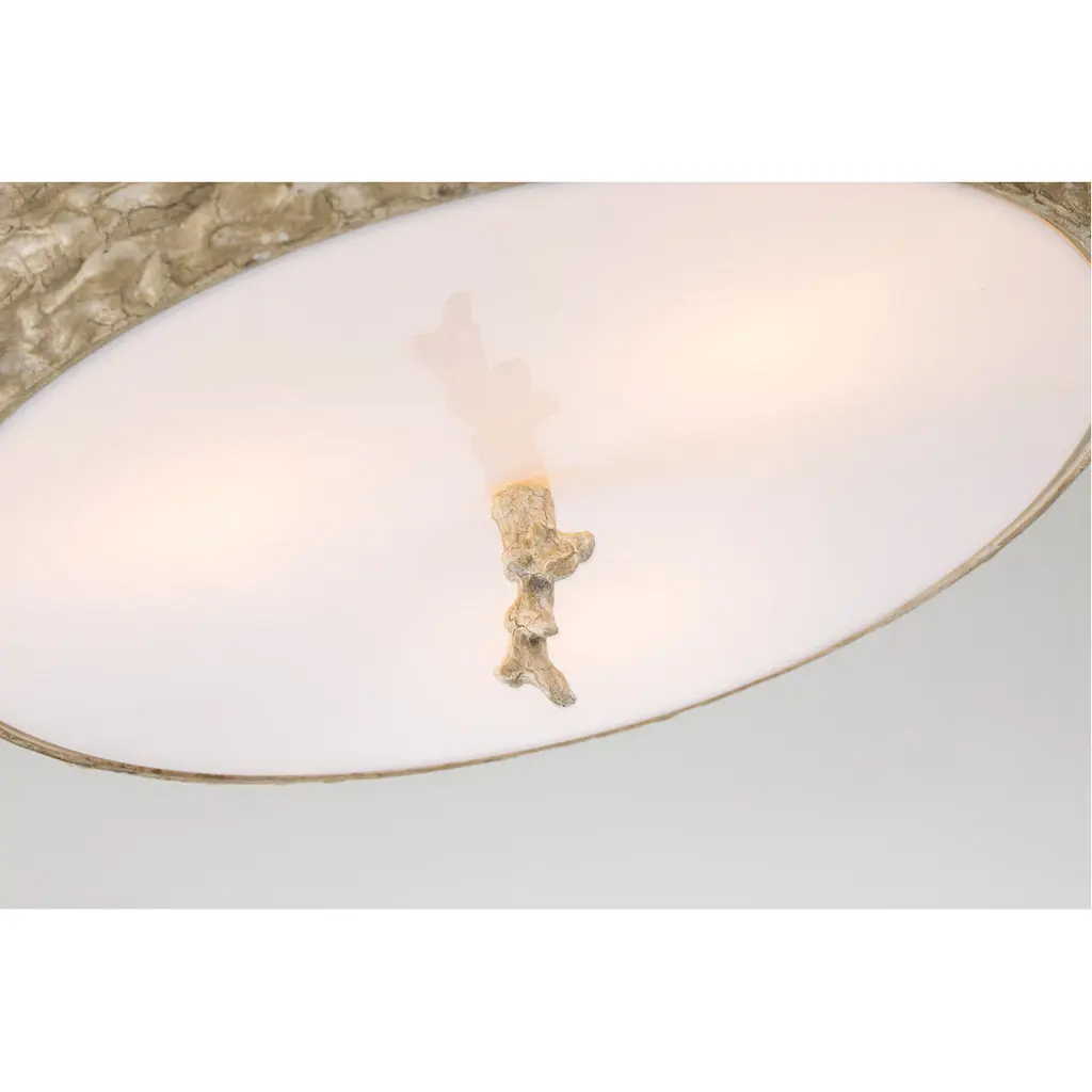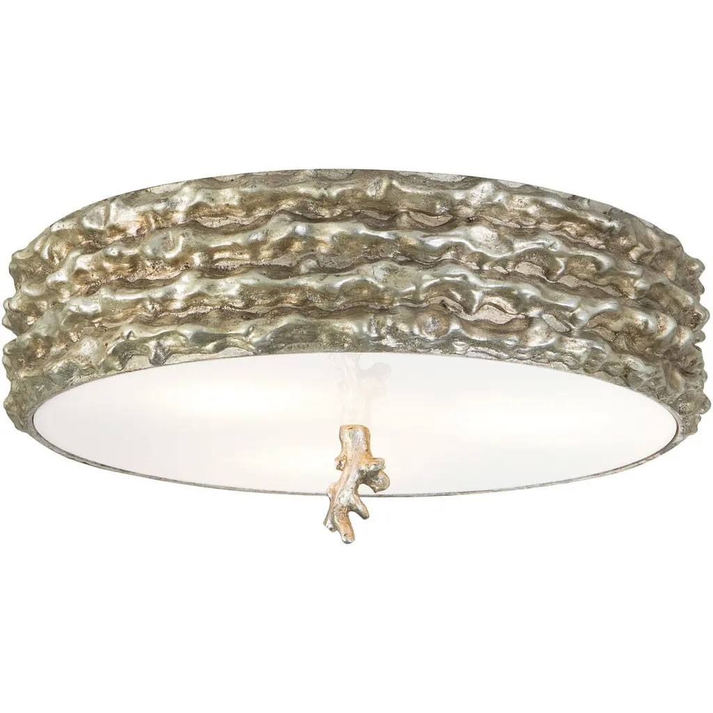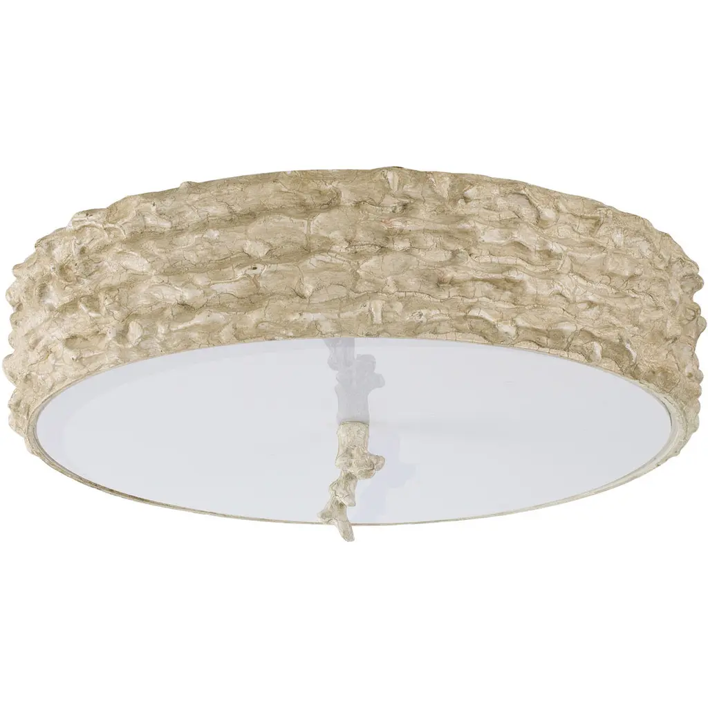 Light up any space in glamorous style with this 16 inch round white and beige flush mount. This sophisticated 3 light ceiling fixture, features a cylindrical hand painted frame that uses texture to create the decorated pattern that is used in our trellis collection. There is depth to this finish, and touches of brown, silver and a little gold are used as accents. Complete with a frosted glass diffusor to spread the light evenly around the space, and a beautifully sculpted finial to add that finishing touch.