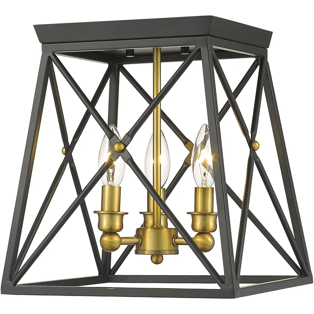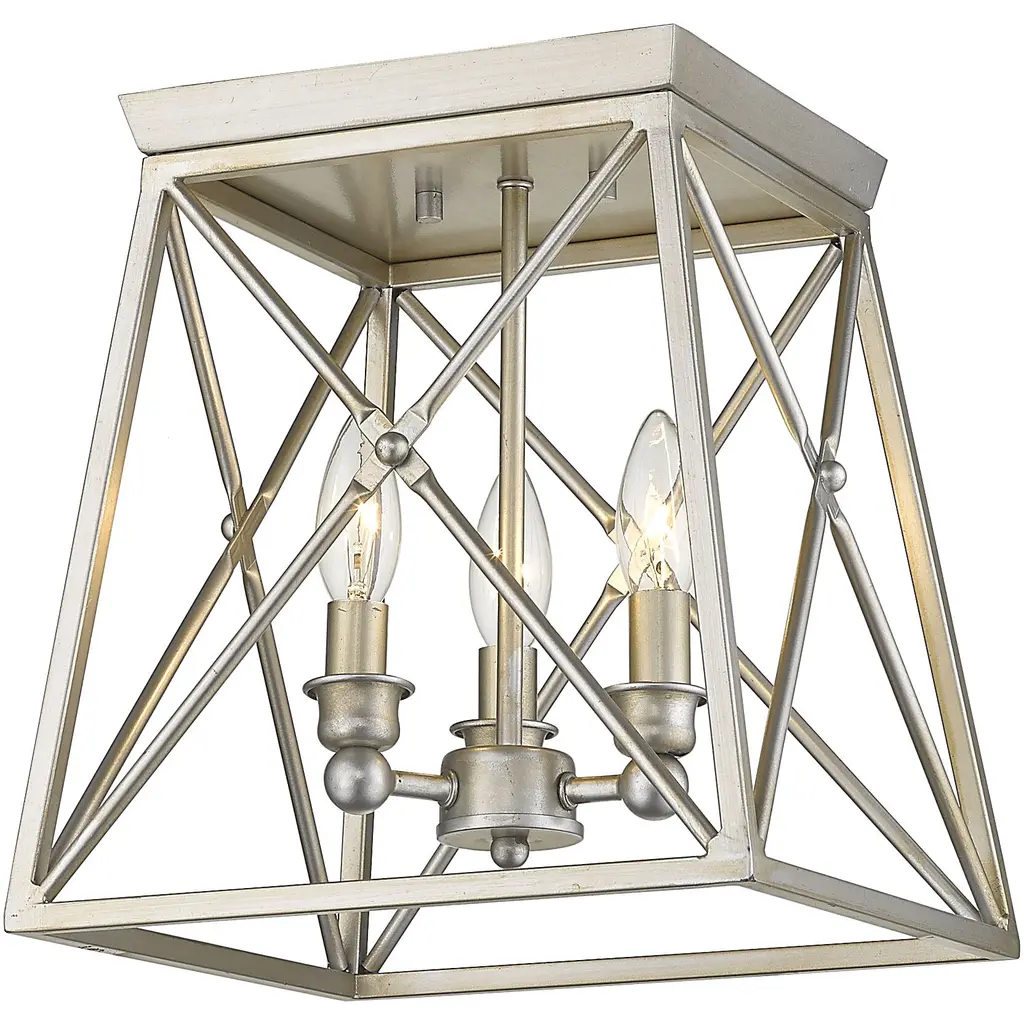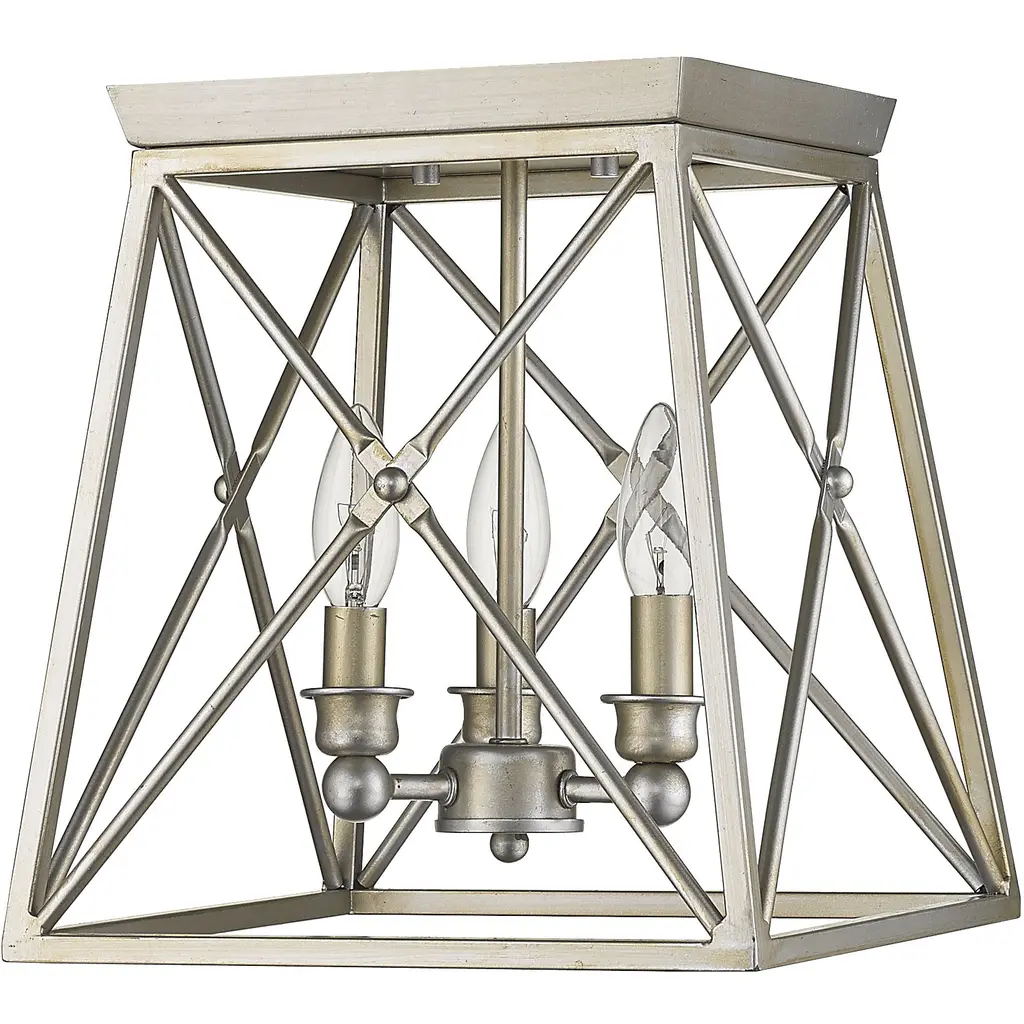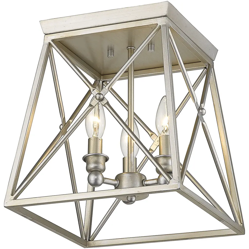 Indulge in an exercise of geometrics and stunning interior decor, adding this three-light flush mount ceiling light to a main living space. An open frame made from Antique Silver finish metal shelters a candelabra mount that softens its angular silhouette, mixing motifs and creating a compelling look.