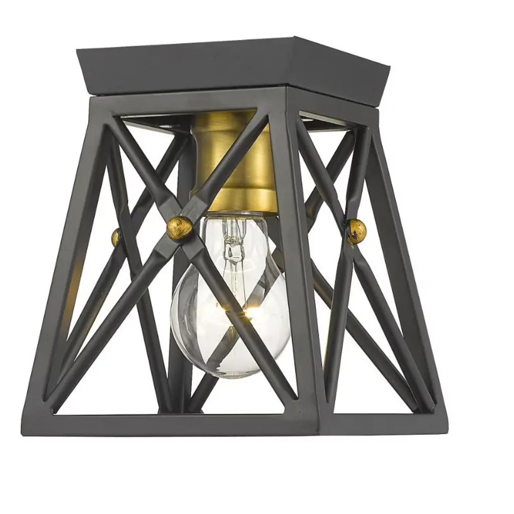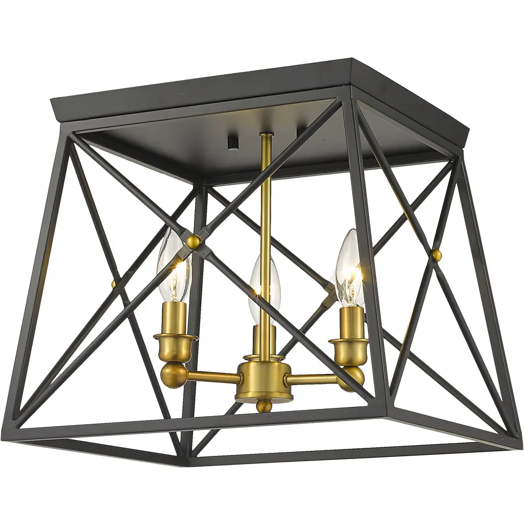 Indulge in an exercise of geometrics and stunning interior decor, adding this three-light flush mount ceiling light to a main living space. A dramatic contrast of Matte Black and rich Old Brass finishes combine in a metal cage shade and bulb mounts, delivering a provocative look for a transitional design motif.
