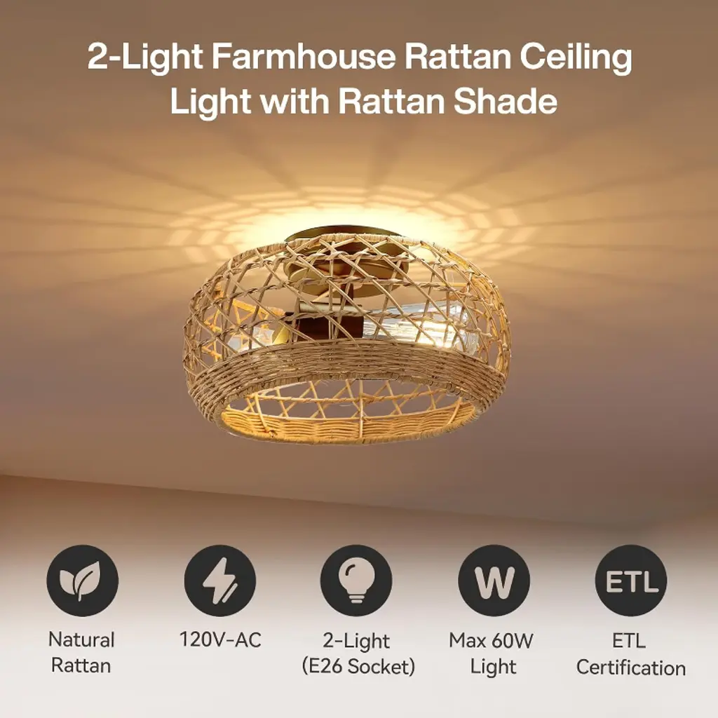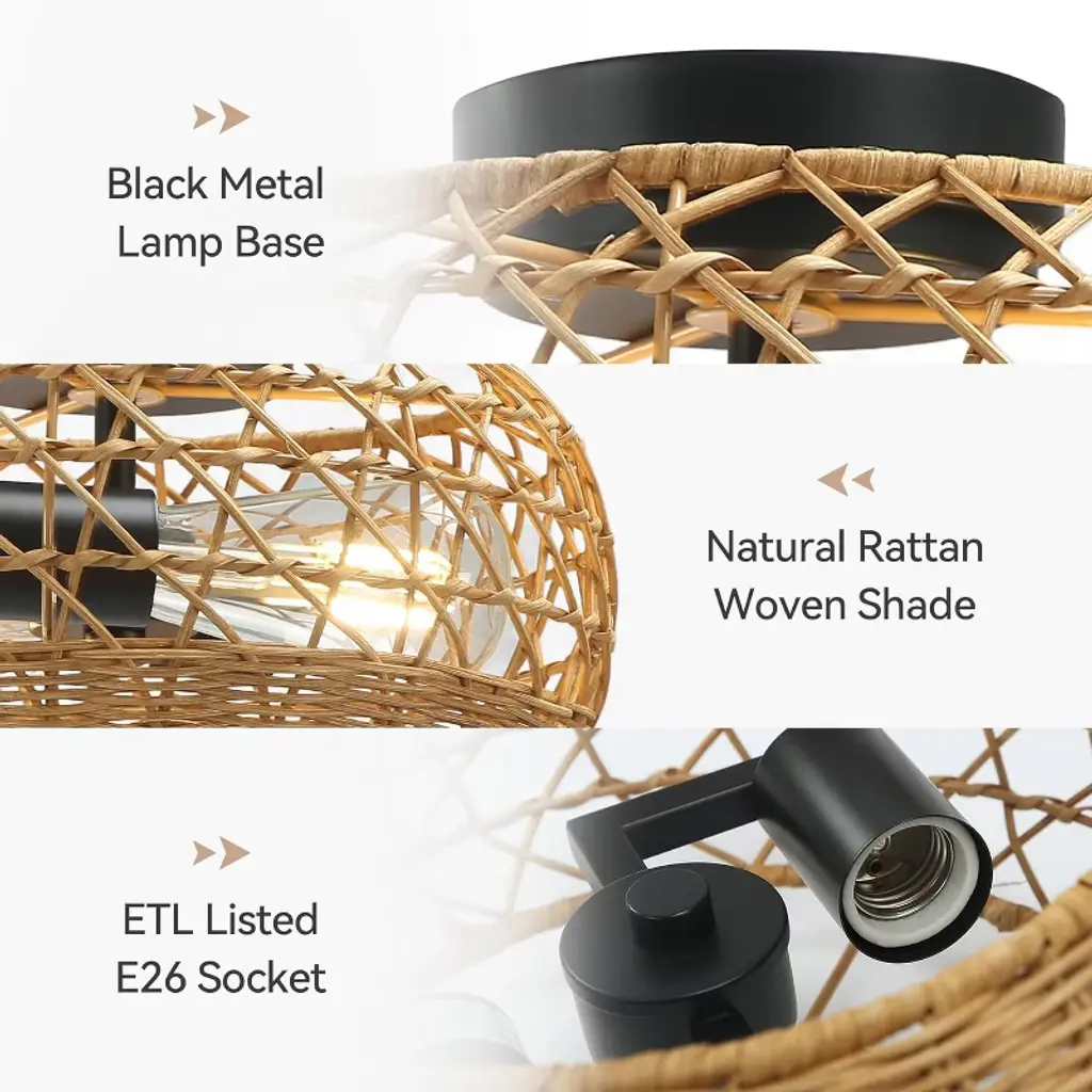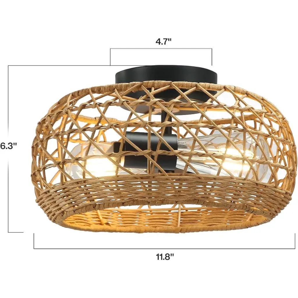 This flush mount ceiling light features a black frame with a rattan shade. The hollow design enables it to emit 360° beautiful light shadow, creating a bohemian atmosphere. It's perfect for creating a warm vibe in your home. This boho flush mount ceiling light is compatible with 2 E26 bulbs (Max. 60W), such as incandescent, LED, CFL and halogen bulbs. You can choose different bulbs depending on the lighting effects you want. Designed to elevate living rooms, bedrooms, dining areas, hallways and home offices, this rattan chandelier blends seamlessly into any indoor space.