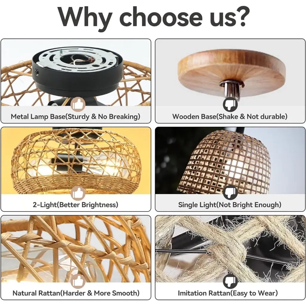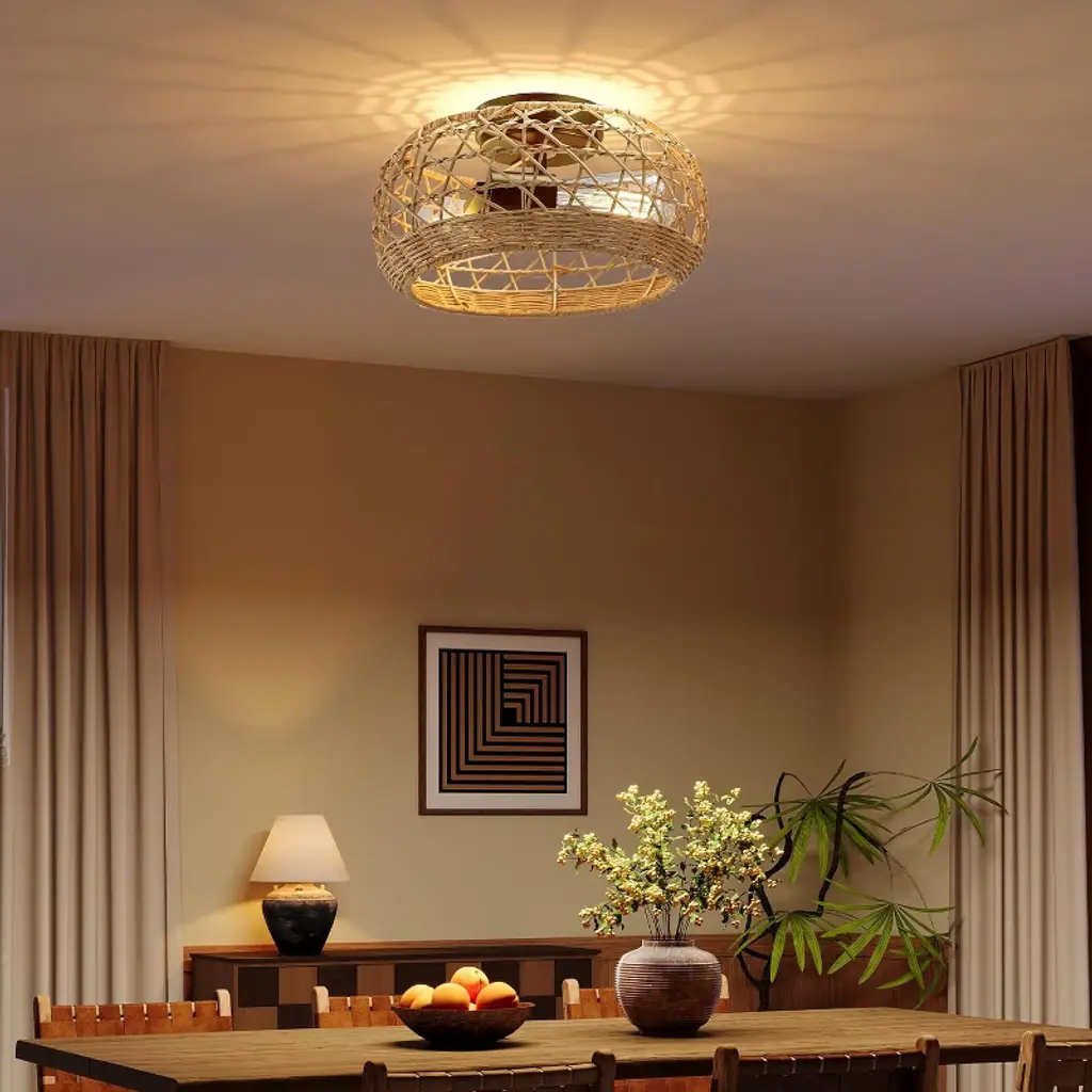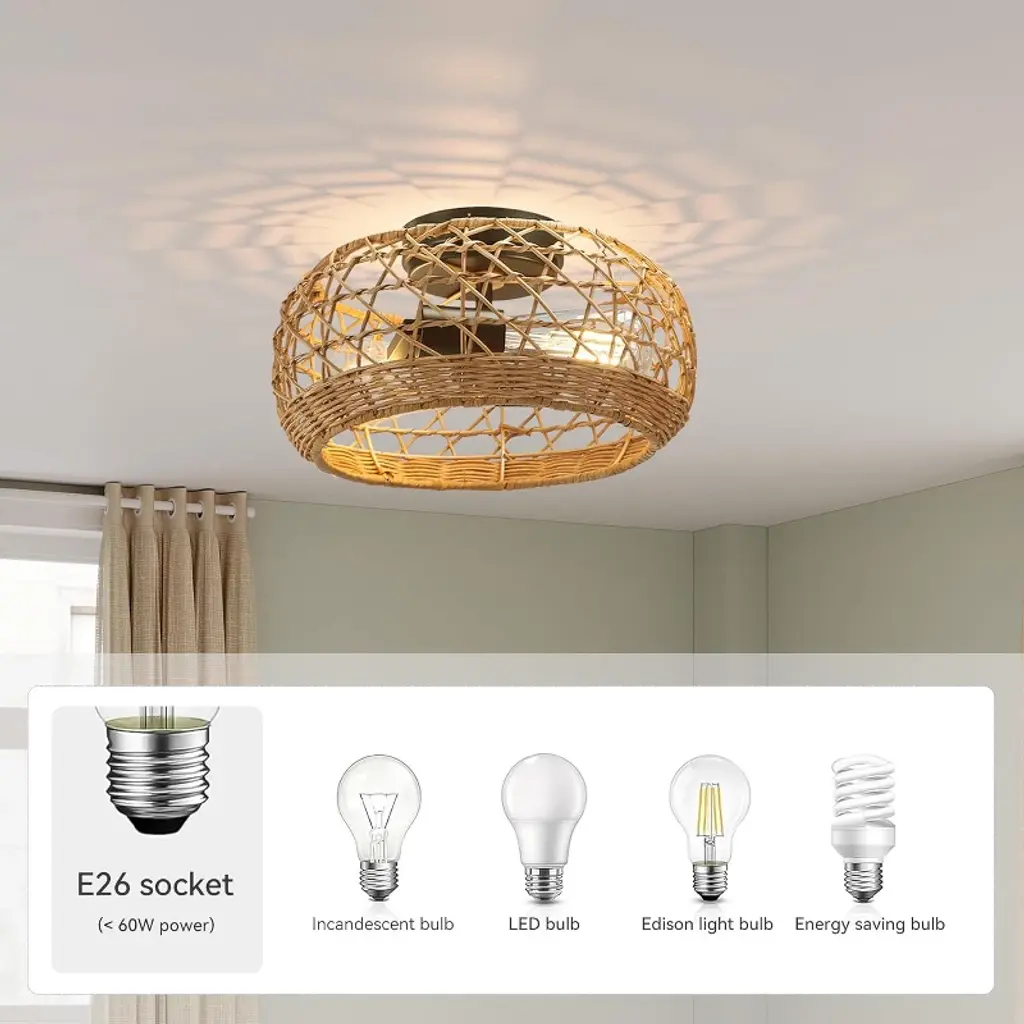 This flush mount ceiling light features a black frame with a rattan shade. The hollow design enables it to emit 360° beautiful light shadow, creating a bohemian atmosphere. It's perfect for creating a warm vibe in your home. This boho flush mount ceiling light is compatible with 2 E26 bulbs (Max. 60W), such as incandescent, LED, CFL and halogen bulbs. You can choose different bulbs depending on the lighting effects you want. Designed to elevate living rooms, bedrooms, dining areas, hallways and home offices, this rattan chandelier blends seamlessly into any indoor space.