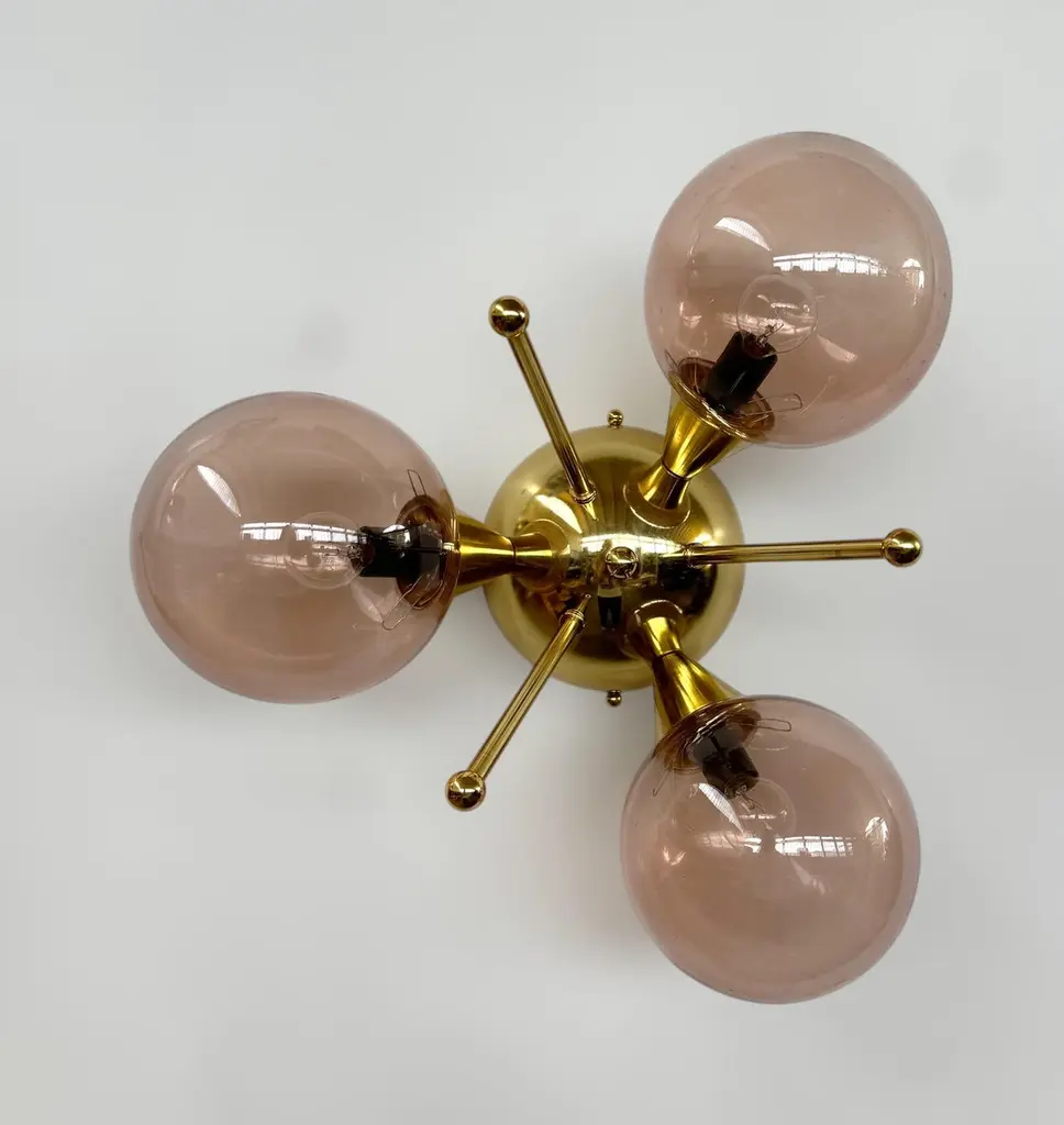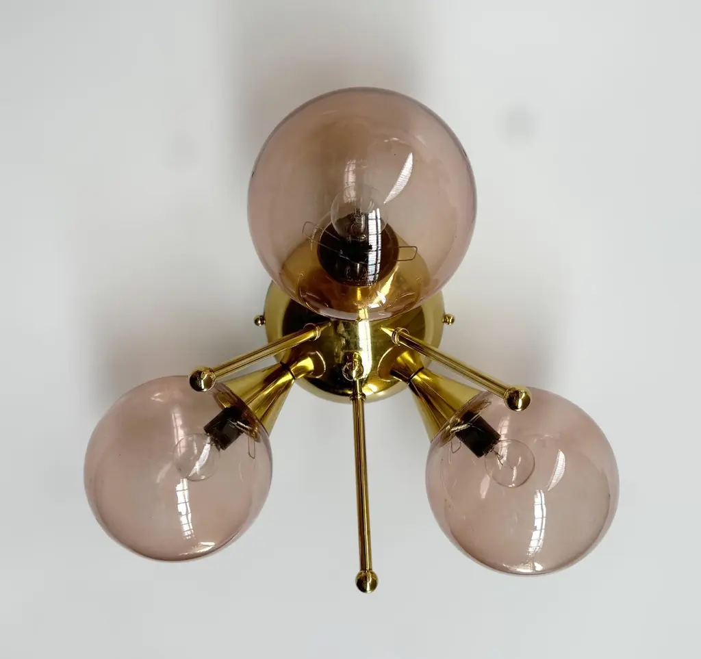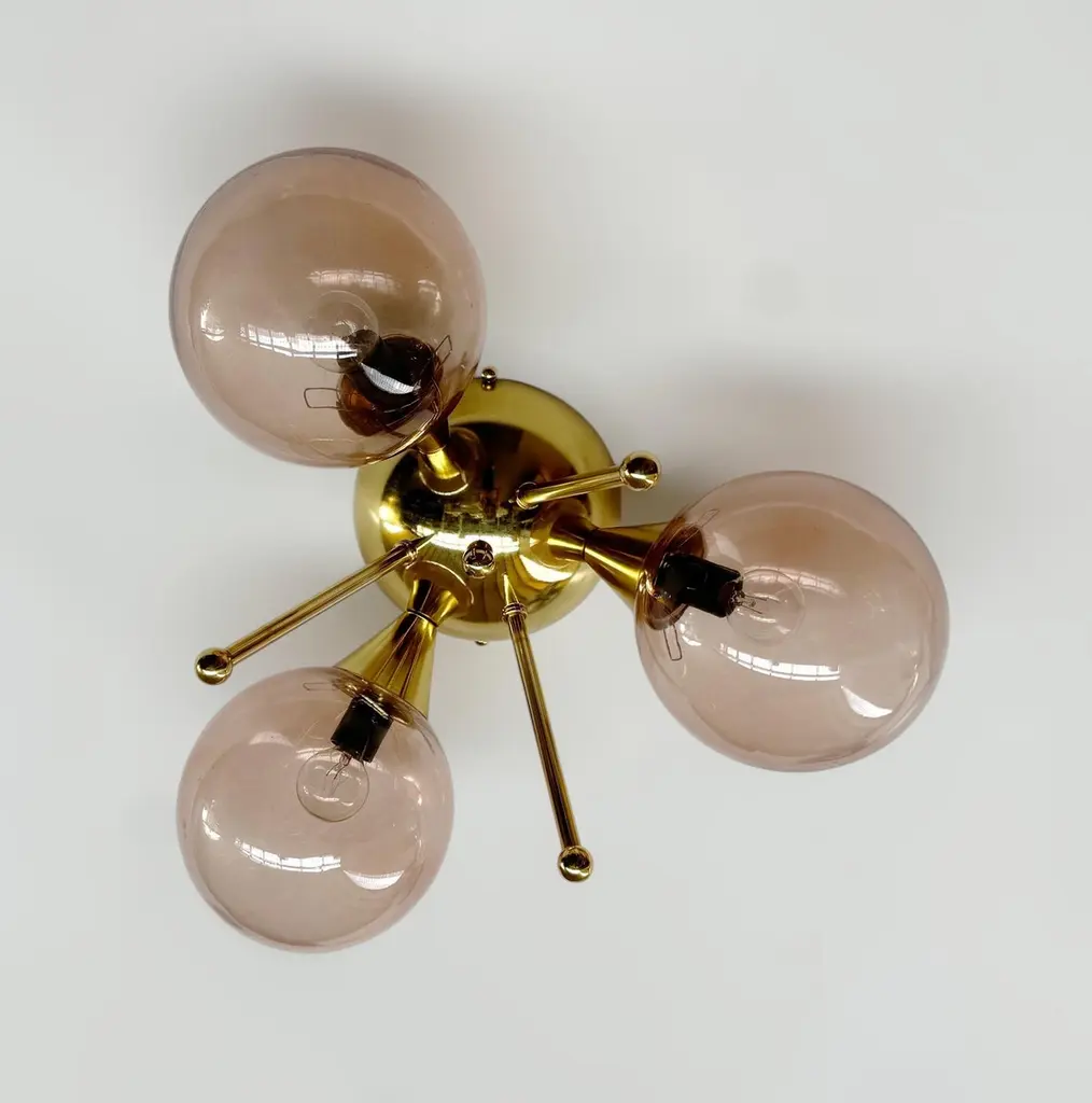 Italian flush mount with 3 Murano glass globes mounted on solid brass frame in lacquered polished brass finishDesigned by Fabio Bergomi / Made in Italy3 lights / E12 or E14 type / max 40W eachDiameter: 13 inches / Height: 9 inchesOrder only / This item ships from ItalyOrder Reference #: FABIOLTD TRIFOGLIO GLOBEThe listed price applies to all Brass finishes : Unlacquered Natural Brass, Unlacquered Polished Brass, Lacquered Polished Brass, Lacquered Satin BrassOther finishes available with upcharge of $200: Bronze, Polished Chrome, Satin Chrome, Polished Nickel, Satin Nickel, Polished Black Nickel, Satin Black Nickel, Polished Copper, Satin Copper