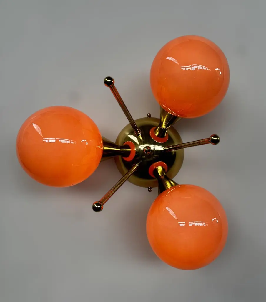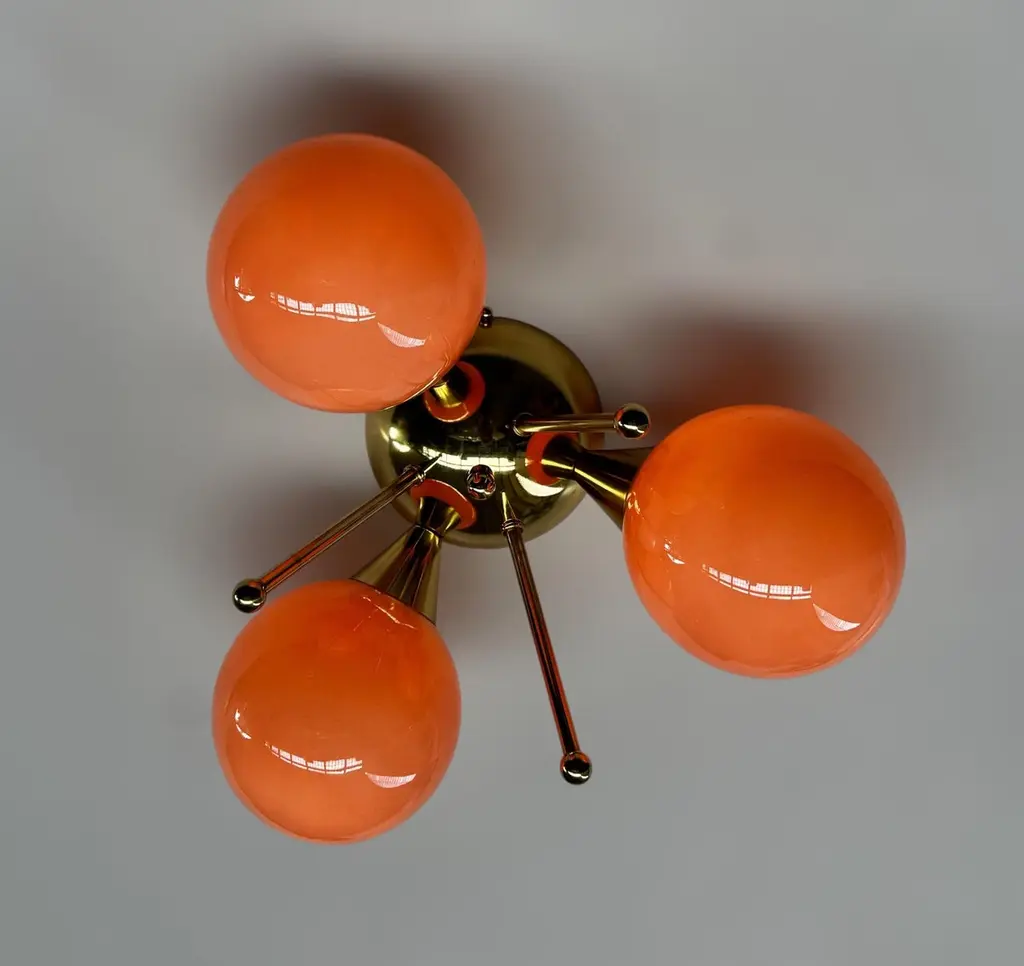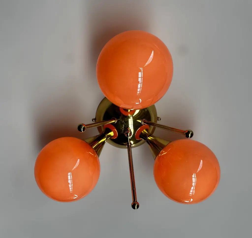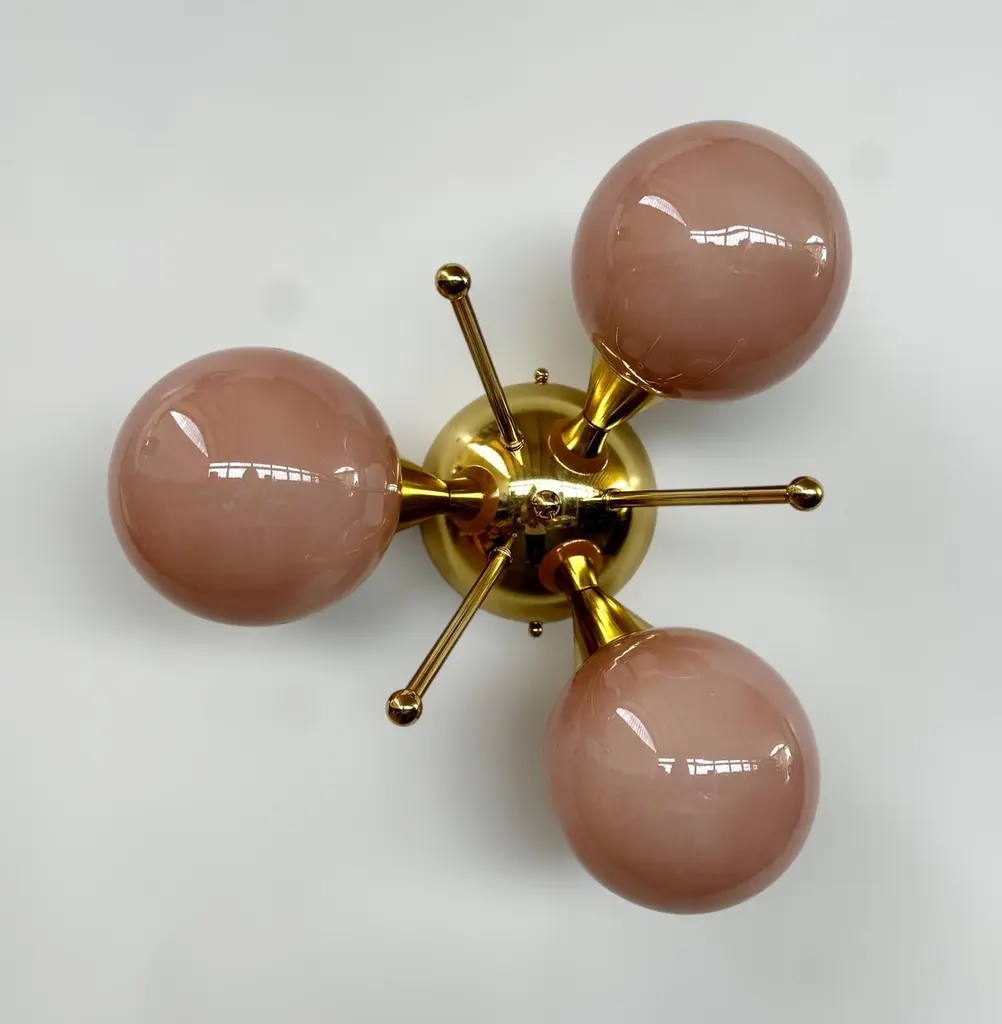 Italian flush mount with 3 Murano glass globes mounted on solid brass frame in lacquered polished brass finishDesigned by Fabio Bergomi / Made in Italy3 lights / E12 or E14 type / max 40W eachDiameter: 13 inches / Height: 9 inchesOrder only / This item ships from ItalyOrder Reference #: FABIOLTD TRIFOGLIO GLOBEThe listed price applies to all Brass finishes : Unlacquered Natural Brass, Unlacquered Polished Brass, Lacquered Polished Brass, Lacquered Satin BrassOther finishes available with upcharge of $200: Bronze, Polished Chrome, Satin Chrome, Polished Nickel, Satin Nickel, Polished Black Nickel, Satin Black Nickel, Polished Copper, Satin Copper