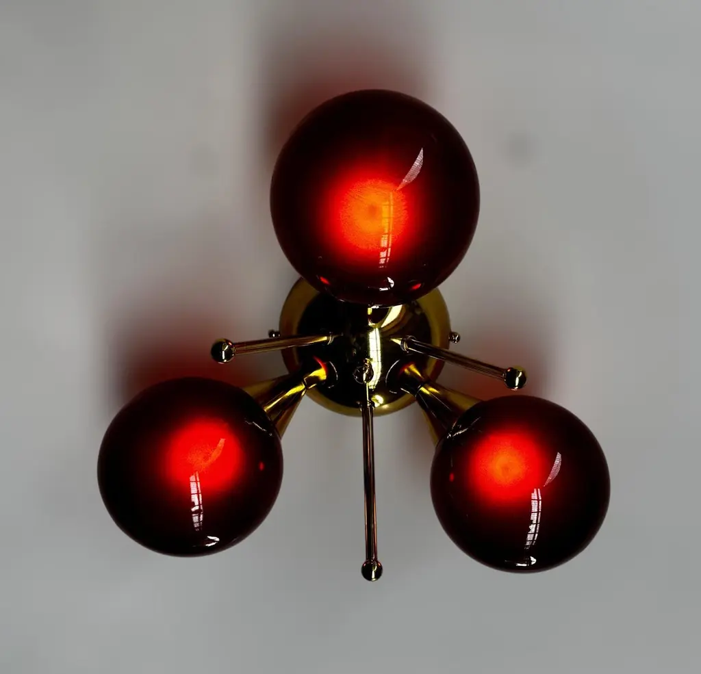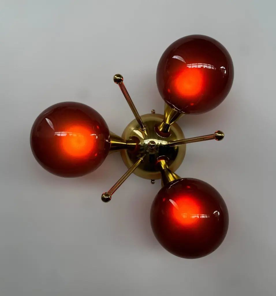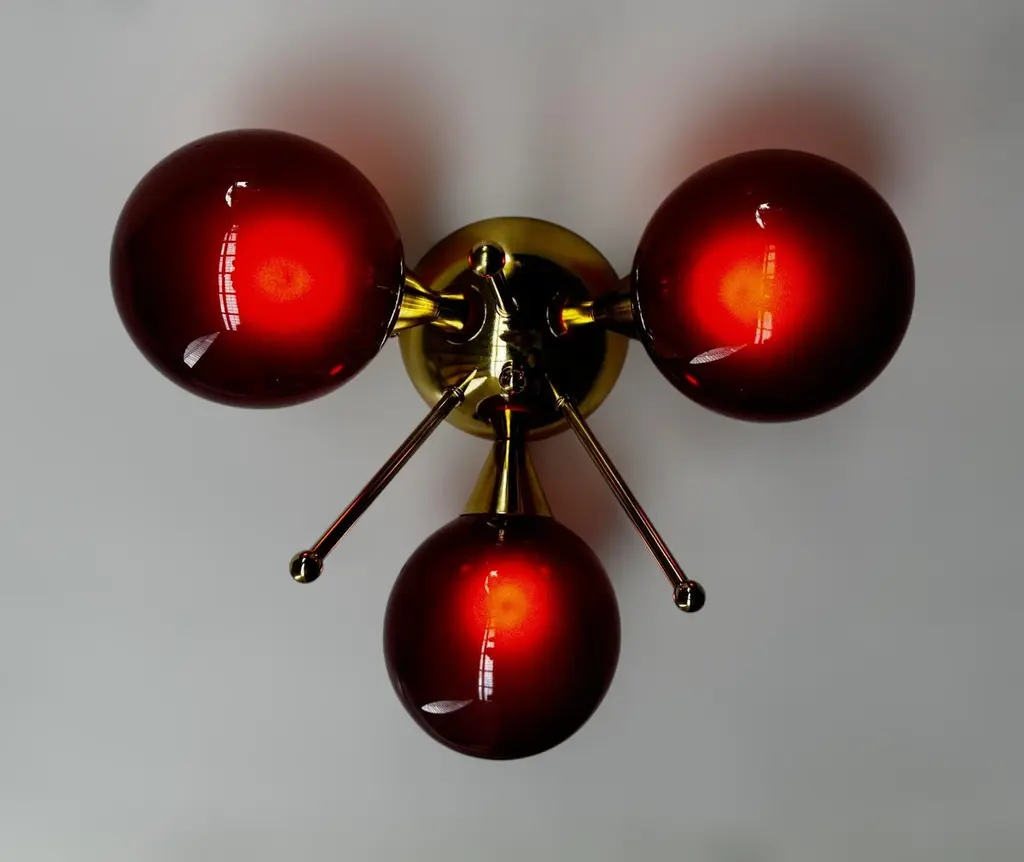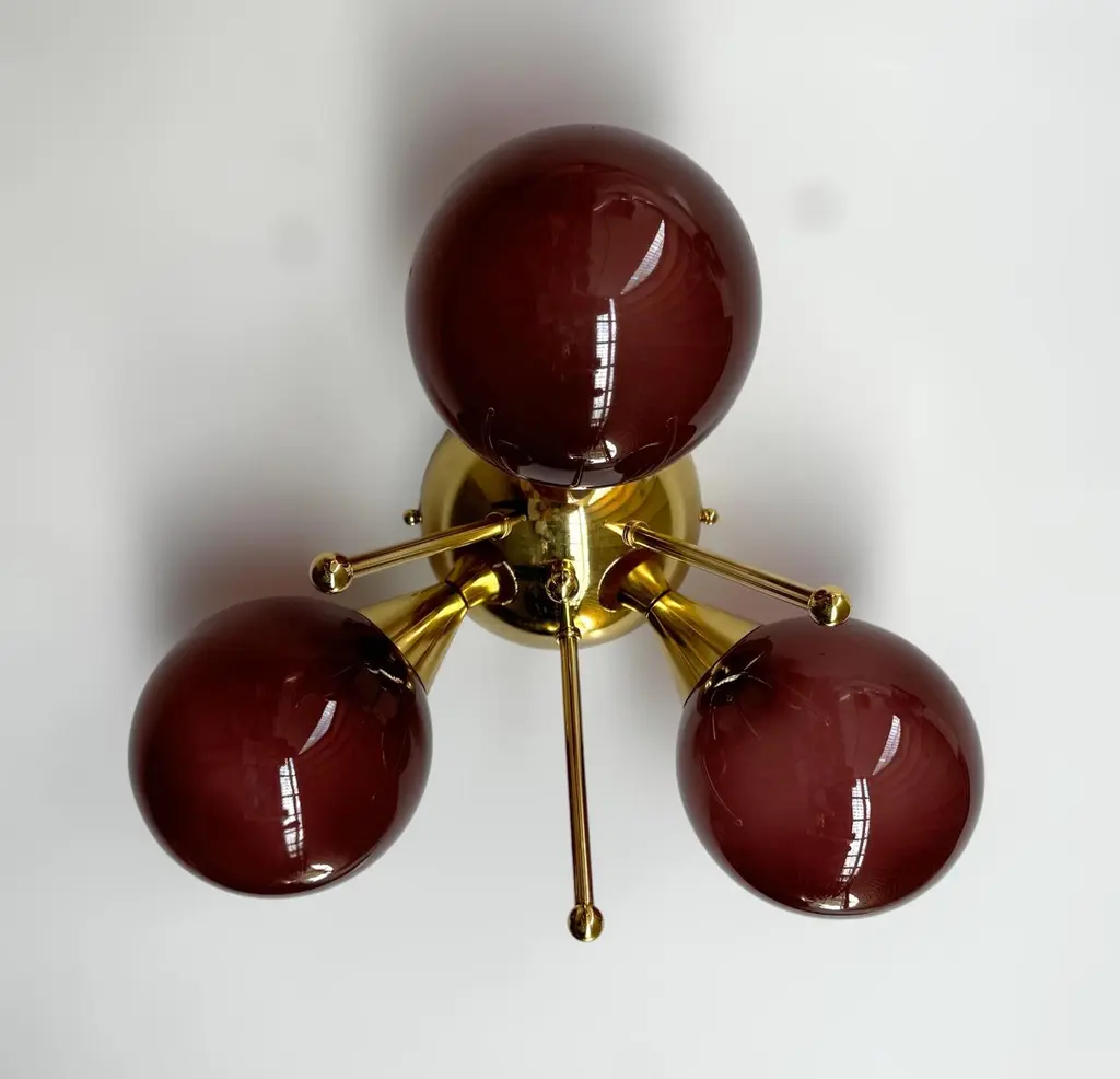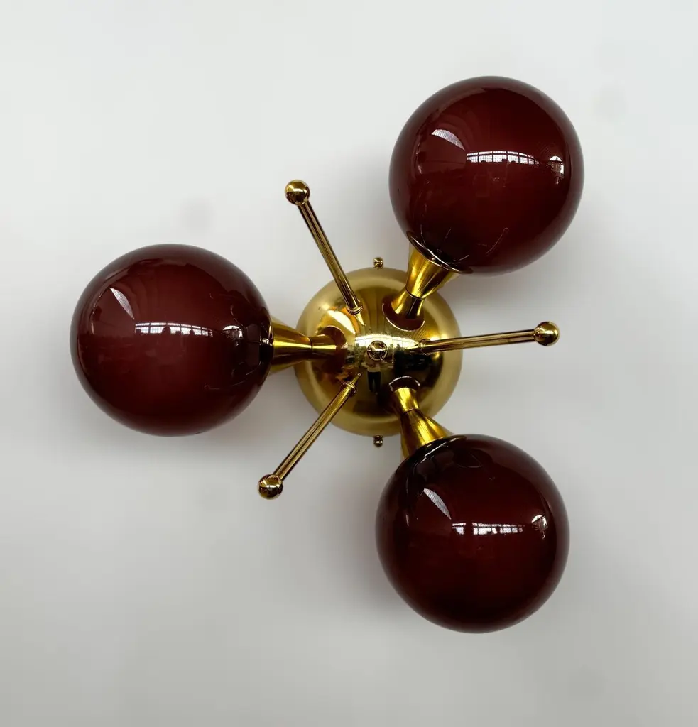 Italian flush mount with 3 Murano glass globes mounted on solid brass frame in lacquered polished brass finishDesigned by Fabio Bergomi / Made in Italy3 lights / E12 or E14 type / max 40W eachDiameter: 13 inches / Height: 9 inchesOrder only / This item ships from ItalyOrder Reference #: FABIOLTD TRIFOGLIO GLOBEThe listed price applies to all Brass finishes : Unlacquered Natural Brass, Unlacquered Polished Brass, Lacquered Polished Brass, Lacquered Satin BrassOther finishes available with upcharge of $200: Bronze, Polished Chrome, Satin Chrome, Polished Nickel, Satin Nickel, Polished Black Nickel, Satin Black Nickel, Polished Copper, Satin Copper