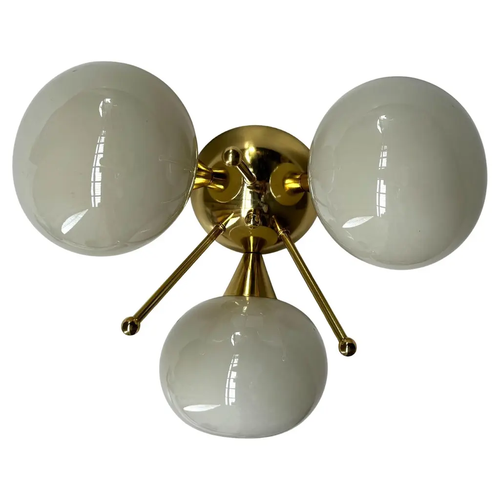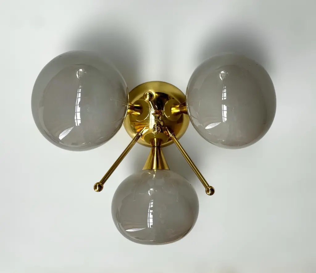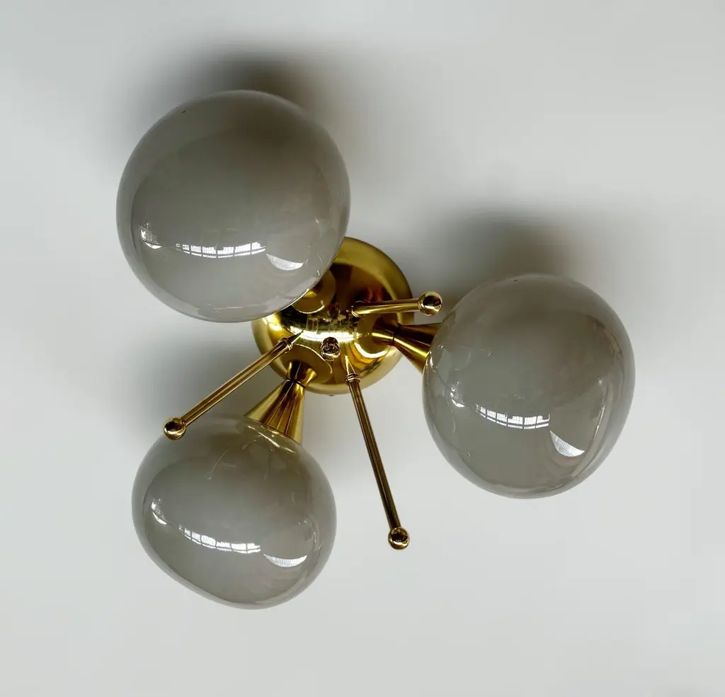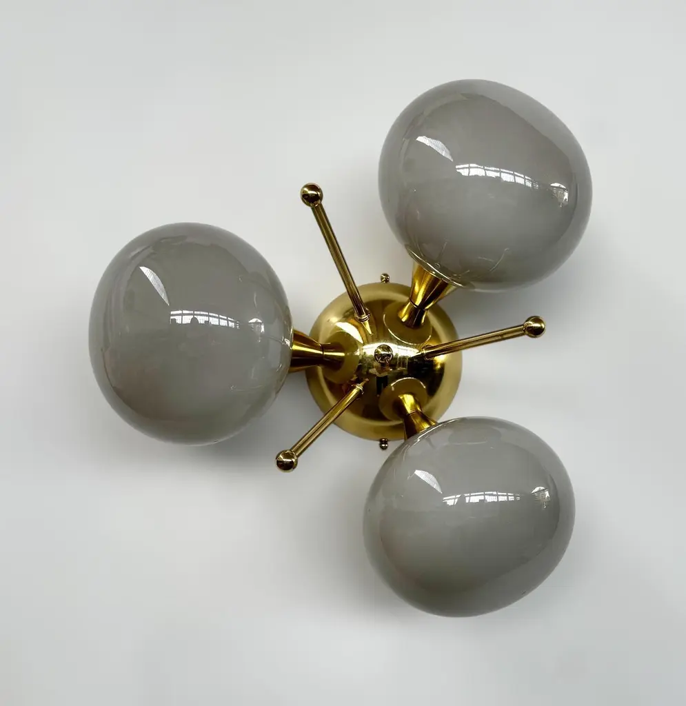 Italian flush mount with 3 pebble shaped Murano glass shades mounted on solid brass frame in lacquered polished brass finishDesigned by Fabio Bergomi / Made in Italy3 lights / E12 or E14 type / max 40W eachDiameter: 17.5 inches / Height: 9.5 inchesOrder only / This item ships from ItalyOrder Reference #: FABIOLTD TRIFOGLIO PEBBLEThe listed price applies to all Brass finishes : Unlacquered Natural Brass, Unlacquered Polished Brass, Lacquered Polished Brass, Lacquered Satin BrassOther finishes available with upcharge of $200: Bronze, Polished Chrome, Satin Chrome, Polished Nickel, Satin Nickel, Polished Black Nickel, Satin Black Nickel, Polished Copper, Satin Copper