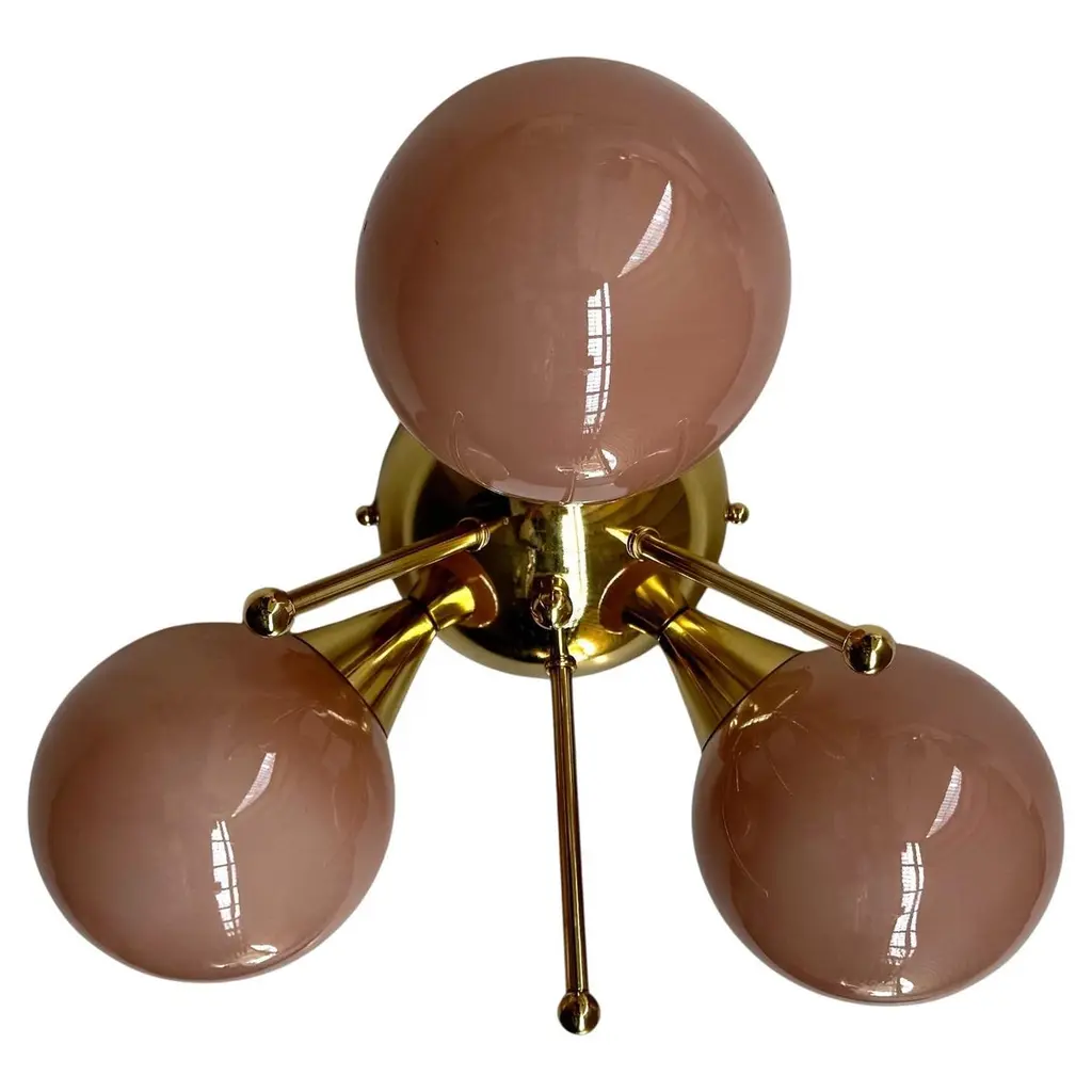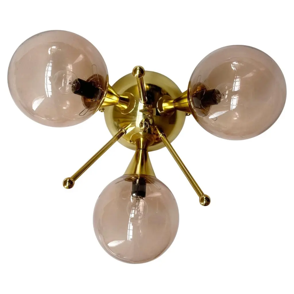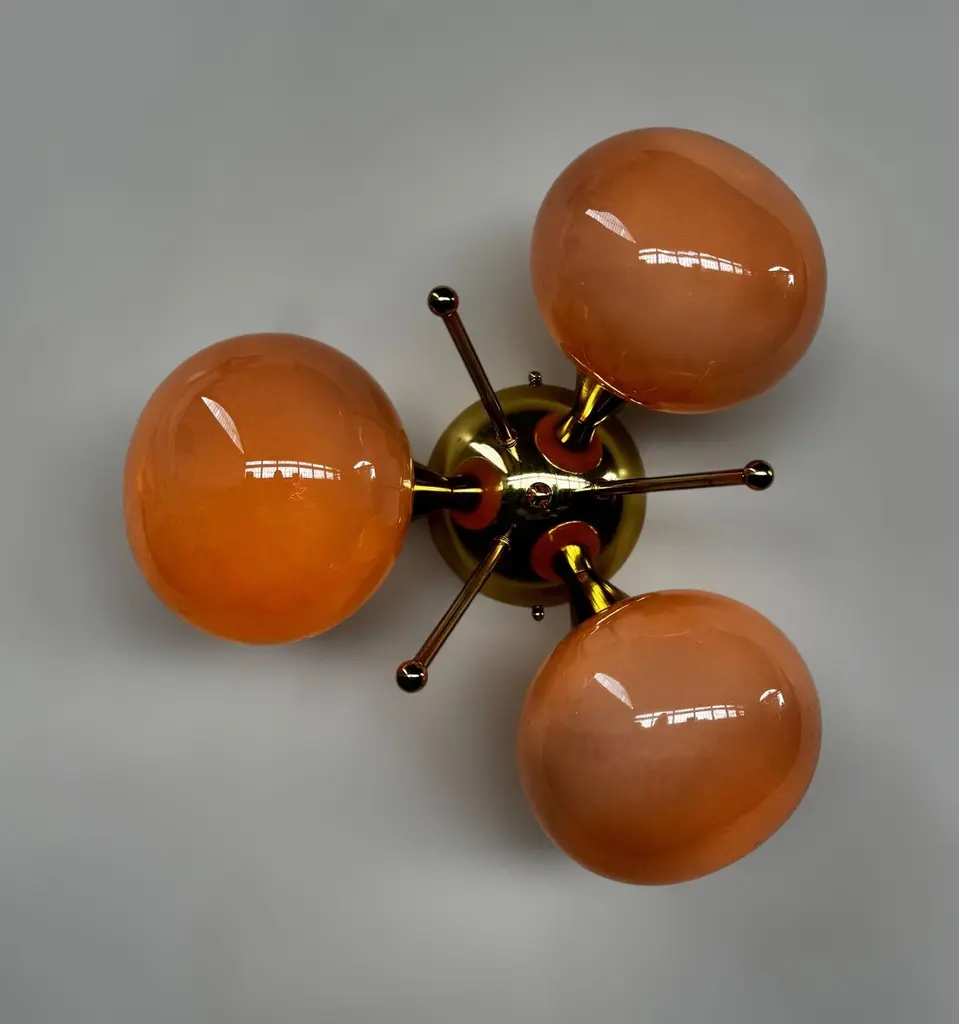 Italian flush mount with 3 pebble shaped Murano glass shades mounted on solid brass frame in lacquered polished brass finishDesigned by Fabio Bergomi / Made in Italy3 lights / E12 or E14 type / max 40W eachDiameter: 17.5 inches / Height: 9.5 inchesOrder only / This item ships from ItalyOrder Reference #: FABIOLTD TRIFOGLIO PEBBLEThe listed price applies to all Brass finishes : Unlacquered Natural Brass, Unlacquered Polished Brass, Lacquered Polished Brass, Lacquered Satin BrassOther finishes available with upcharge of $200: Bronze, Polished Chrome, Satin Chrome, Polished Nickel, Satin Nickel, Polished Black Nickel, Satin Black Nickel, Polished Copper, Satin Copper