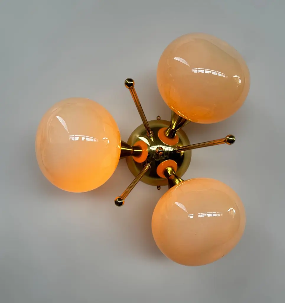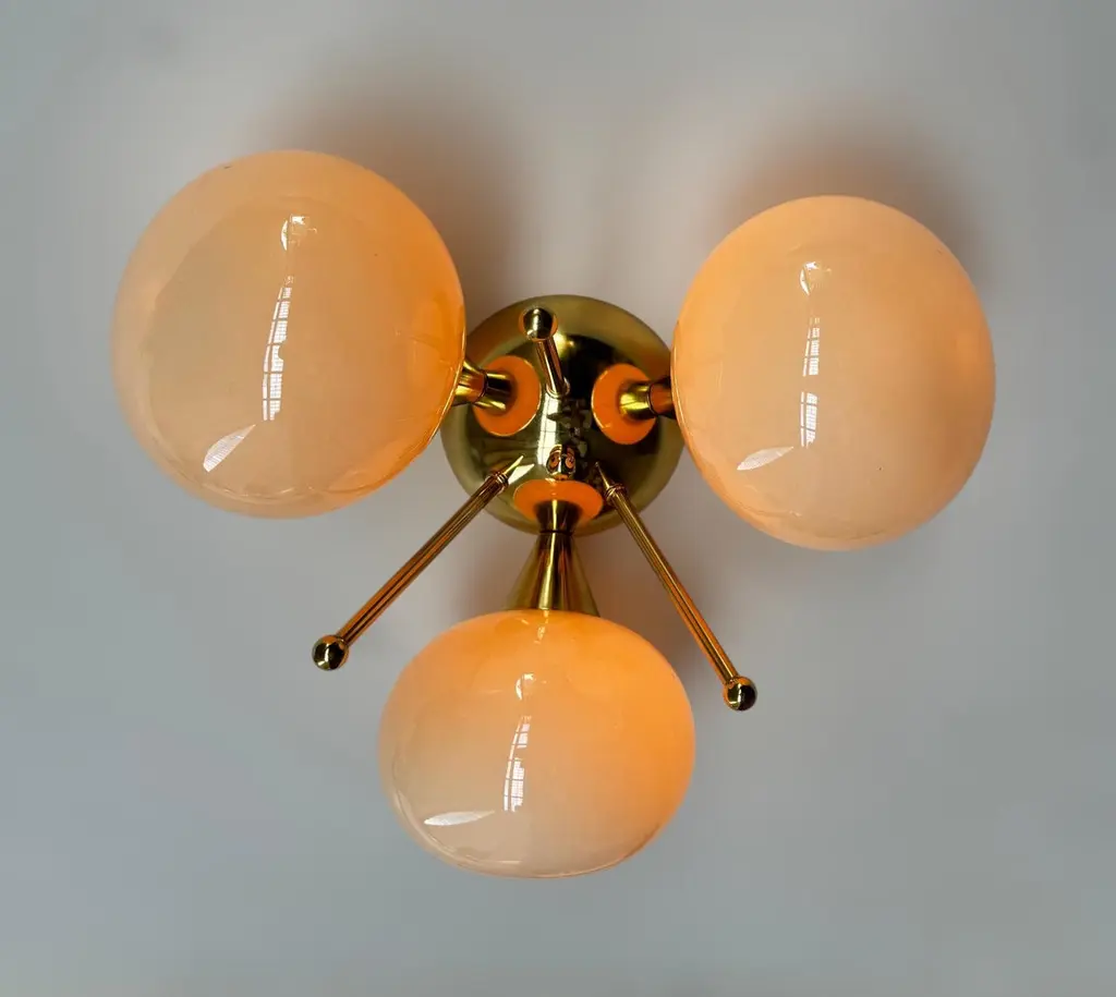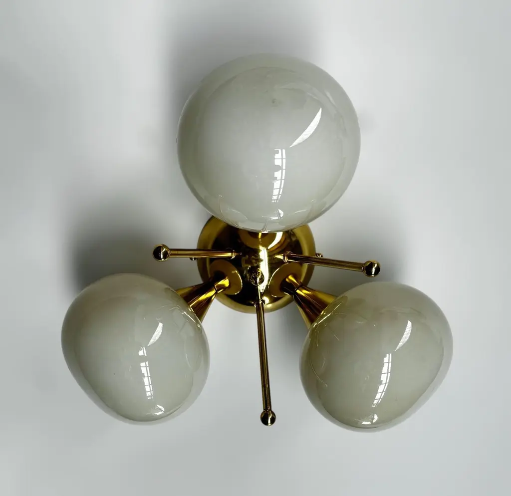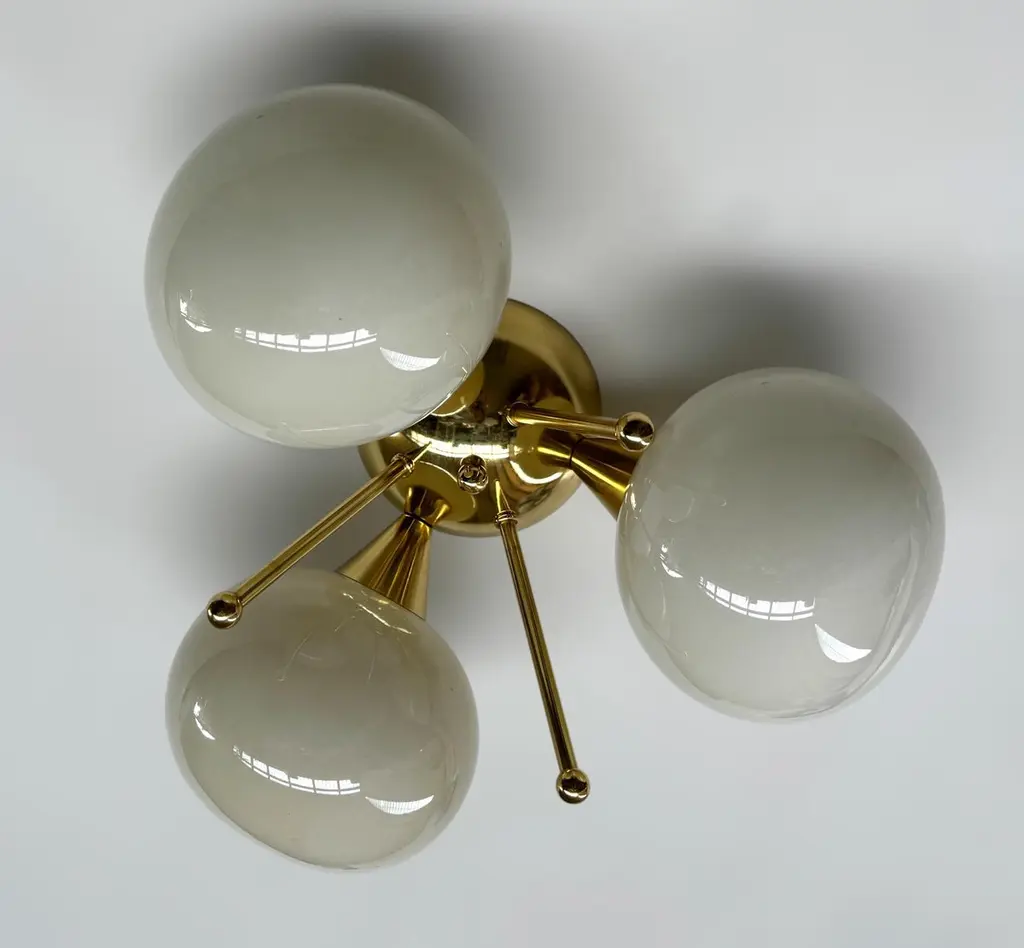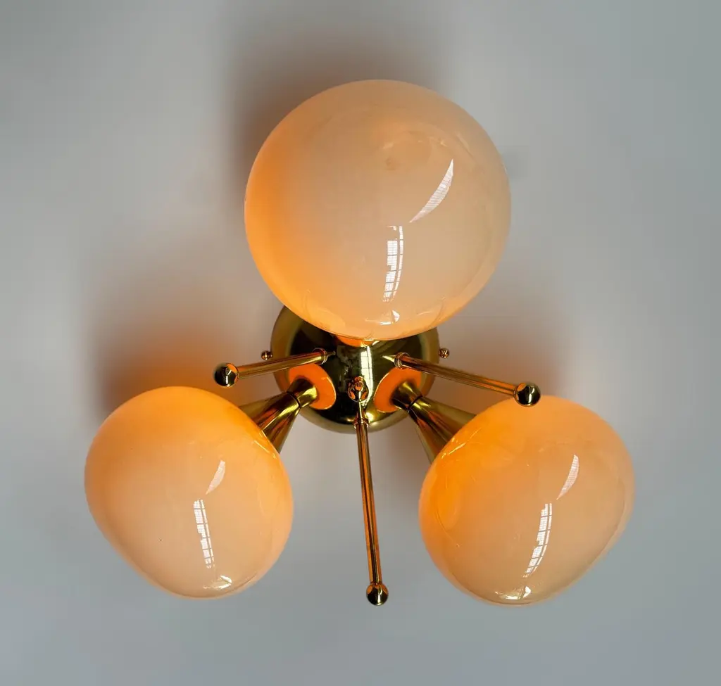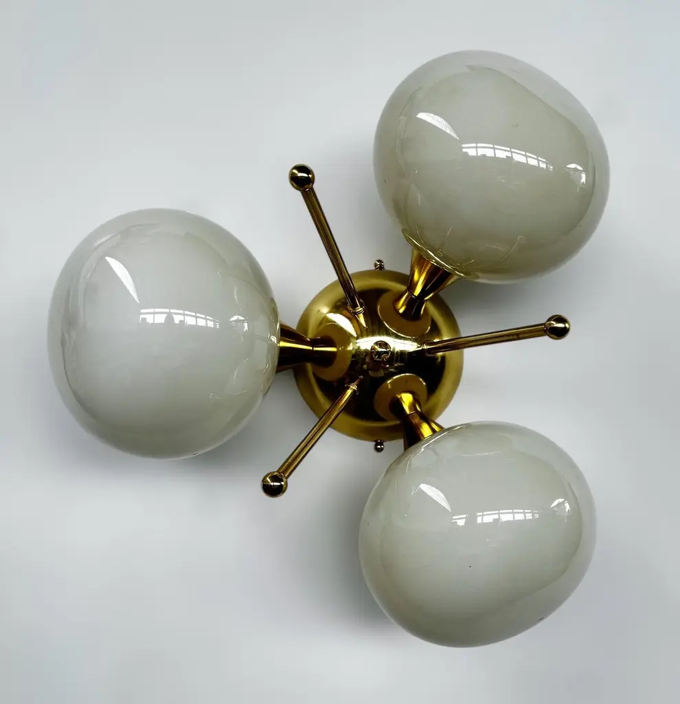 Italian flush mount with 3 pebble shaped Murano glass shades mounted on solid brass frame in lacquered polished brass finishDesigned by Fabio Bergomi / Made in Italy3 lights / E12 or E14 type / max 40W eachDiameter: 17.5 inches / Height: 9.5 inchesOrder only / This item ships from ItalyOrder Reference #: FABIOLTD TRIFOGLIO PEBBLEThe listed price applies to all Brass finishes : Unlacquered Natural Brass, Unlacquered Polished Brass, Lacquered Polished Brass, Lacquered Satin BrassOther finishes available with upcharge of $200: Bronze, Polished Chrome, Satin Chrome, Polished Nickel, Satin Nickel, Polished Black Nickel, Satin Black Nickel, Polished Copper, Satin Copper