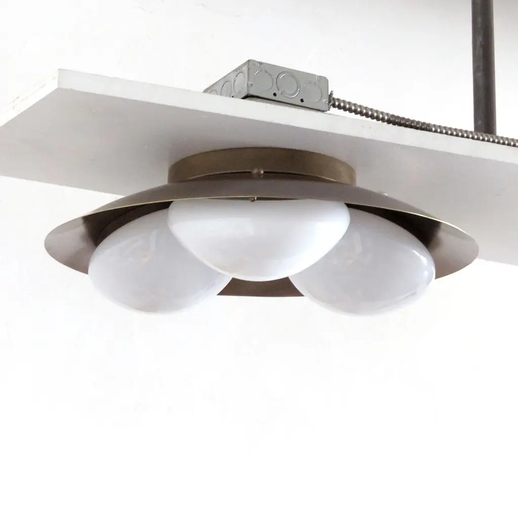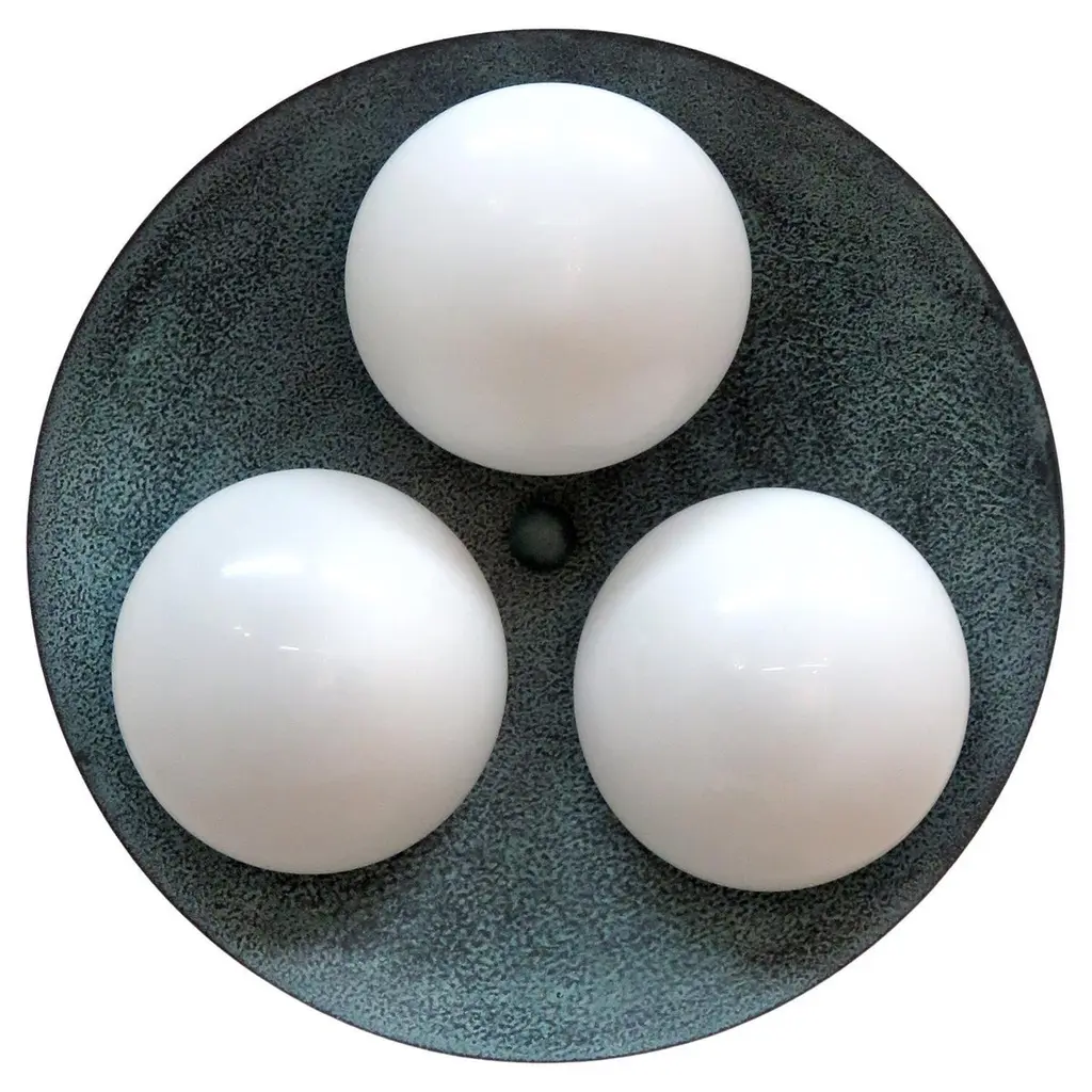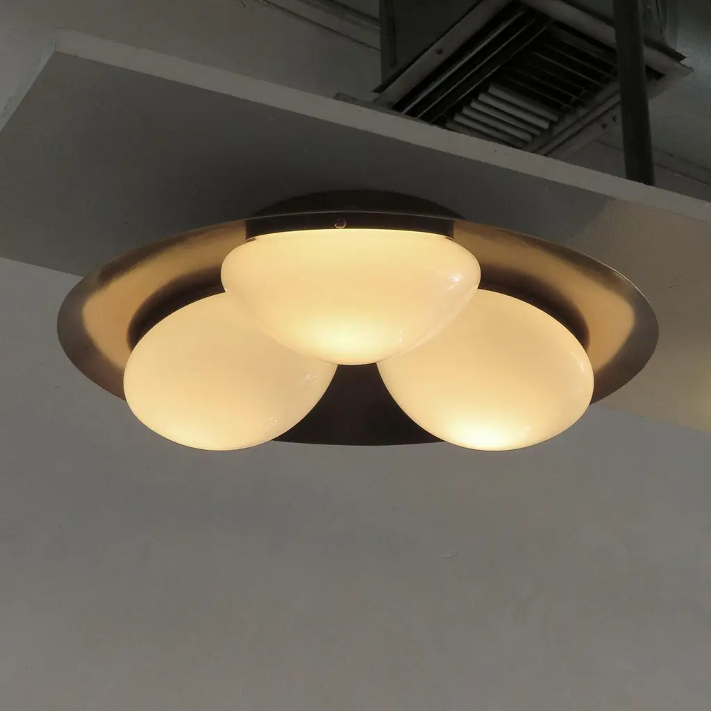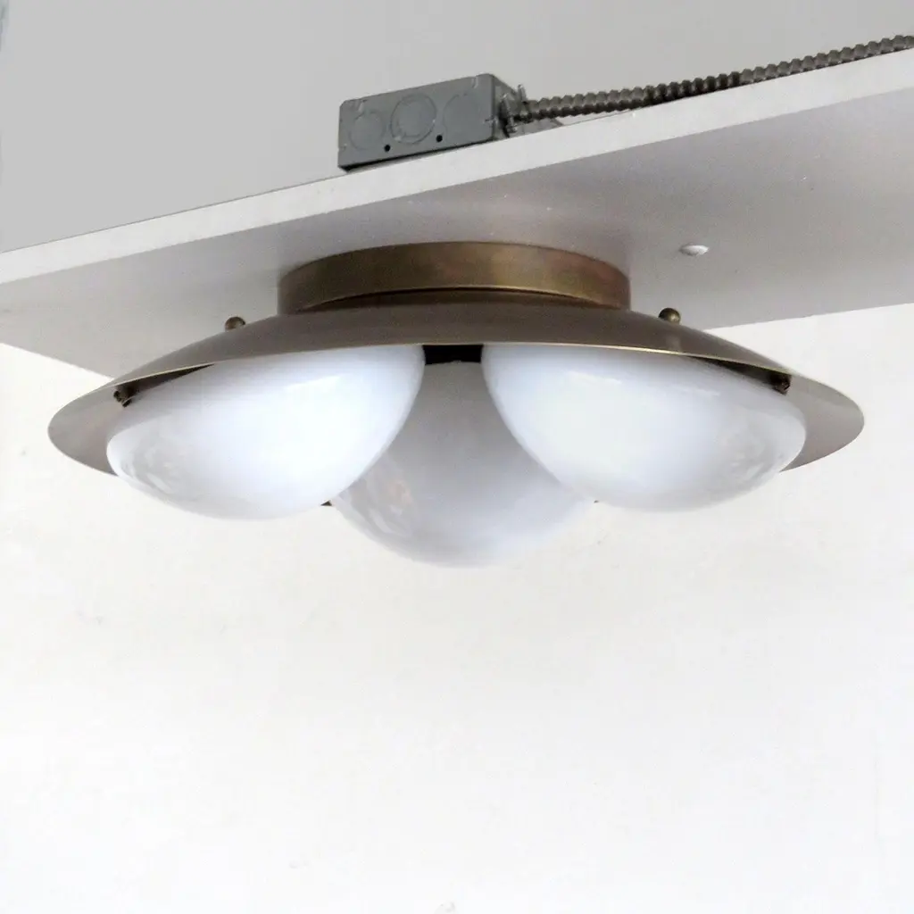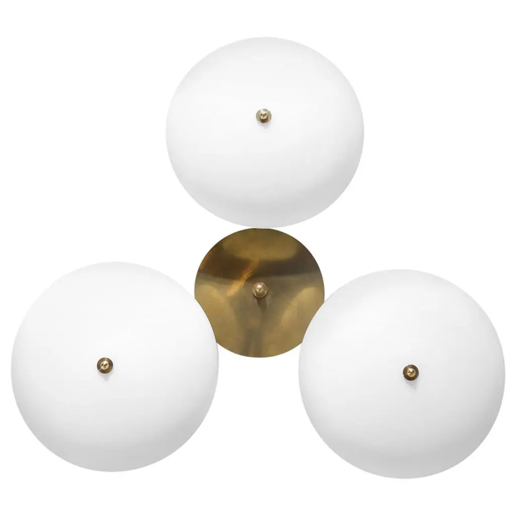 Elegant Trinova wall or ceiling light designed by Gallery L7, handcrafted and finished in Los Angeles from American brass, with three opaline glass shades on an aged raw brass disc. Three E12 sockets per fixture, max. wattage 60w each or LED equivalent, wired for US standards or European standards (110v/220v), incandescent bulbs provided as a onetime courtesy (US only). UL listing available upon request for an additional charge. Multiples available.