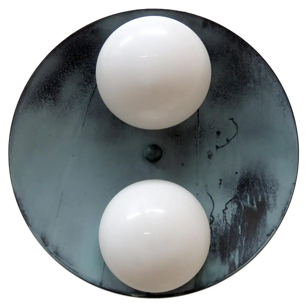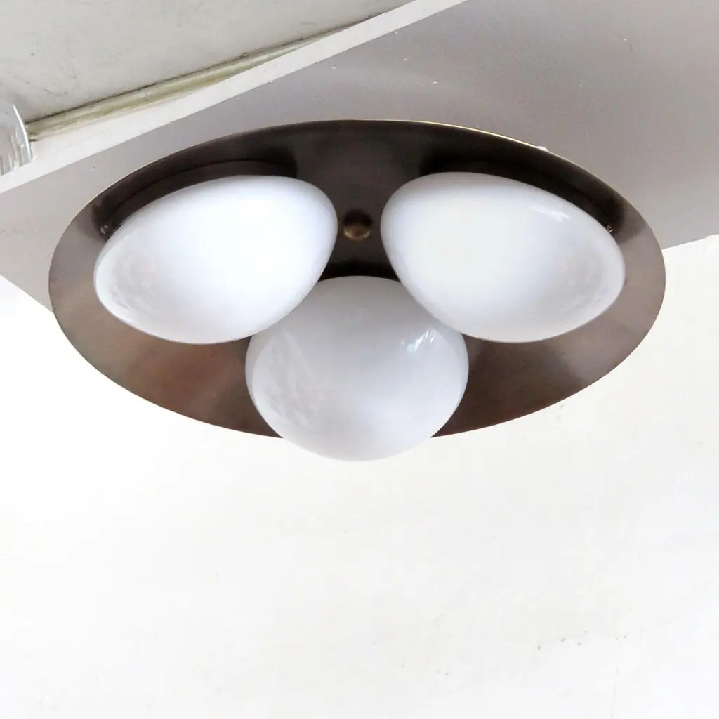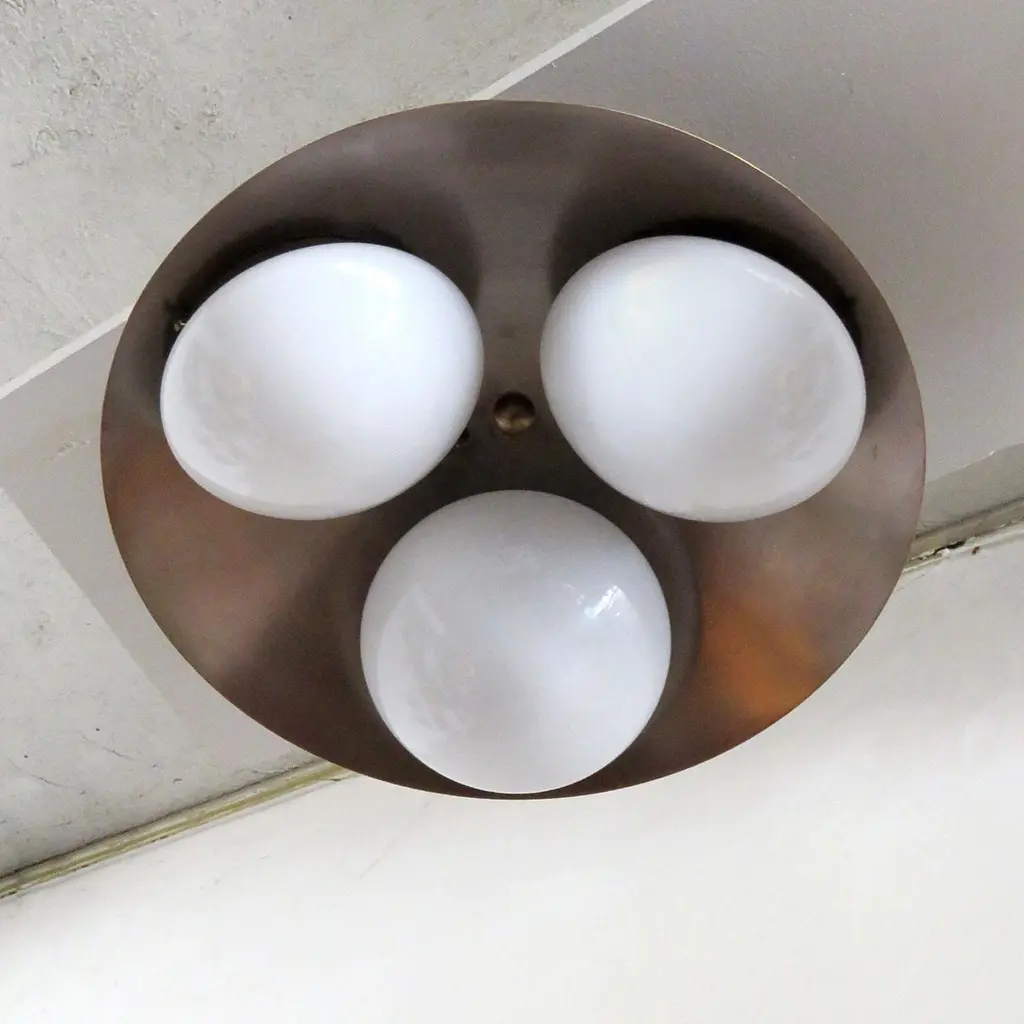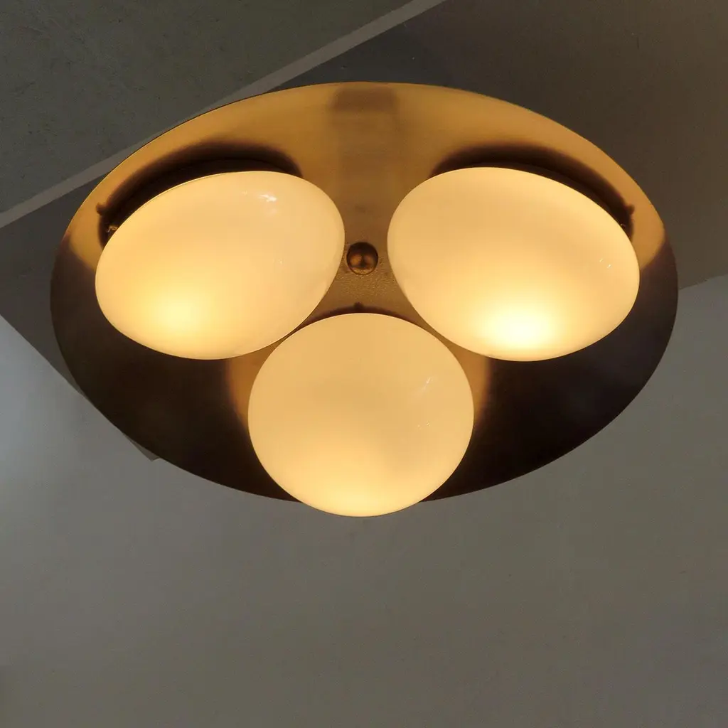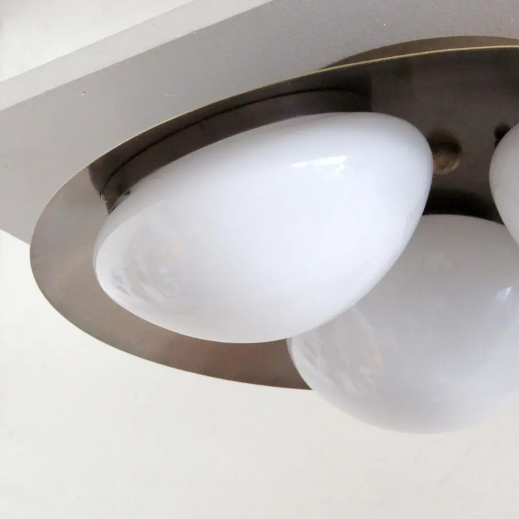 Elegant Trinova wall or ceiling light designed by Gallery L7, handcrafted and finished in Los Angeles from American brass, with three opaline glass shades on an aged raw brass disc. Three E12 sockets per fixture, max. wattage 60w each or LED equivalent, wired for US standards or European standards (110v/220v), incandescent bulbs provided as a onetime courtesy (US only). UL listing available upon request for an additional charge. Multiples available.