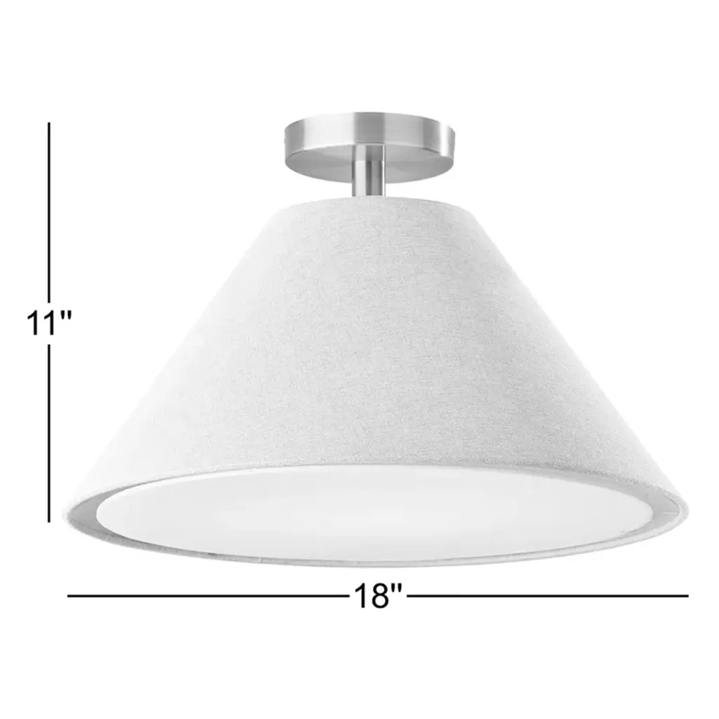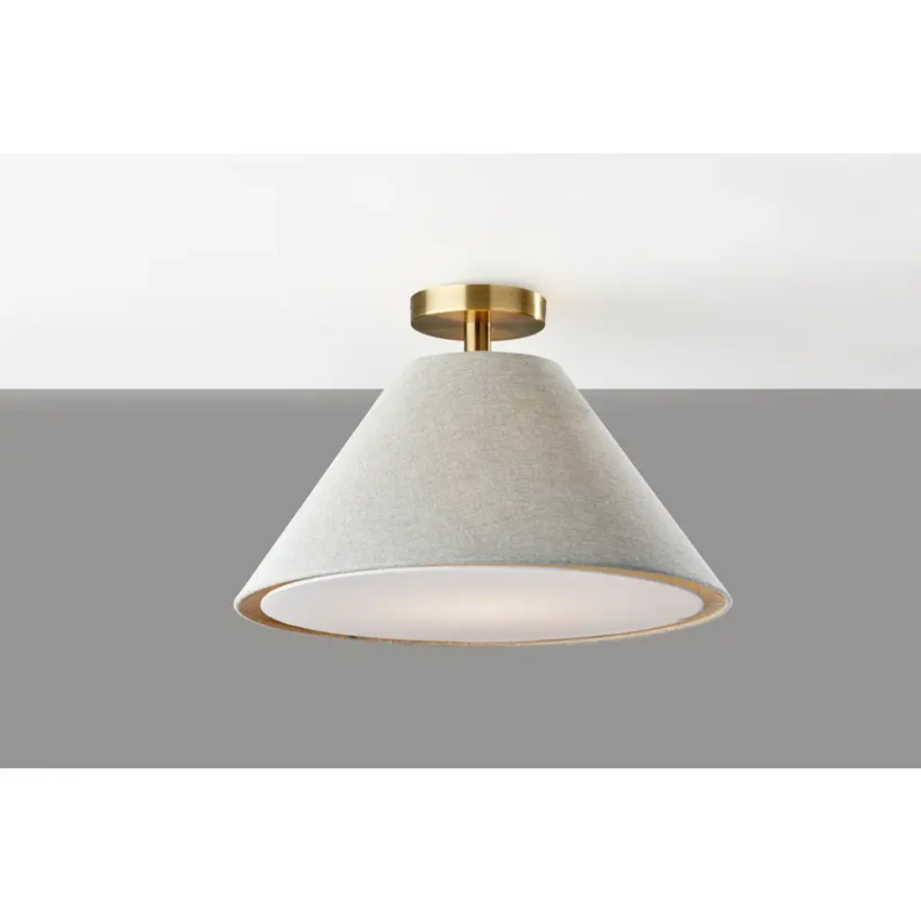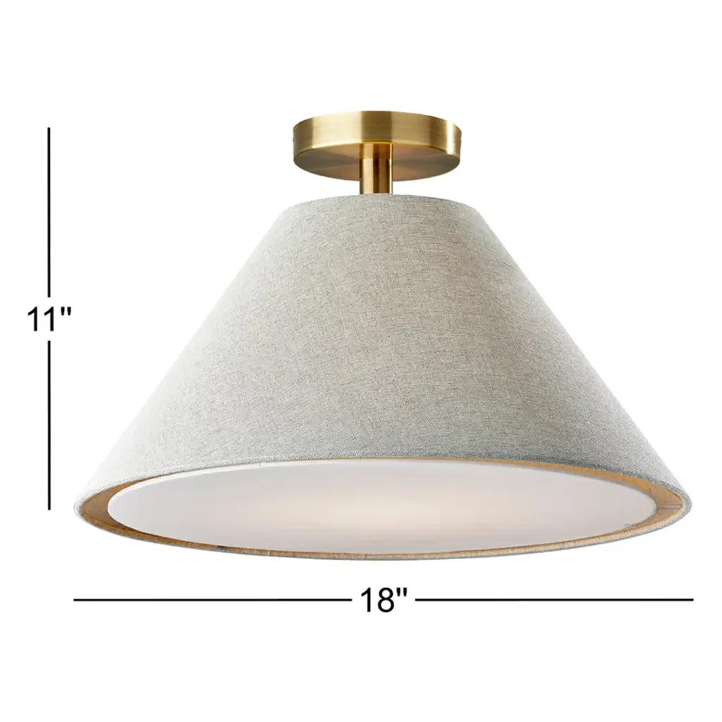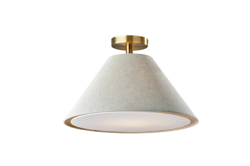 Illuminate your space with the warm lighting and modern chic style of the Hadley flush mount light. As this light is damp location rated, it is the perfect addition to bathrooms, kitchens, and covered outdoor areas that frequently experience moisture. The tapered textured shade features clean style lines, while the fabric diffuser softly distills the light from a 100W bulb. The shade mounts to your ceiling with a 5" diameter round canopy base in antique brass finish.