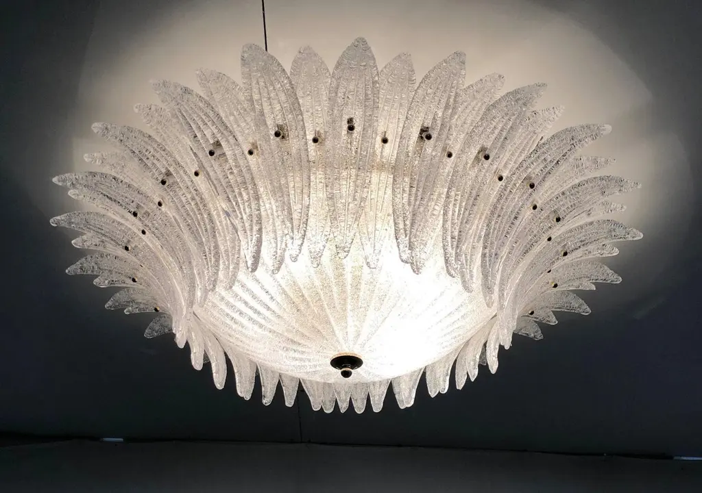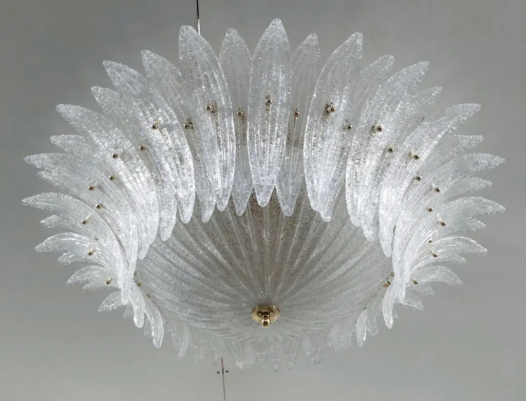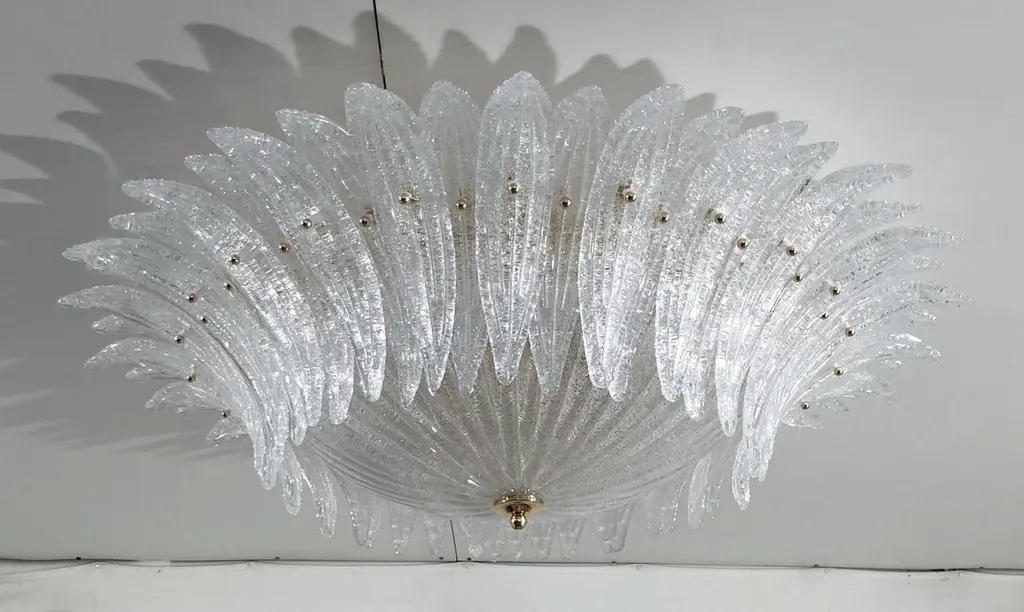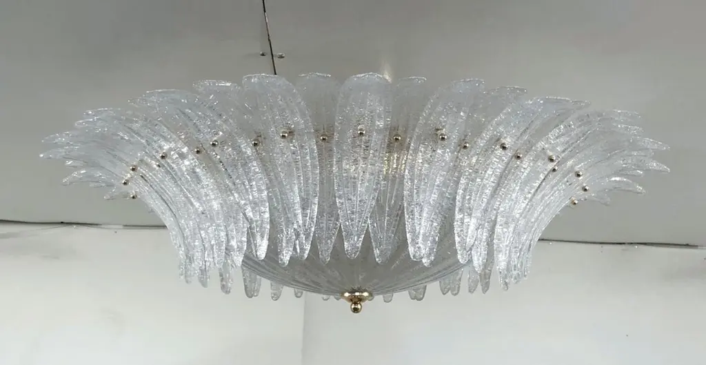 Italian Palmette flush mount chandelier shown in clear Murano glass leaves with granular texture using Graniglia technique, mounted on 24k gold plated metal finish frame / Made in Italy6 lights / E26 or E27 type / max 60W eachDiameter: 36 inches / Height: 10 inchesOrder Only / This item ships from Italy.