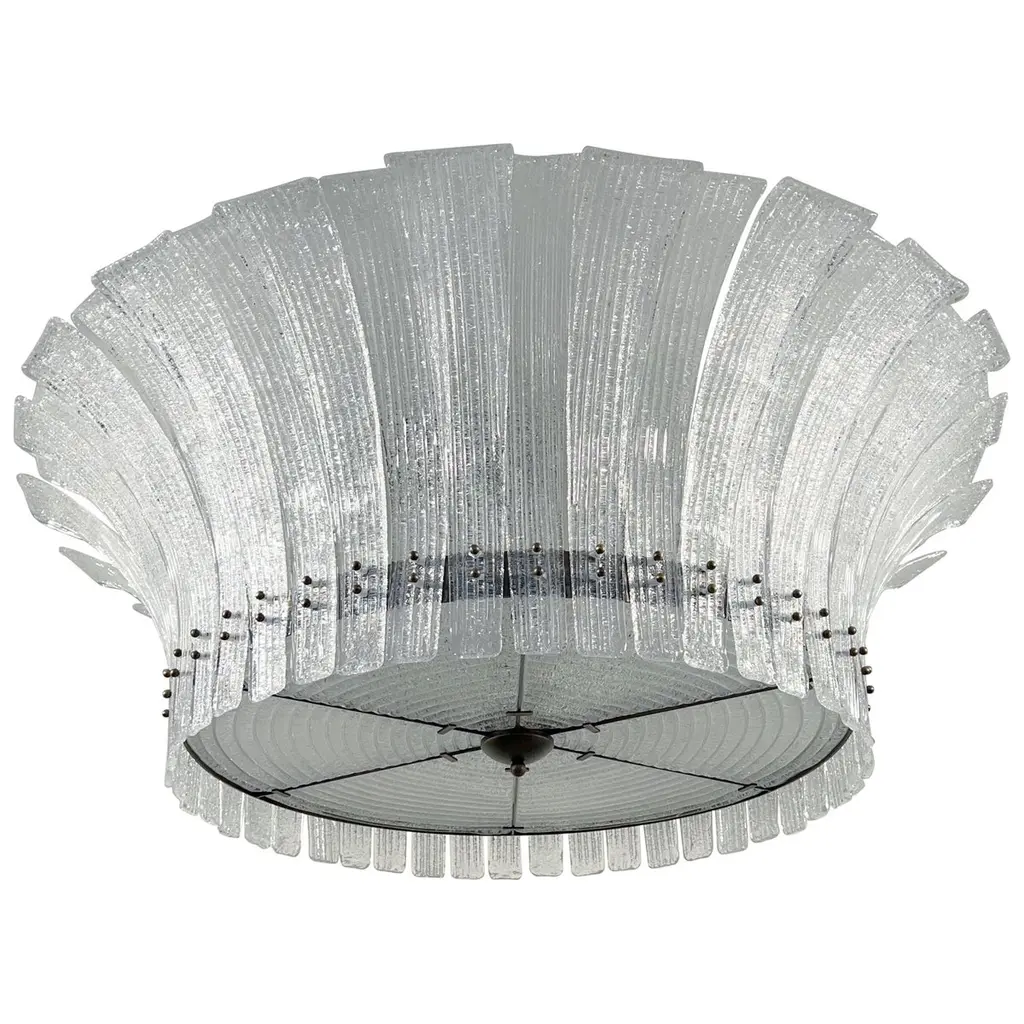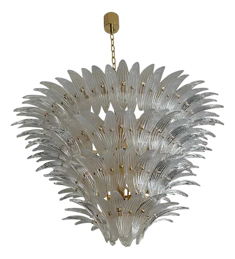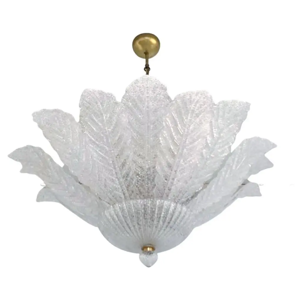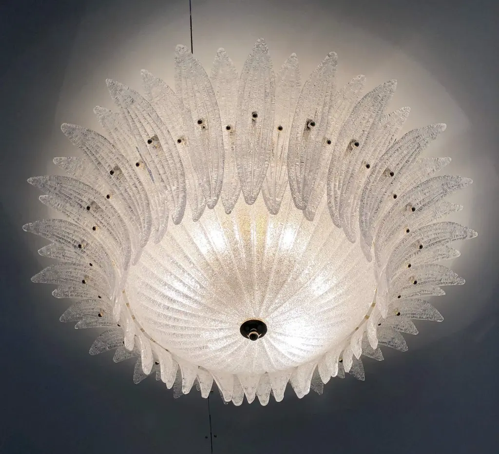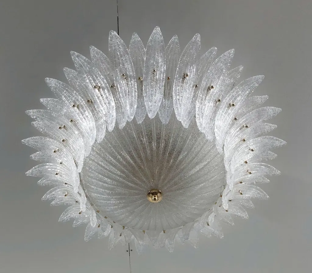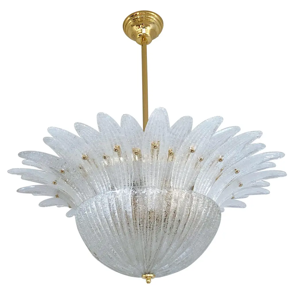 Italian Palmette flush mount chandelier shown in clear Murano glass leaves with granular texture using Graniglia technique, mounted on 24k gold plated metal finish frame / Made in Italy6 lights / E26 or E27 type / max 60W eachDiameter: 36 inches / Height: 10 inchesOrder Only / This item ships from Italy.