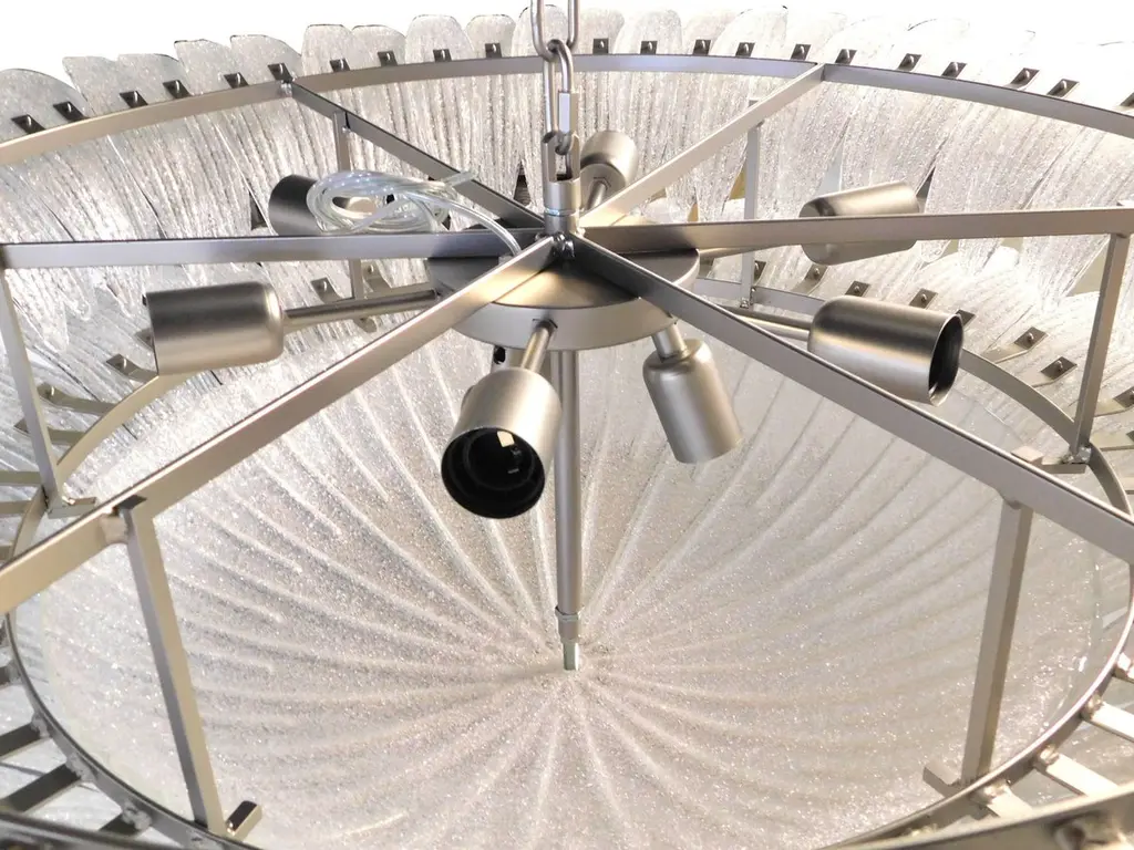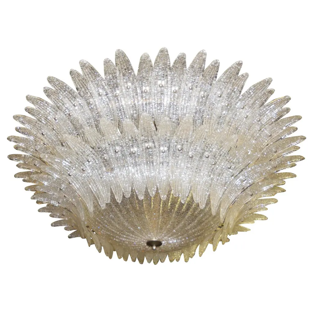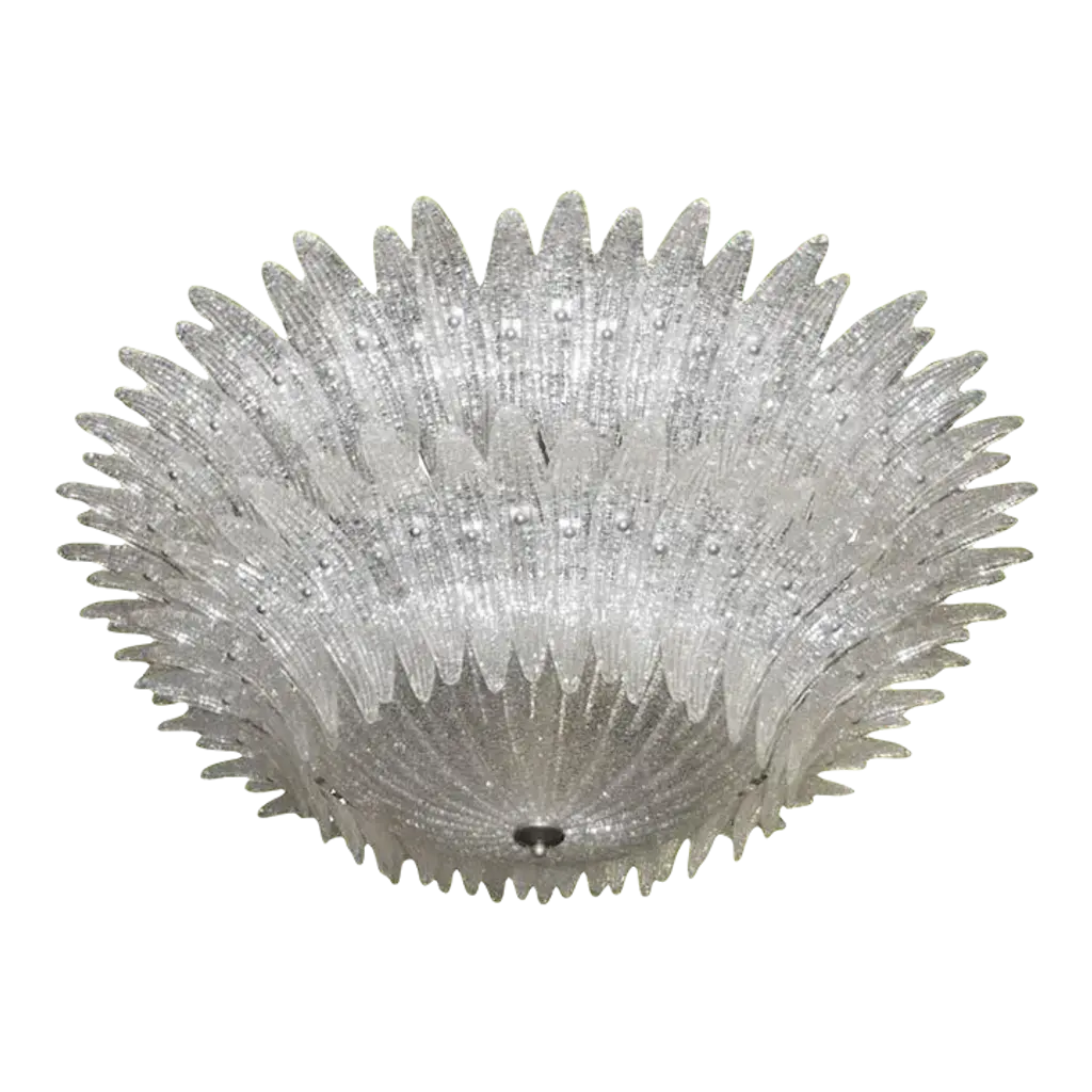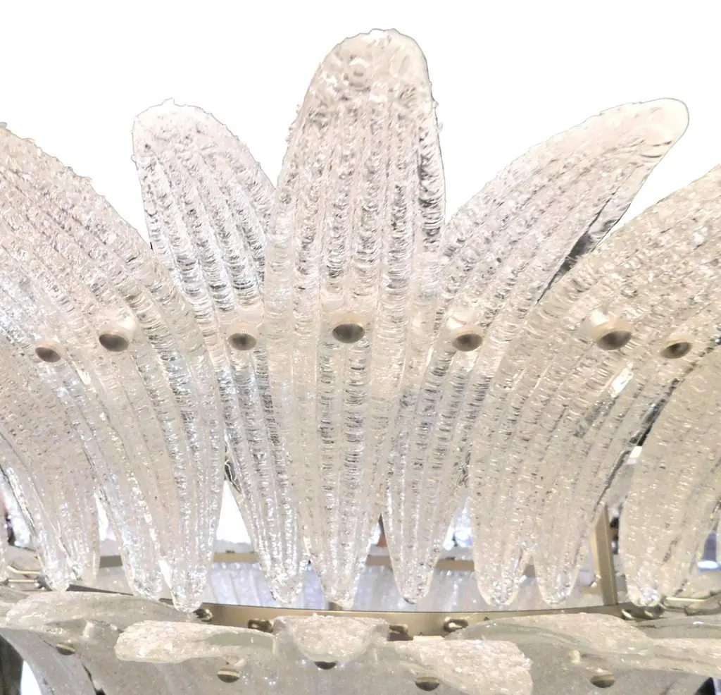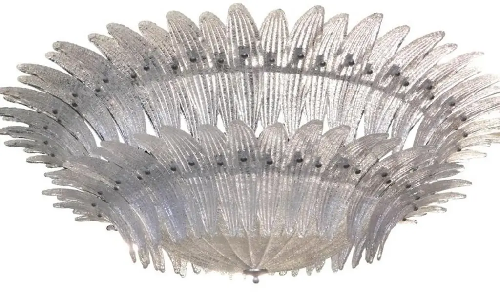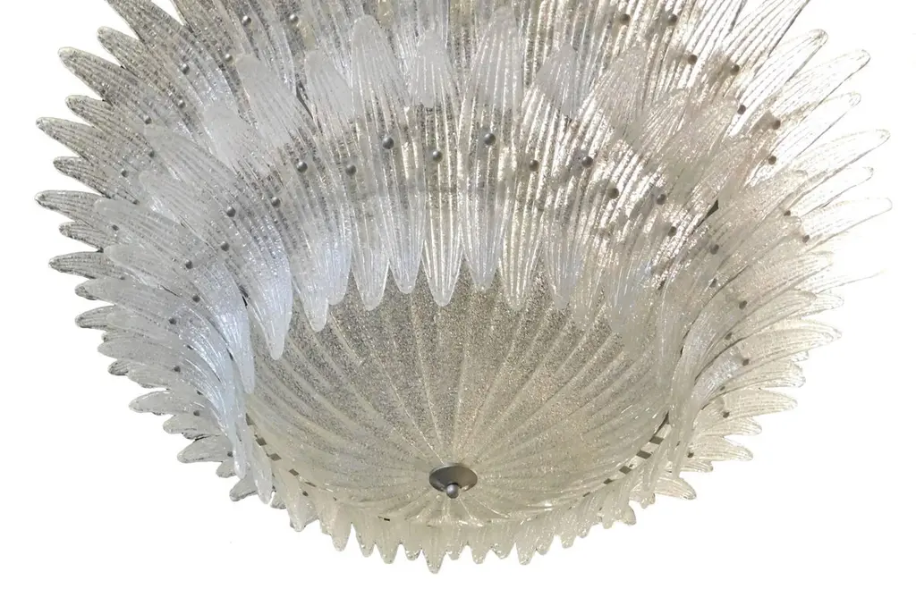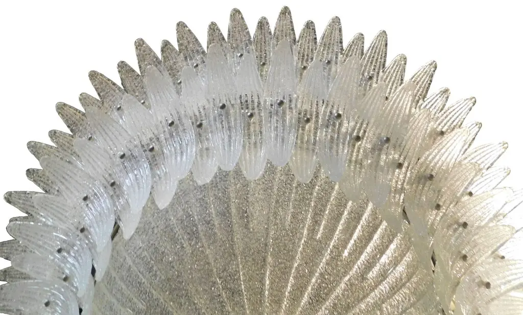 Italian two tier Palmette flush mount chandelier shown in clear Murano glass leaves with granular texture using Graniglia technique, mounted on satin nickel metal frame / Made in Italy8 lights / E26 or E27 type / max 60W each Diameter: 48 inches / Height: 16 inchesOrder Only / This item ships from ItalyOrder Reference #: FABIOLTD C247