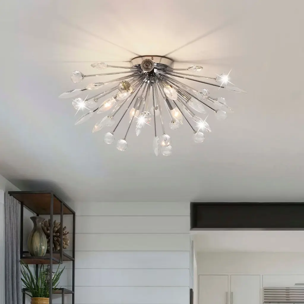 Bring warmth and elegance to your favorite space with the Tulip Flushmount from Hudson Valley Lighting. This piece enhances the modern home with a pleasing contrast of metal and crystal glass. Mounting close to the ceiling, the smooth metal frame extends four evenly-spaced bulbs and drops a series of thin arms that end with clean K9 crystal pieces. The bulbs emit a welcoming, even layer of illumination that interacts with the crystal for an impressive ambiance.
