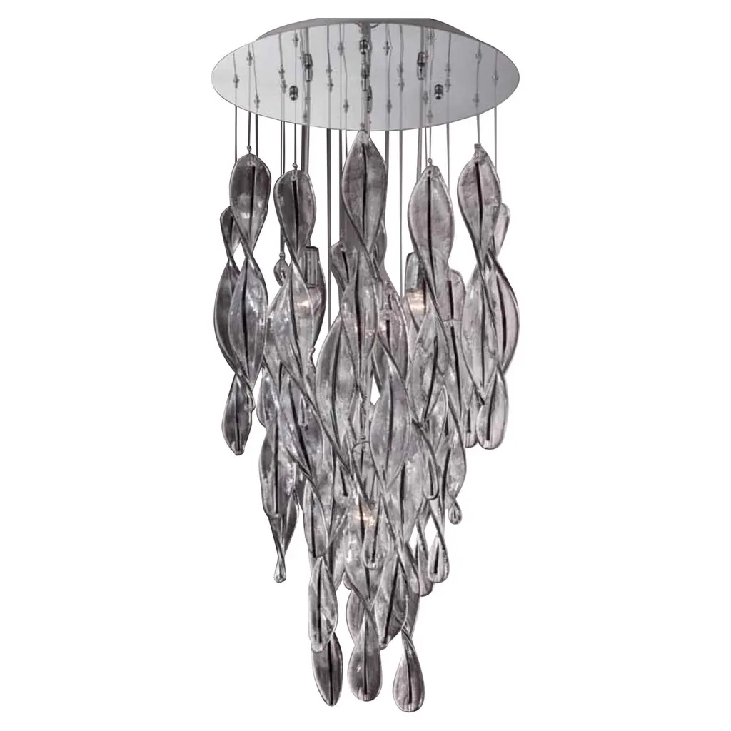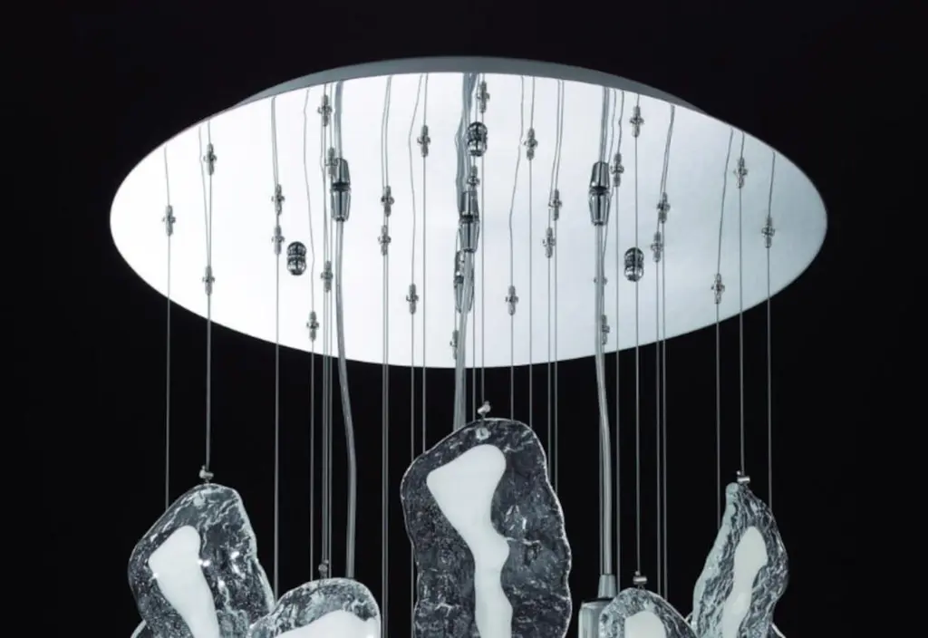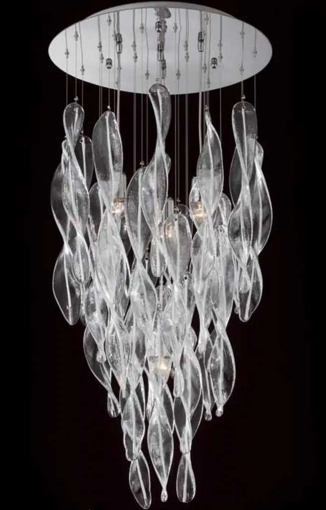Italian flush mount shown with clear Murano glass swirls decorated with white stripes in the center, mounted on round stainless steel ceiling plate / inspired by Mazzega / Made in Italy4 lights / E26 or E27 type / max 60W eachMeasures: Diameter 20 inches / height 43.5 inches plus cable and ceiling plateOrder only / This item ships from ItalyOrder reference #: FABIOLTD C283 WHITE