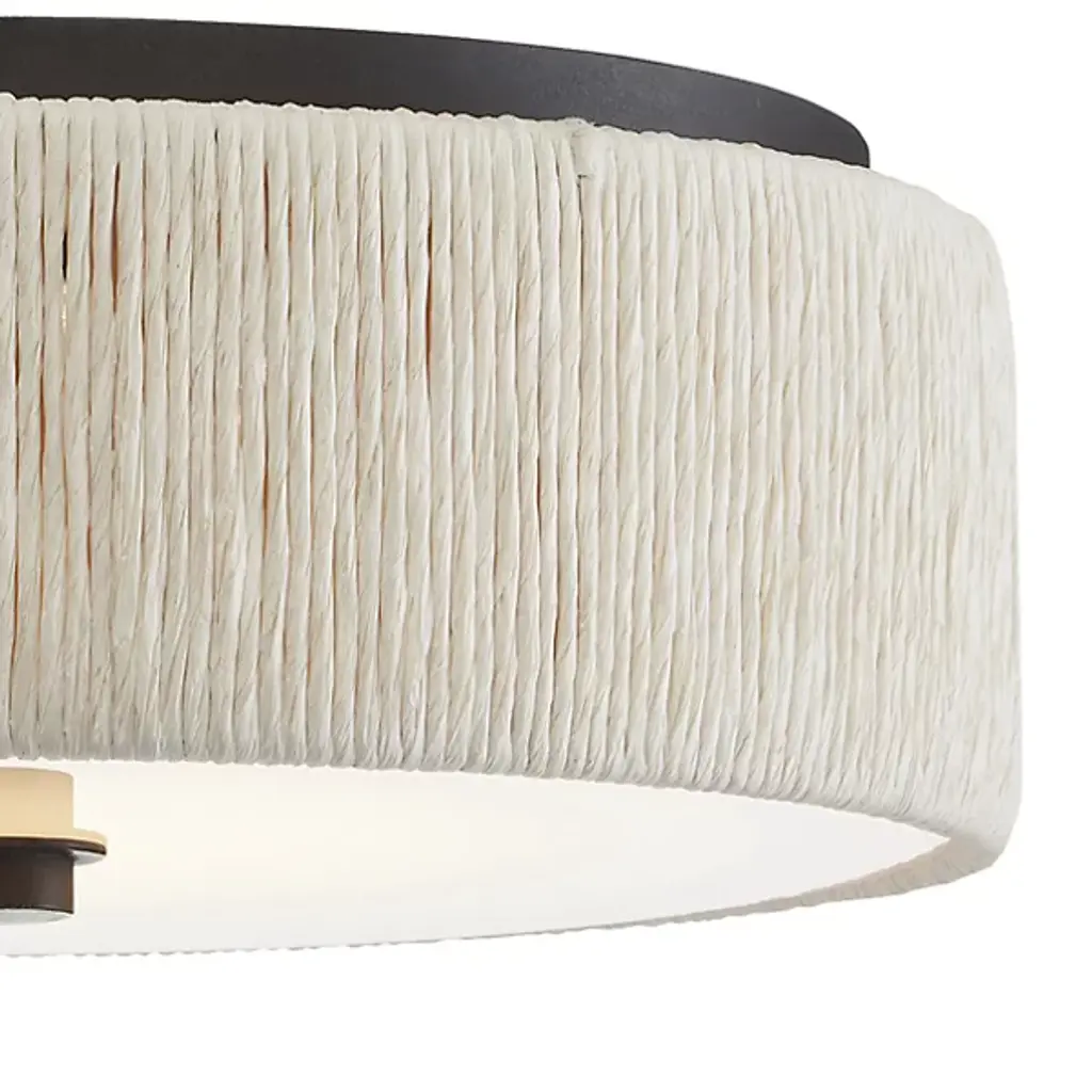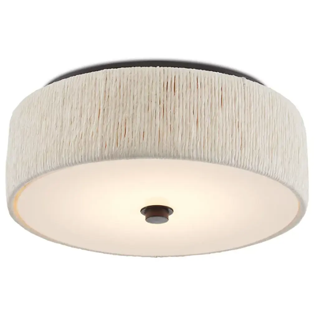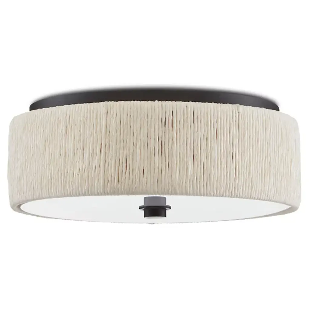 Cast a warm ambiance around living spaces with the Tyrone LED Flushmount from Currey & Company. An inspired assembly with a coastal flair, it keeps things simple, descending from a round canopy, and setting strong lamping beneath a disc of white acrylic held in place by a round finial. A curving, rounded ring of braided paper twine marches around the exterior of the lamping, adding a more rustic presence to the otherwise simple refinement.