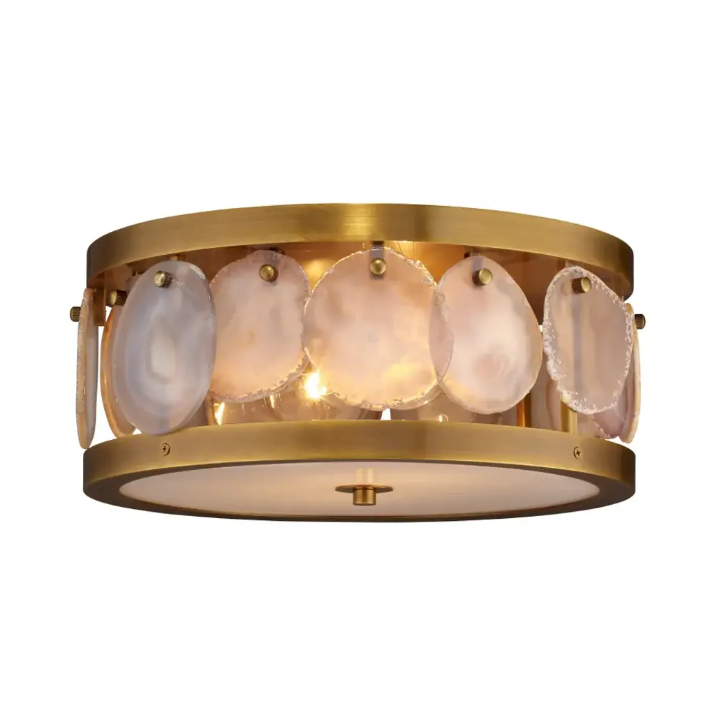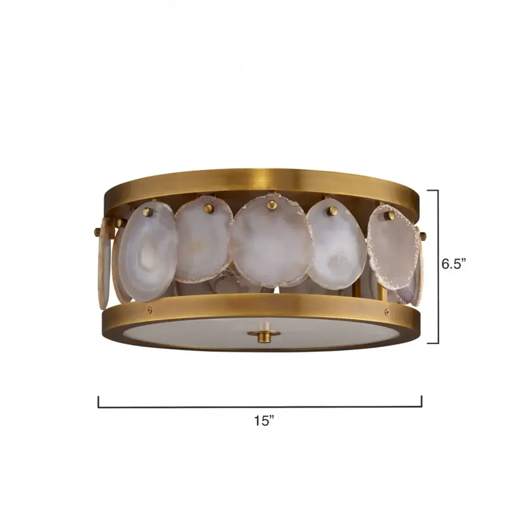 Thin rounds of genuine agate ring the circumference of this dazzling flush mount ceiling light. During the day, the abundance and beauty of the unlit natural material creates a focal point that enhances any modern décor. When lit, the agate glows softly, producing a warm radiance. The hardware is antique brass, and an acrylic diffuser is included.