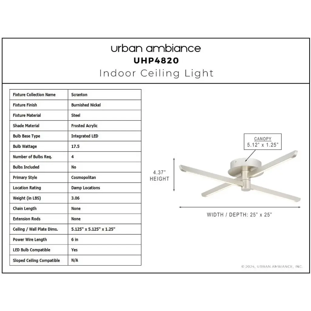 Urban Ambiance Luxury Cosmopolitan Indoor Ceiling Light, 4-3/8''h X 25"w X 25''d, Burnished Nickel Finish, Uhp4820