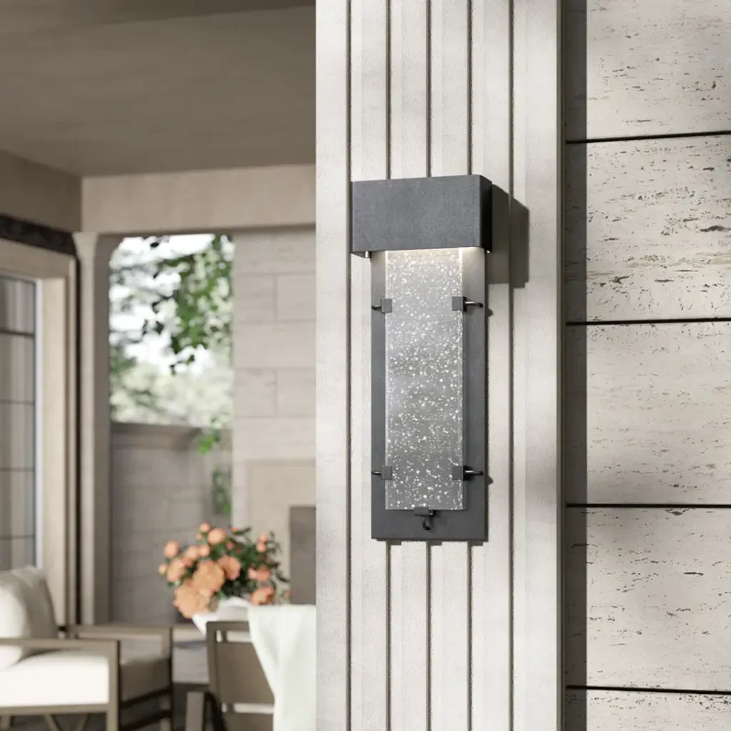 The Ursa features a thick panel of seeded glass that glows like its constellation namesake. The LED source is concealed behind the top metal enclosure, allowing the light to stream through the vertical glass panel below. It looks amazing indoors too. All Hubbardton Forge products are hand-crafted to last one at a time in Vermont.