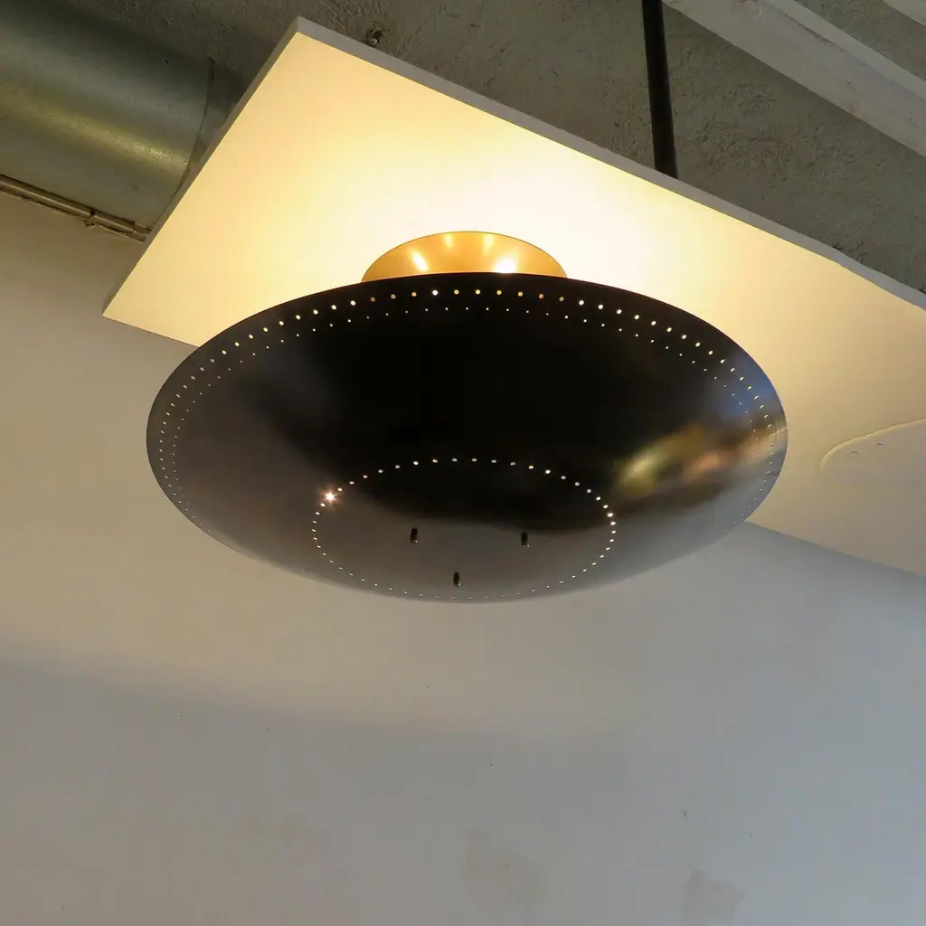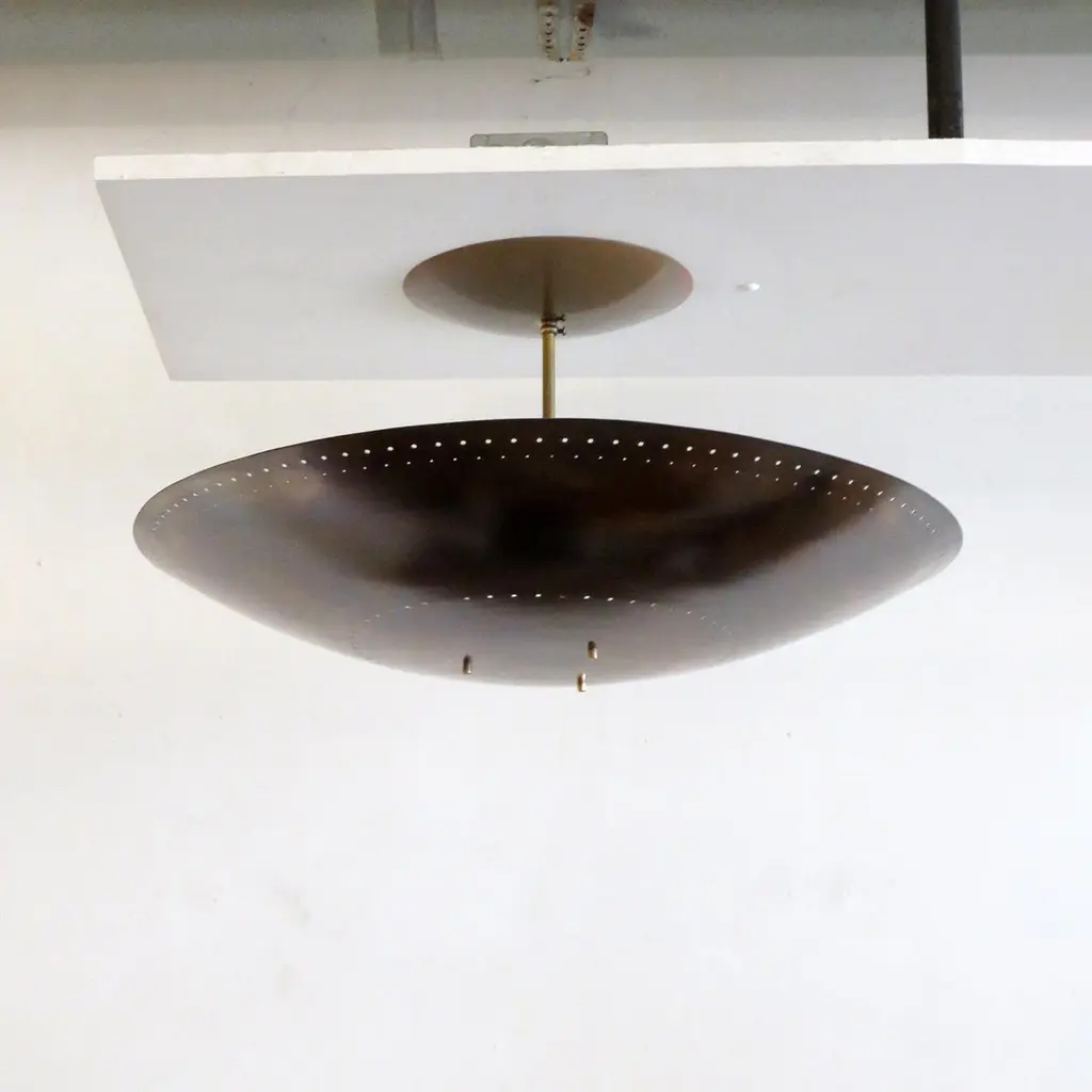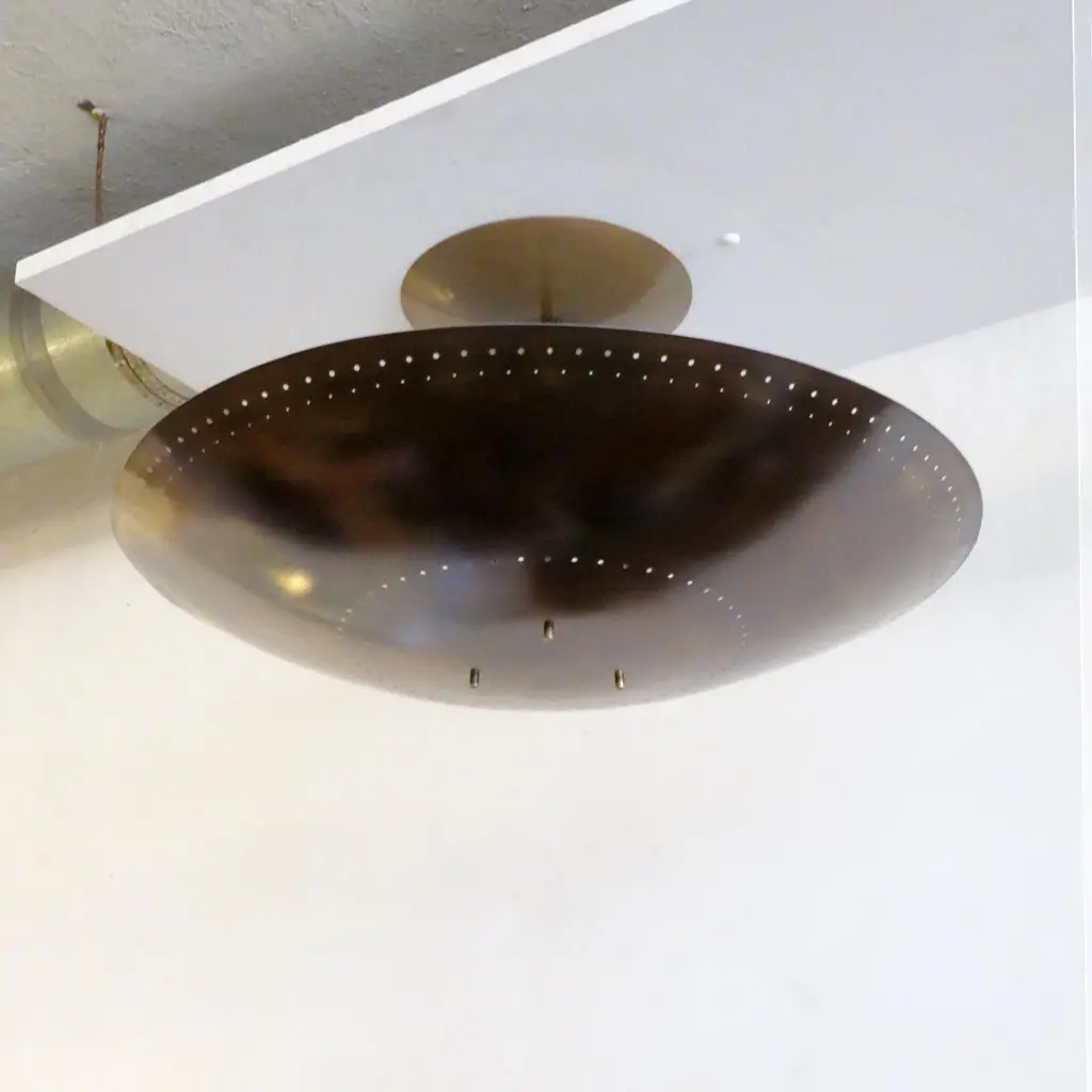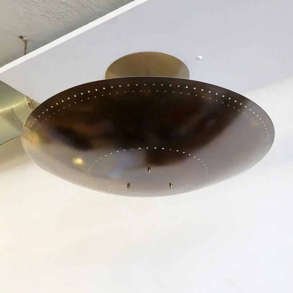 Large-scale ceiling flush mount light 'Utah-24' designed by Gallery L7, handcrafted and finished in Los Angeles from American brass, suspended perforated raw, aged brass disc (24inch diameter). Six E12 sockets per fixture, max. wattage 40w each or LED equivalent, wired for US standards or European standards (110v/220v), bulbs provided as a onetime courtesy (US only). UL listing available upon request for an additional charge. Available in quantity.