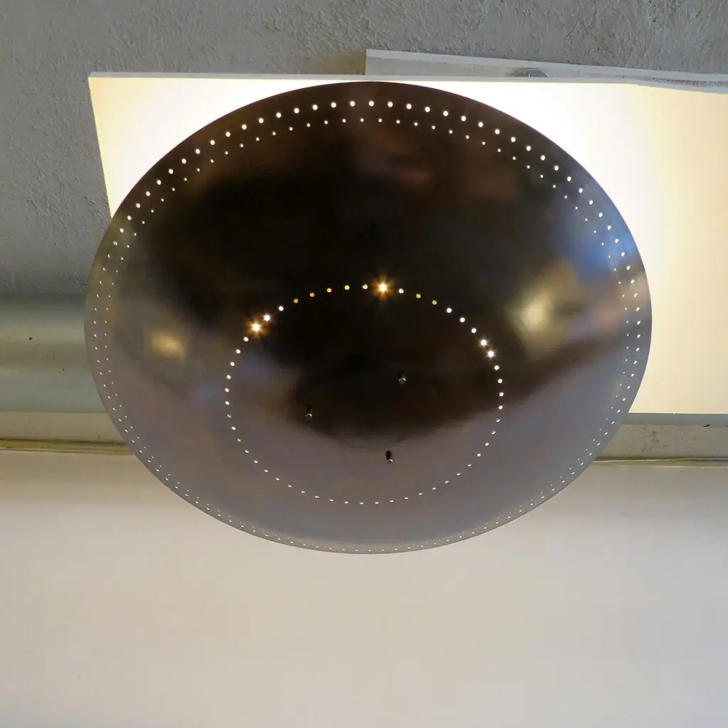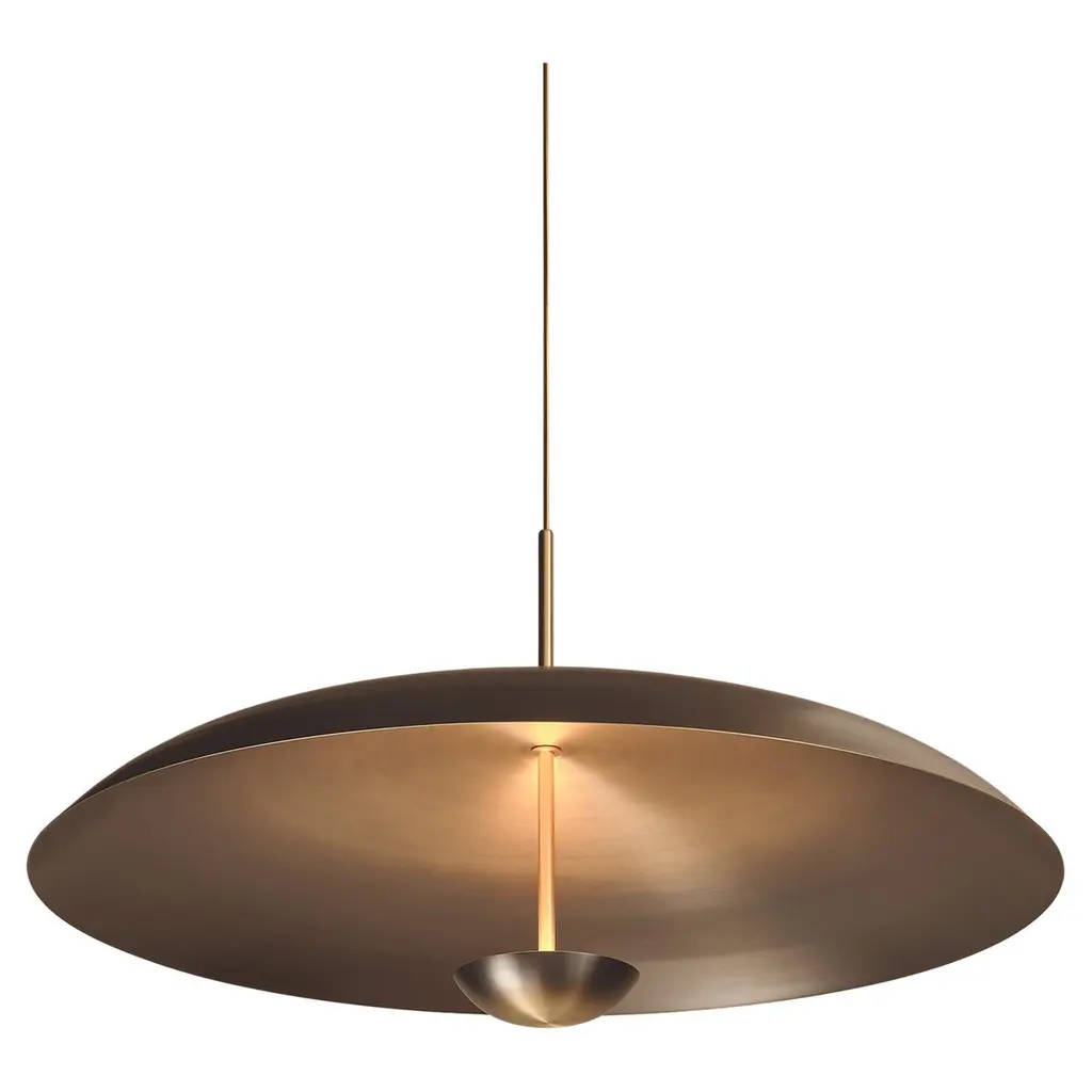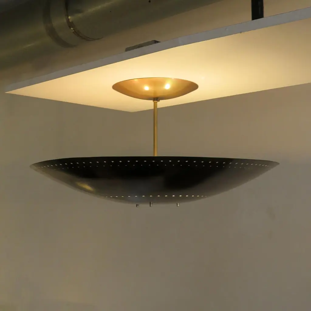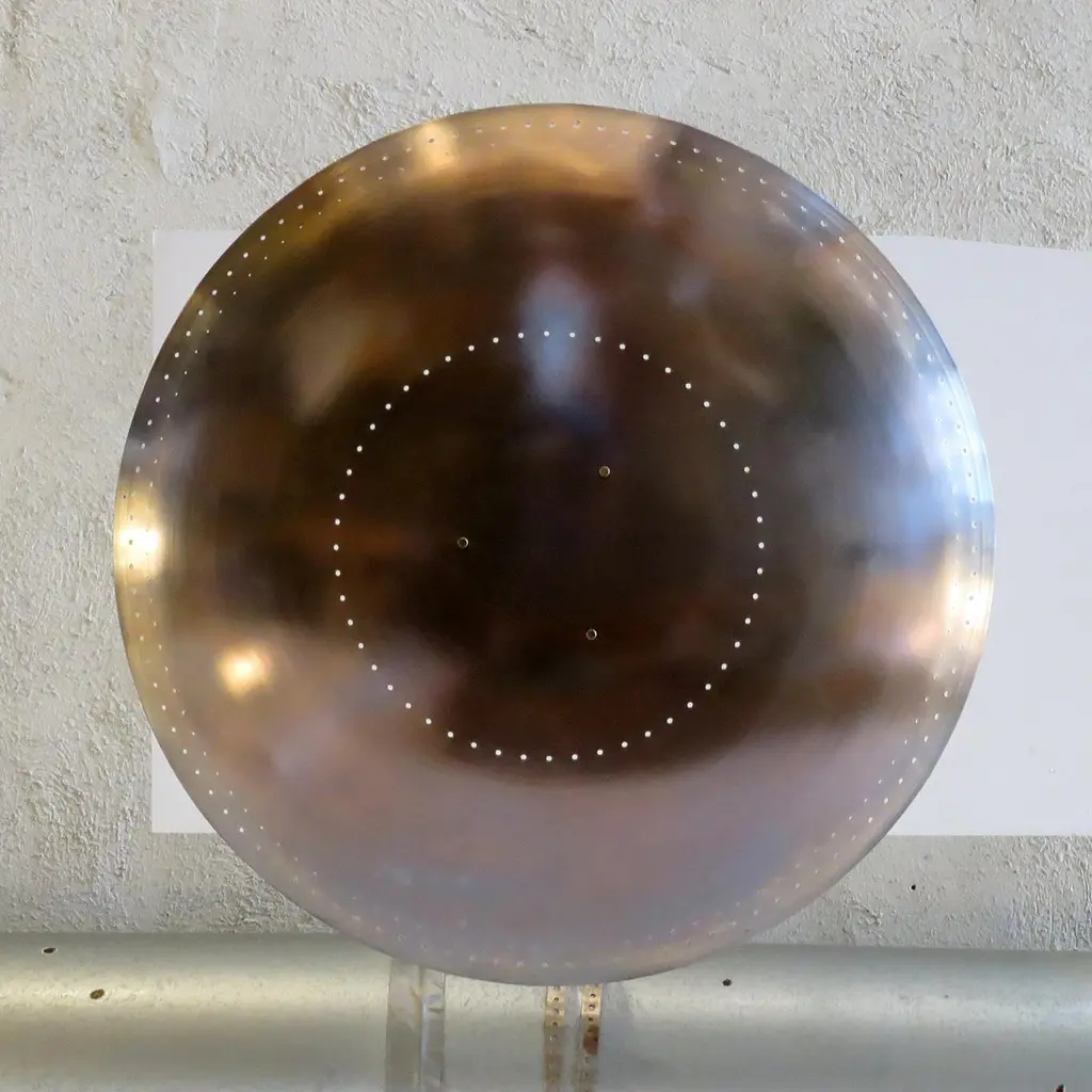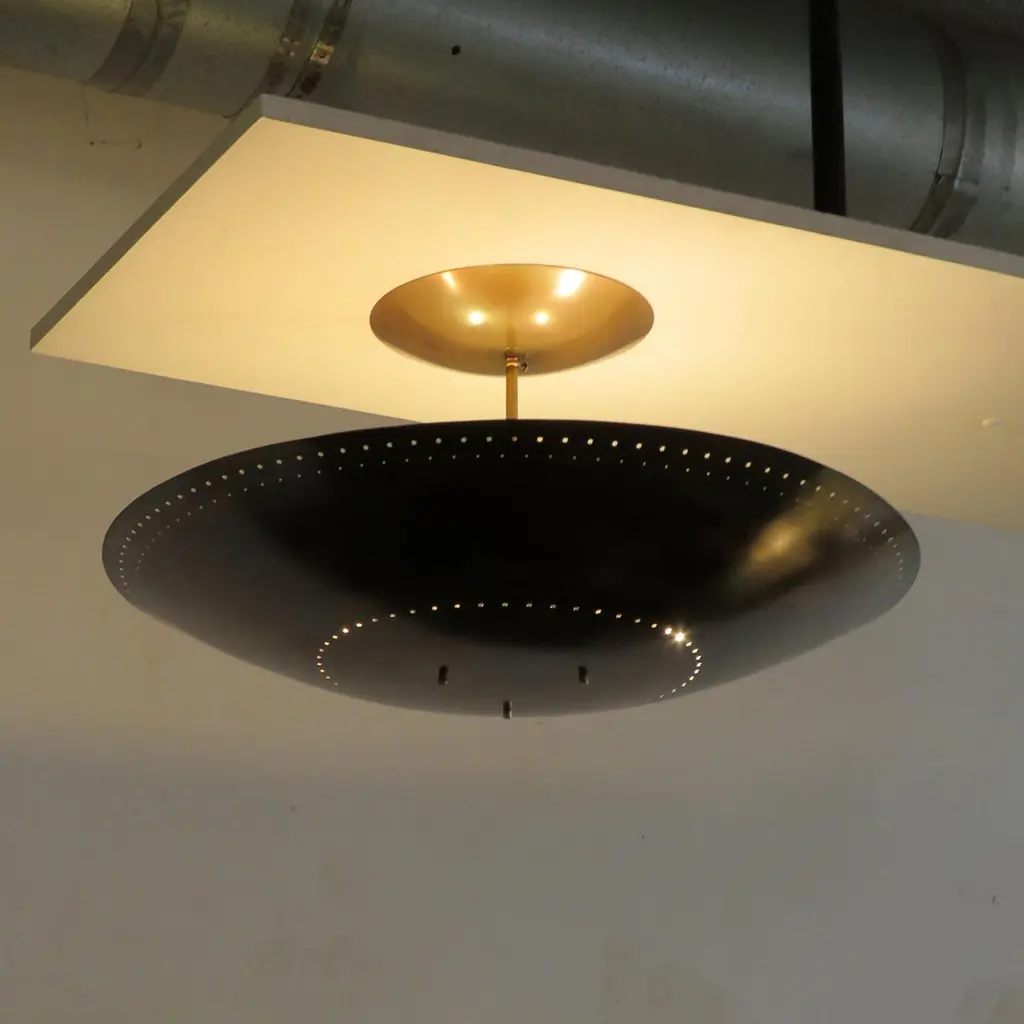 Large-scale ceiling flush mount light 'Utah-24' designed by Gallery L7, handcrafted and finished in Los Angeles from American brass, suspended perforated raw, aged brass disc (24inch diameter). Six E12 sockets per fixture, max. wattage 40w each or LED equivalent, wired for US standards or European standards (110v/220v), bulbs provided as a onetime courtesy (US only). UL listing available upon request for an additional charge. Available in quantity.