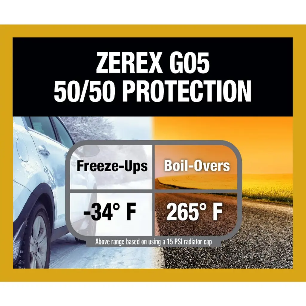 Zerex from Valvoline is the #1 selling OEM-approved coolant brand. Zerex G05 Antifreeze/Coolant is proven to maximize engine life in newer Ford, Chrysler and Mercedes-Benz cars, light trucks and heavy-duty vehicles. Suitable for both gasoline and diesel engines, its original long-life chemistry is specially formulated with the highest quality virgin ethylene glycol and Hybrid Organic Acid Technology (HOAT). Zerex is made for your car and protects better than industry standards against corrosion, leaking, deposits as well as freezing and boiling – the four main causes of cooling system failure, which is the leading cause of engine breakdown. Our low-silicate, reduced pH, phosphate-free formula with Hybrid Organic Acid Technology (HOAT) protects all cooling system metals (including aluminum) from corrosion. It contains nitrites that protects diesel-engine cylinder liners from cavitation, while deposit control additives guard against hardwater deposits and scale. So radiators, water pumps and other metal cooling system parts stay clean and your antifreeze flows and functions properly. Whether you’re topping off your radiator or doing a complete system flush, trust Zerex G05 Antifreeze/Coolant. Made for your car. Made by Valvoline.