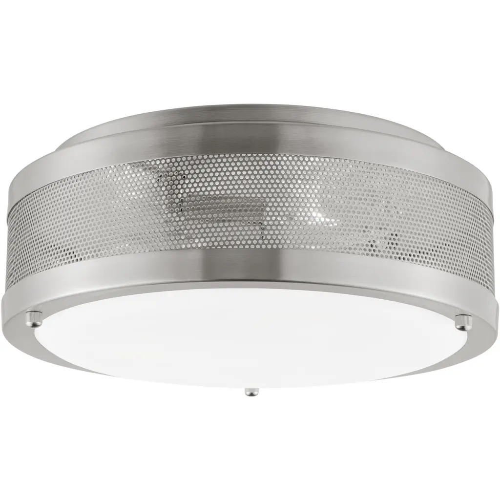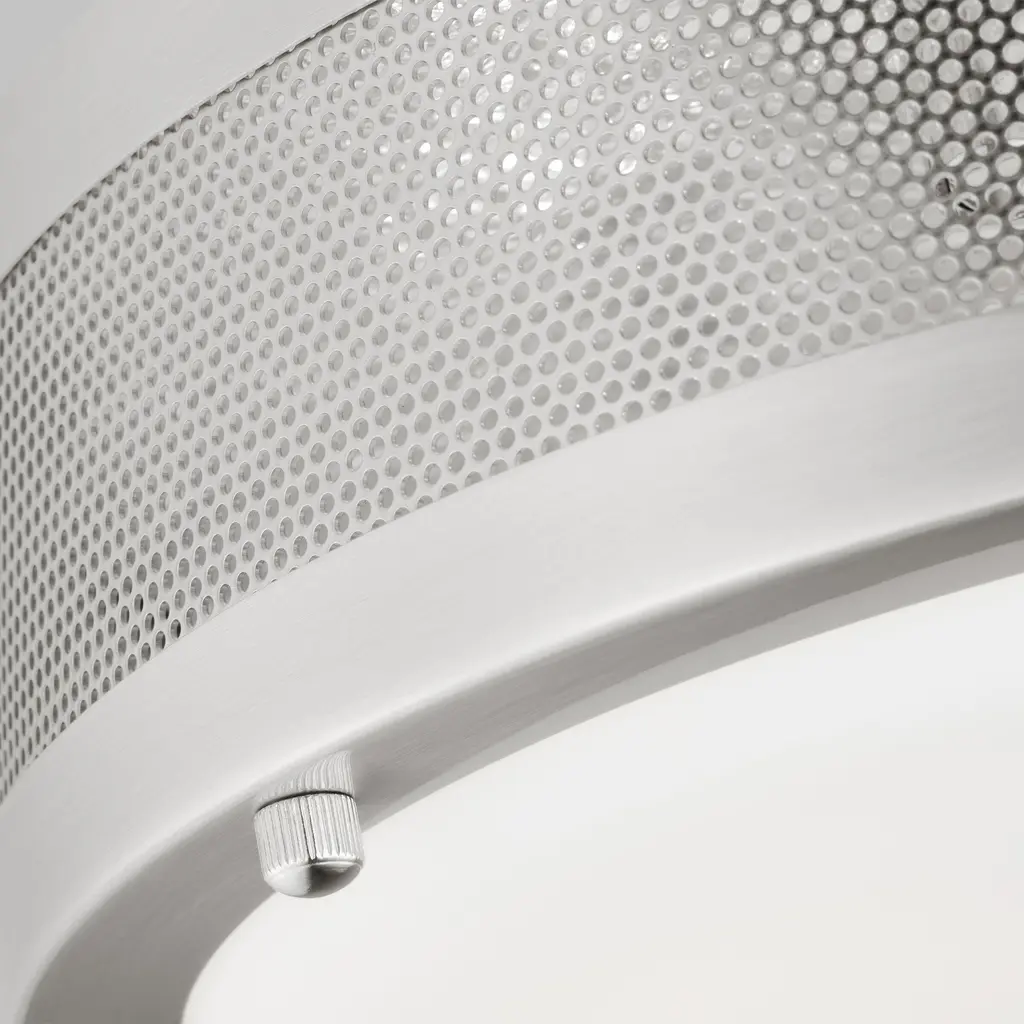 The Vander three light flush mount fixture in brushed nickel silver Vander is a loft-style flush mount featuring a perforated metal exterior banded an opal etched diffuser. Use it in a mudroom or laundry room for unfettered, functional light