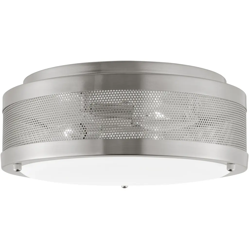 The Vander three light flush mount fixture in Satin Brass Vander is a loft-style flush mount featuring a perforated metal exterior banded an opal etched diffuser. Use it in a mudroom or laundry room for unfettered, functional light.