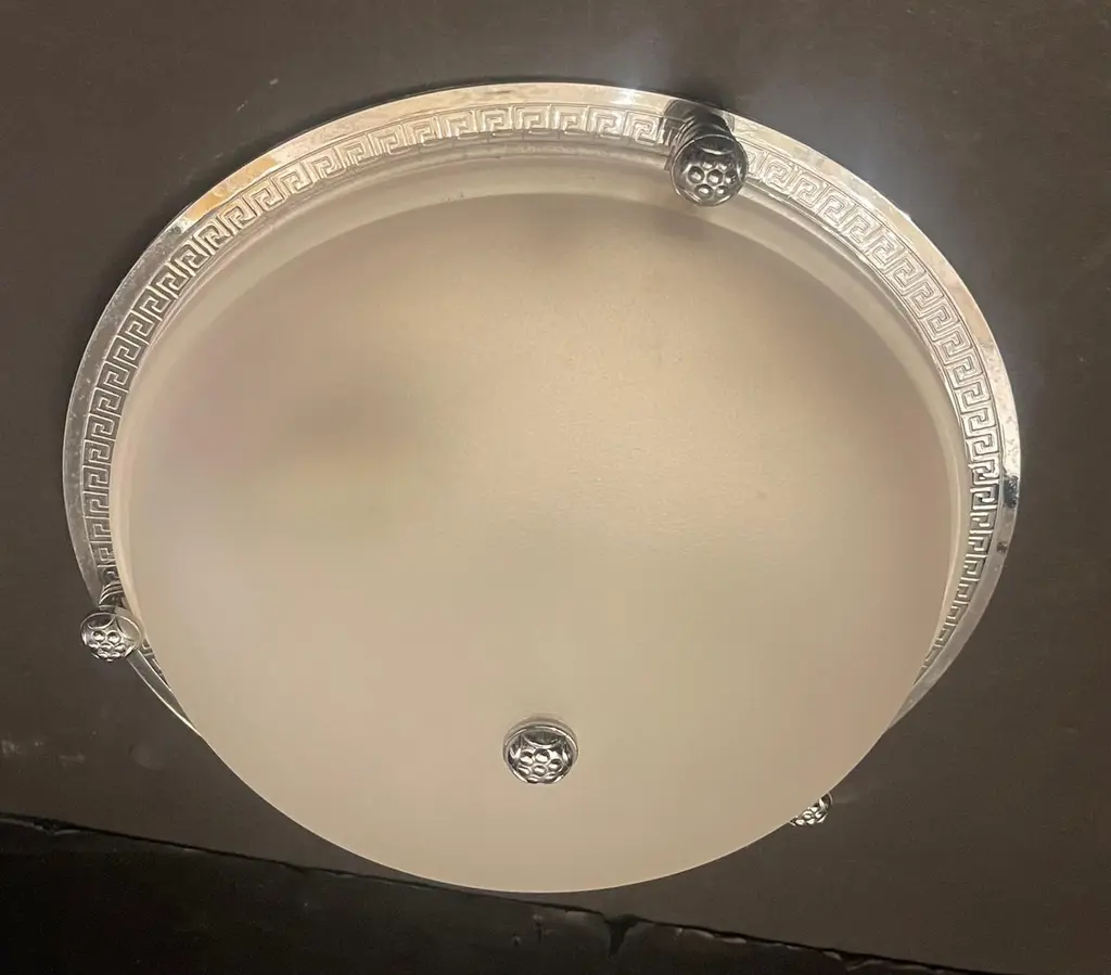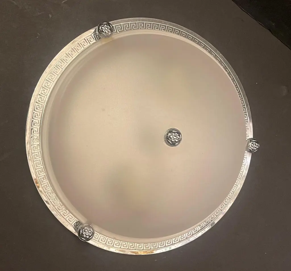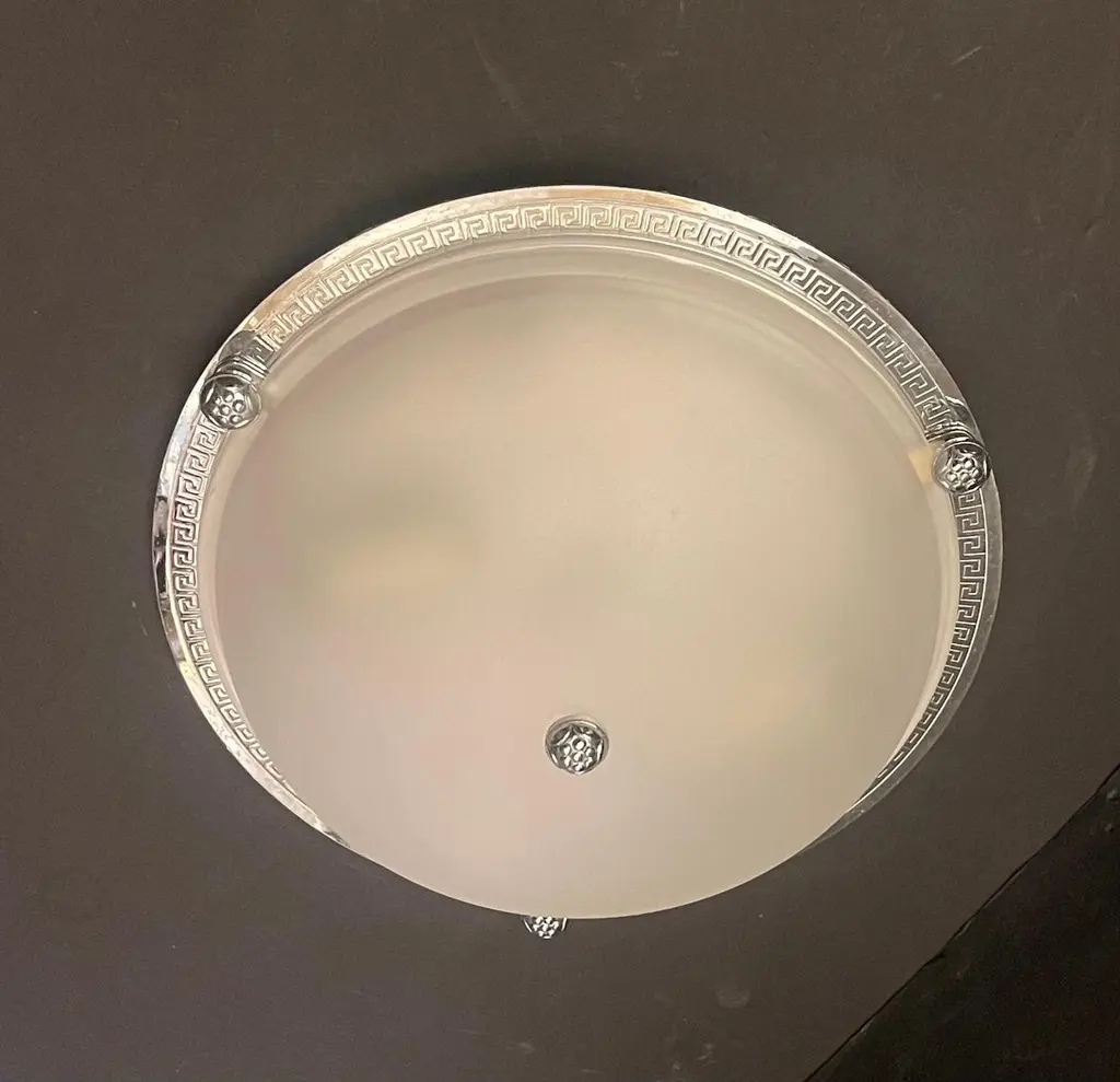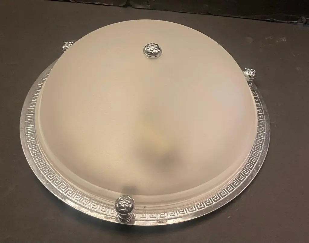 A Wonderful Vaughan Regency Style Pair Of Greek Key Design Polished Nickel And Frosted Glass Shade 2 Candelabra Light Flush Mount FixturesEach Sold Separately