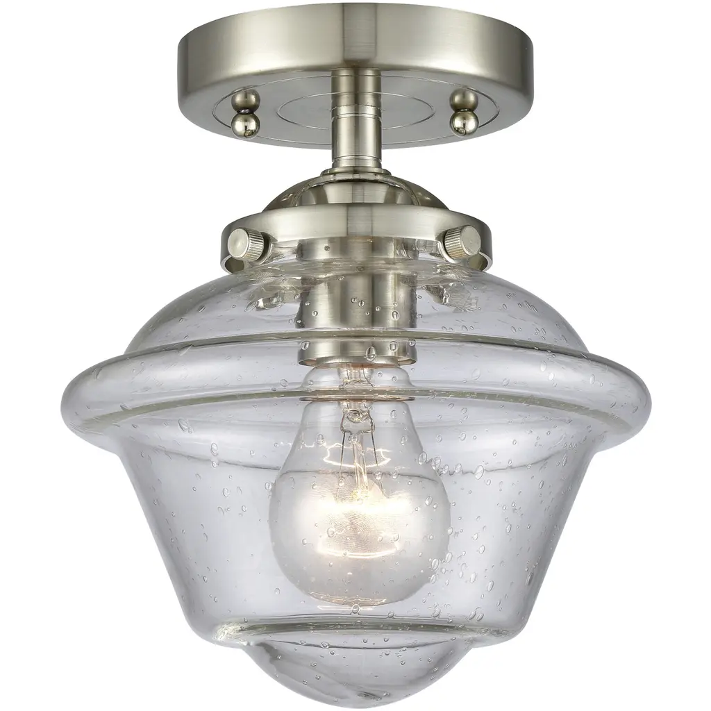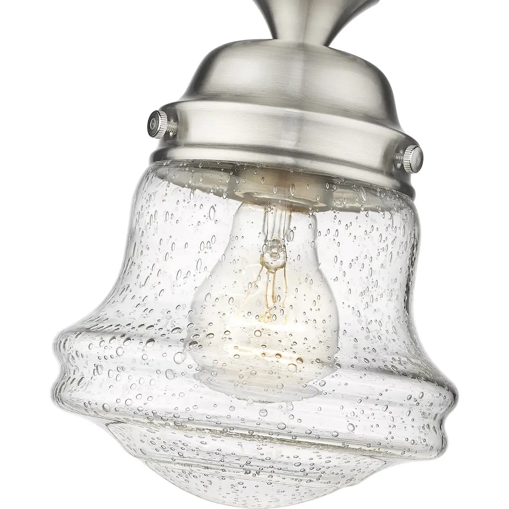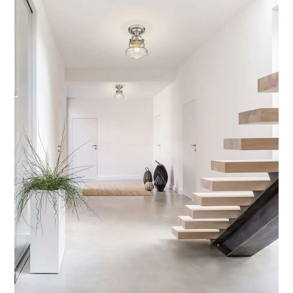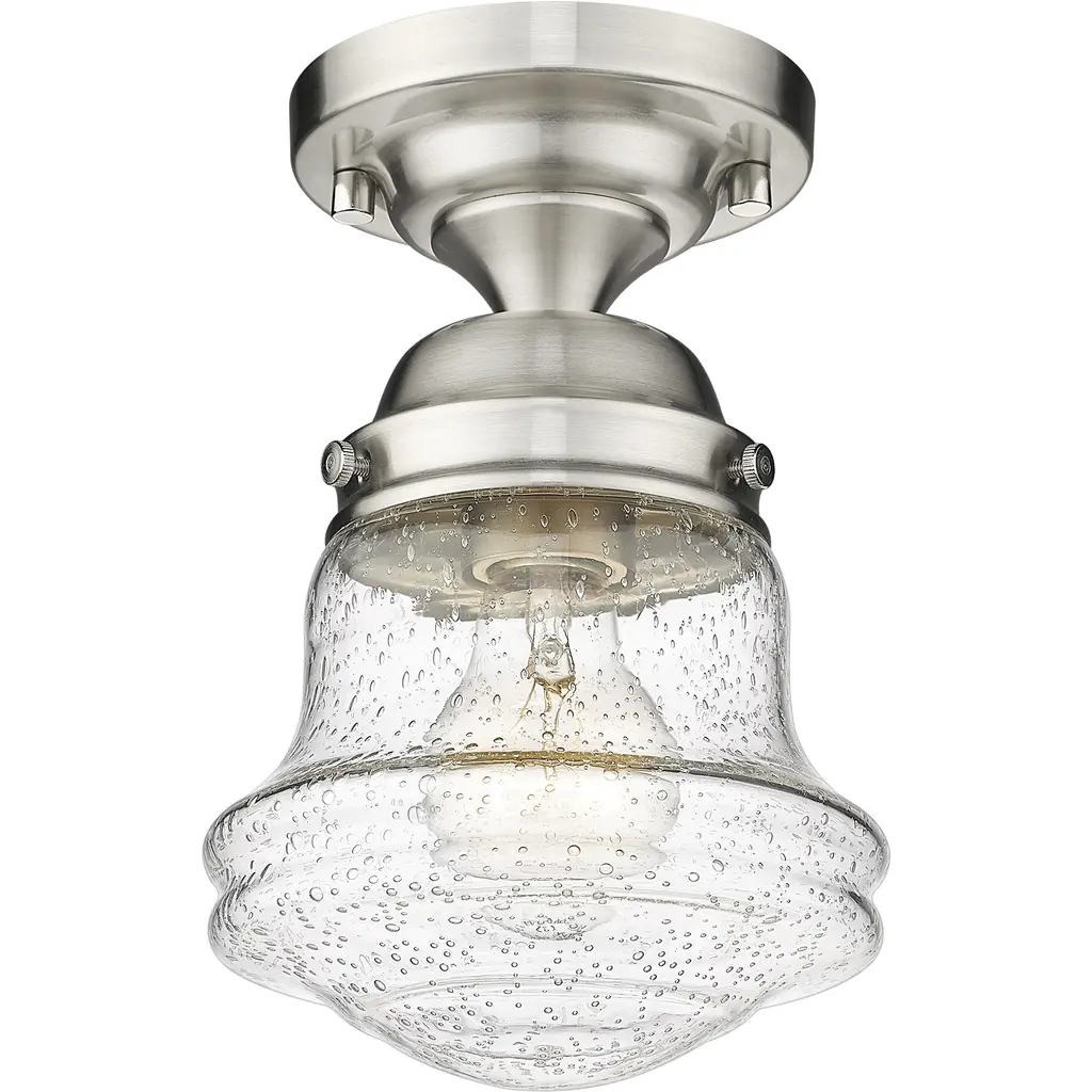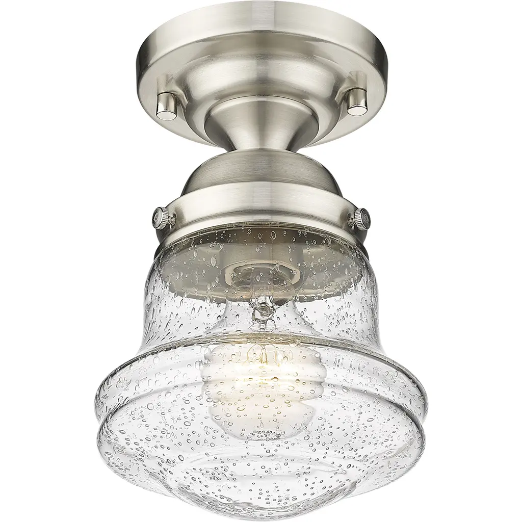 Give your space a modern farmhouse feel or restoration aesthetic with this perfectly sized, petite single light flush mount, designed with a small yet sleek contoured silhouette and a gleaming brushed nickel finish that creates a subtle metallic touch to the space. A perfect addition to a compact apartment foyer or narrow hallway, this Mid-Century Modern-inspired flush mount also offers an artisan quality with a clear seedy glass globe that presents an old-world charm and texture. Mount this small transitional flush mount within a sophisticated yet rustic country setting, elevating the interior with contrasted luxe materials.