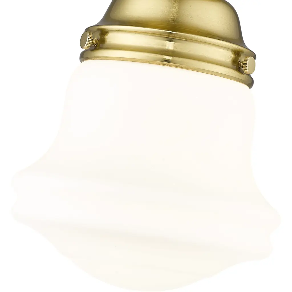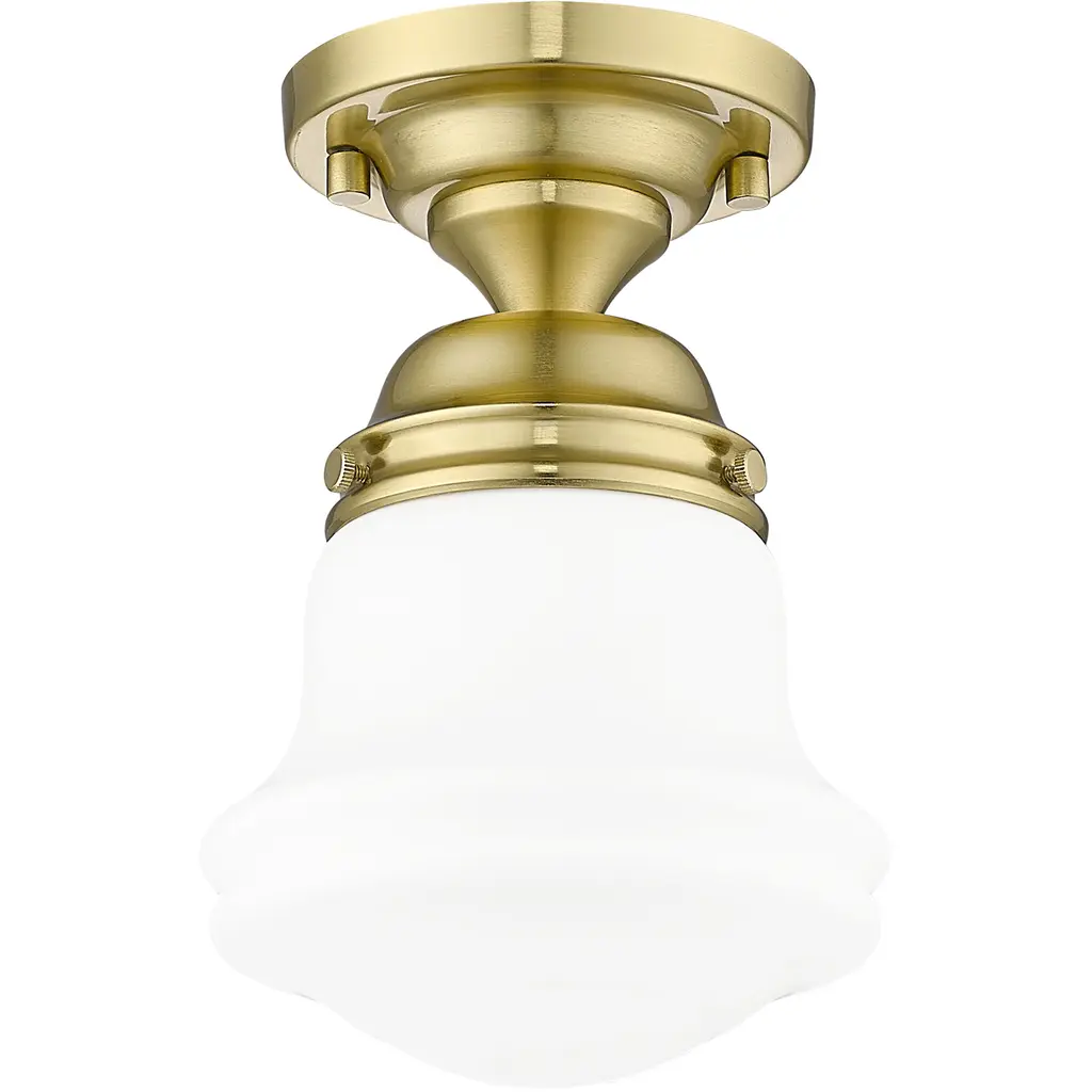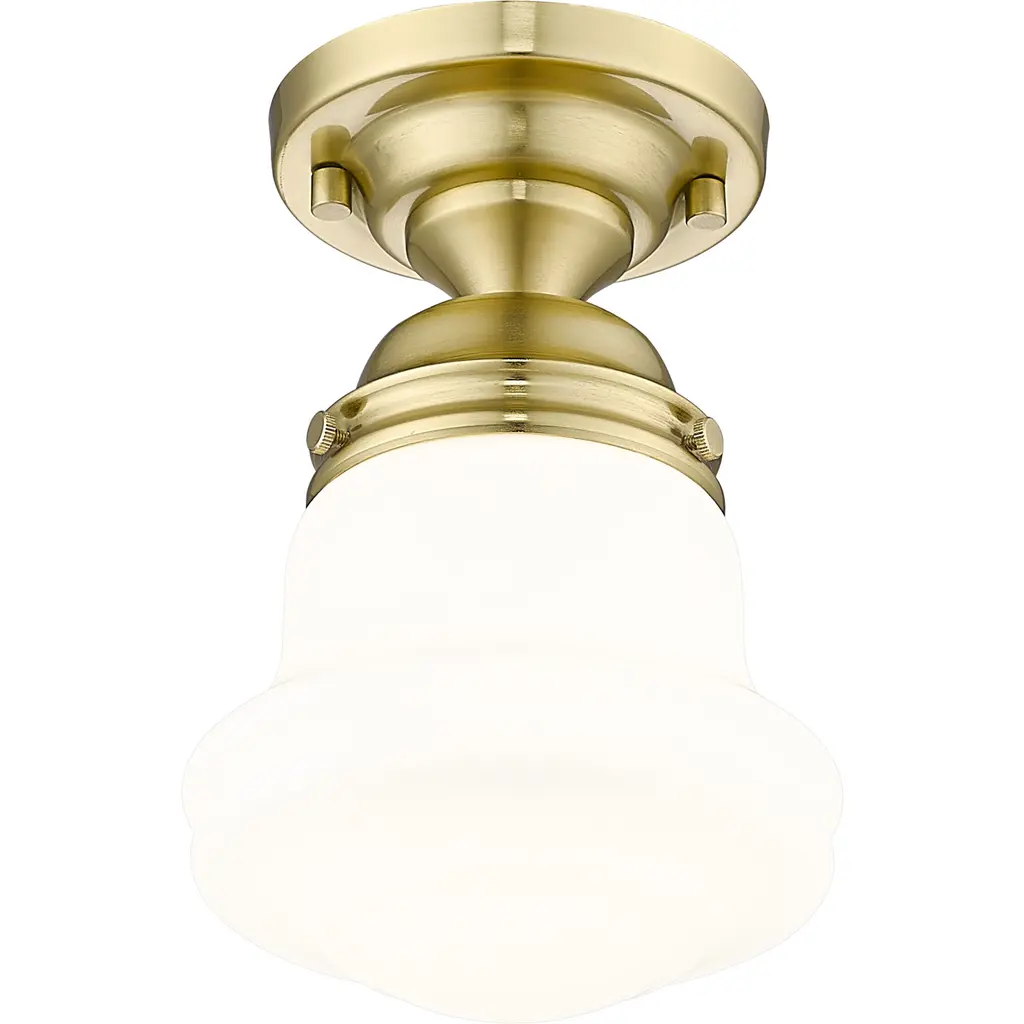 Infused with character, a modern one-light flush mount ceiling light is the perfect upgrade for your bedroom, den or hallway. Its matte opal schoolhouse glass brings exquisite vintage character, while a luxe gold finish ensures a contemporary ambiance that suits modern living. This close-to-the-ceiling fixture is ideal for rooms with lower ceilings in need of bright, diffused illumining.