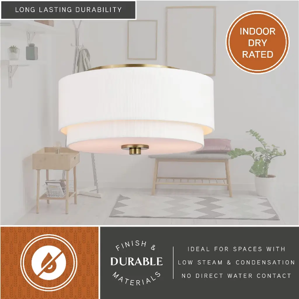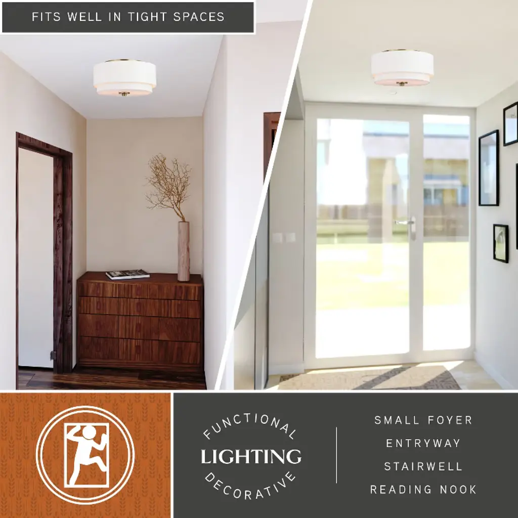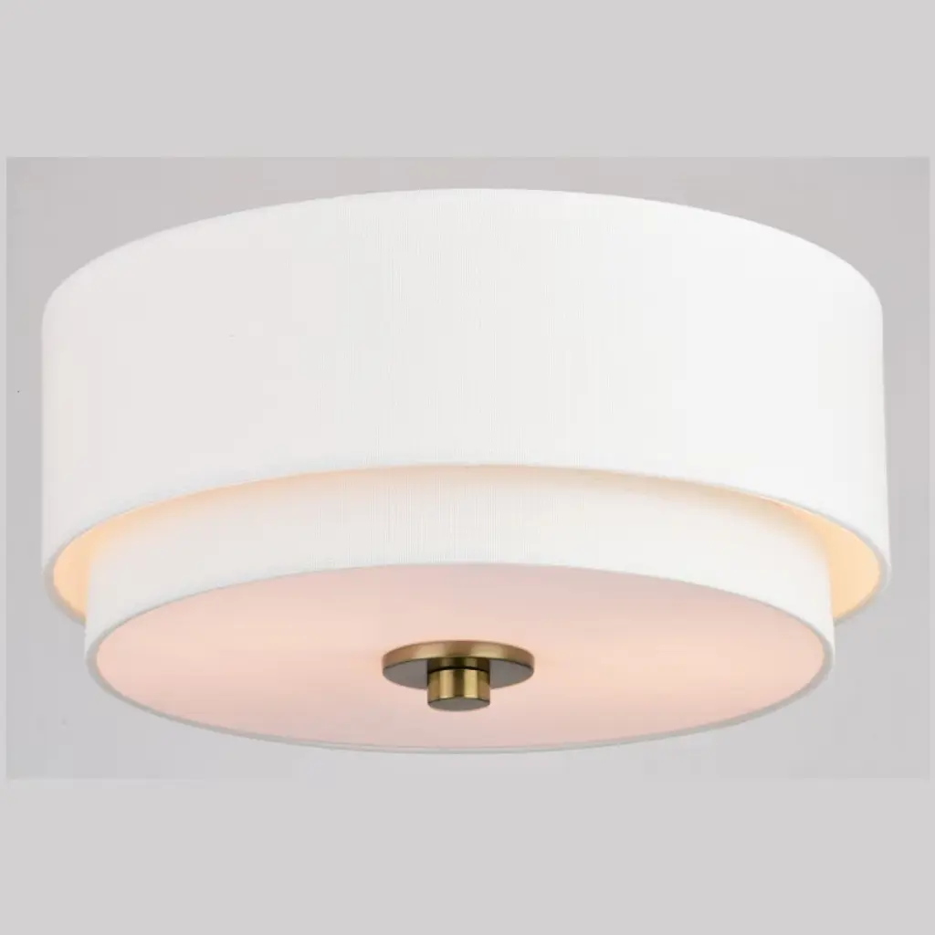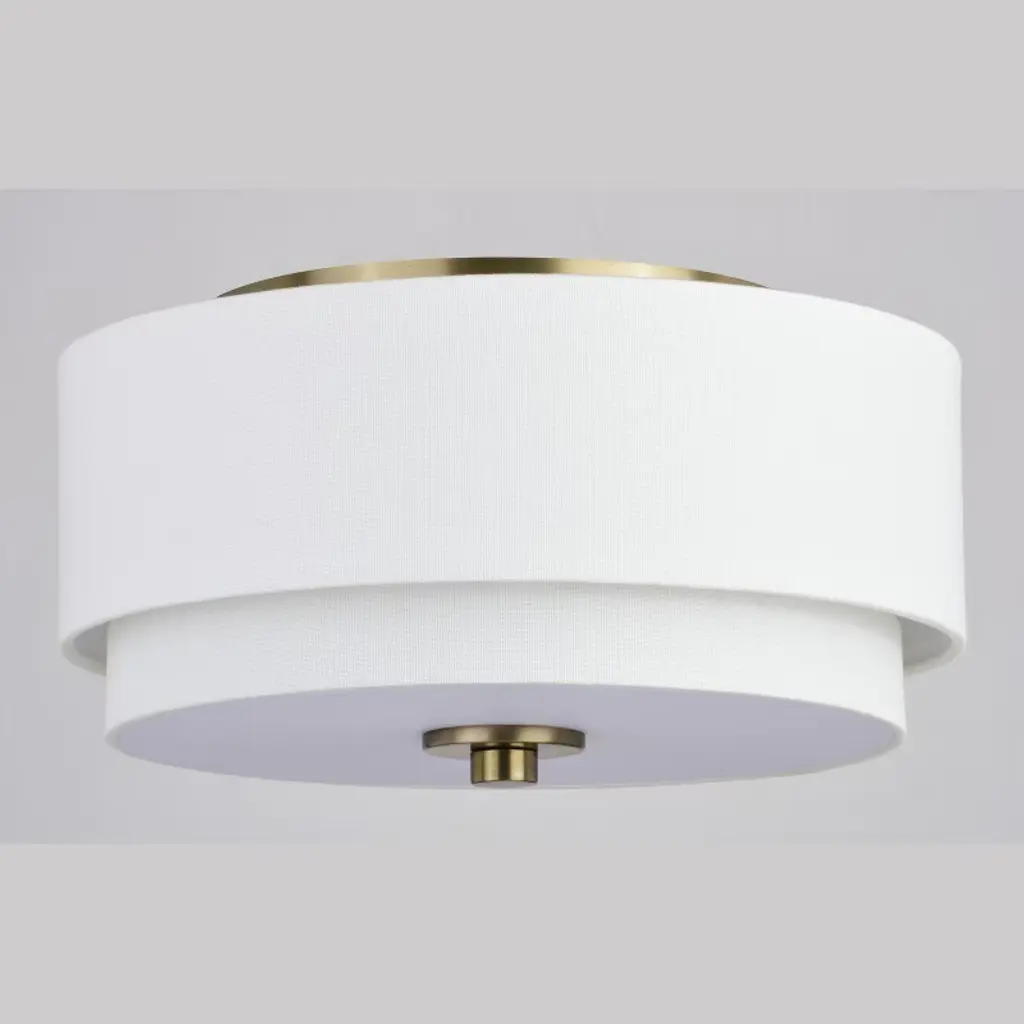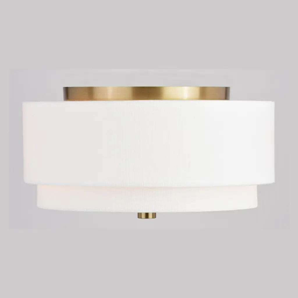 Indulge your Mid-century modern dreams with this timeless collection. The Burnaby collection brings an undeniably updated feel to your vintage styling with its interplay of crisp fabric shade and contrasting metal finish. This flush mount ceiling light is perfect for a low ceiling foyer, living room, hallway, entryway, or bedroom. Its soft Mid-century modern style is enhanced by a white linen drum shade. A white acrylic diffuser hides the bulbs and softens the light distribution.