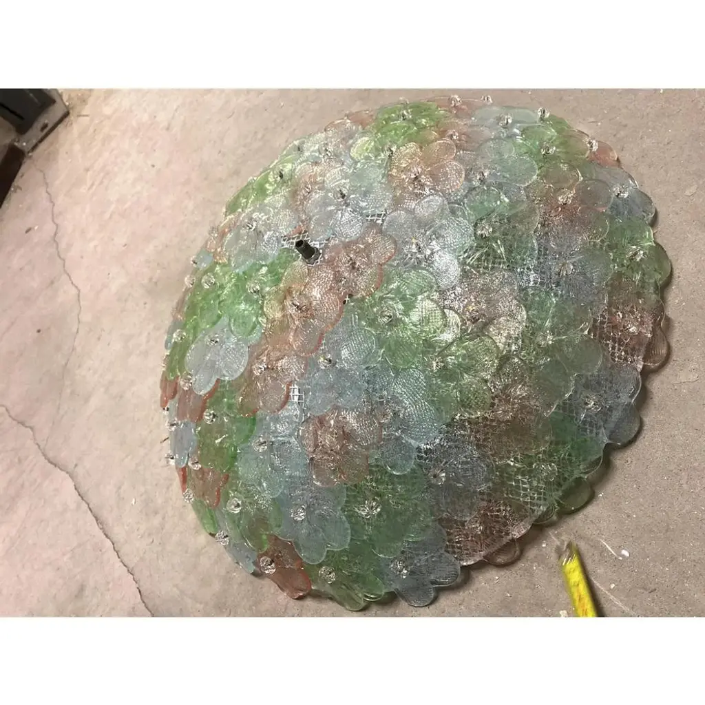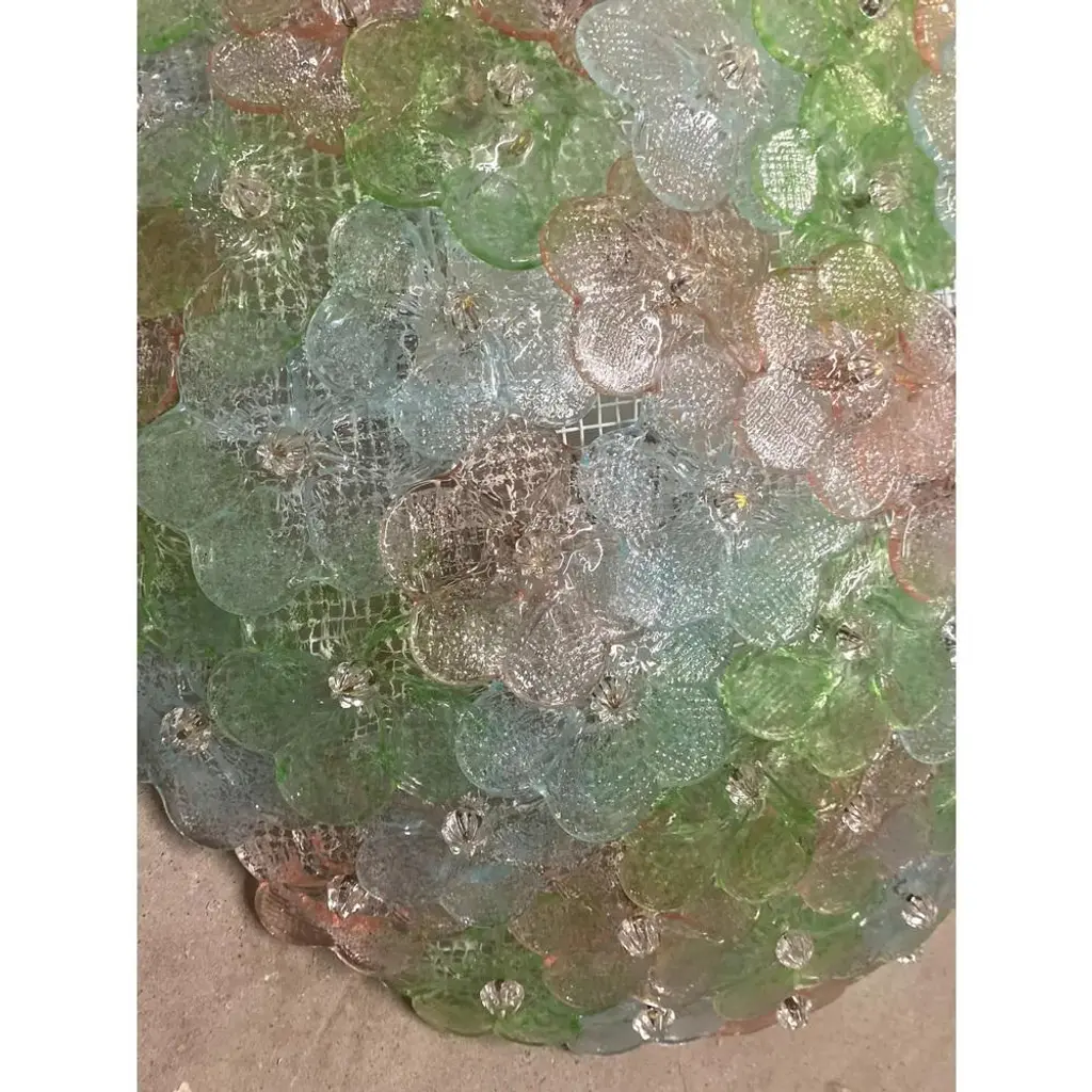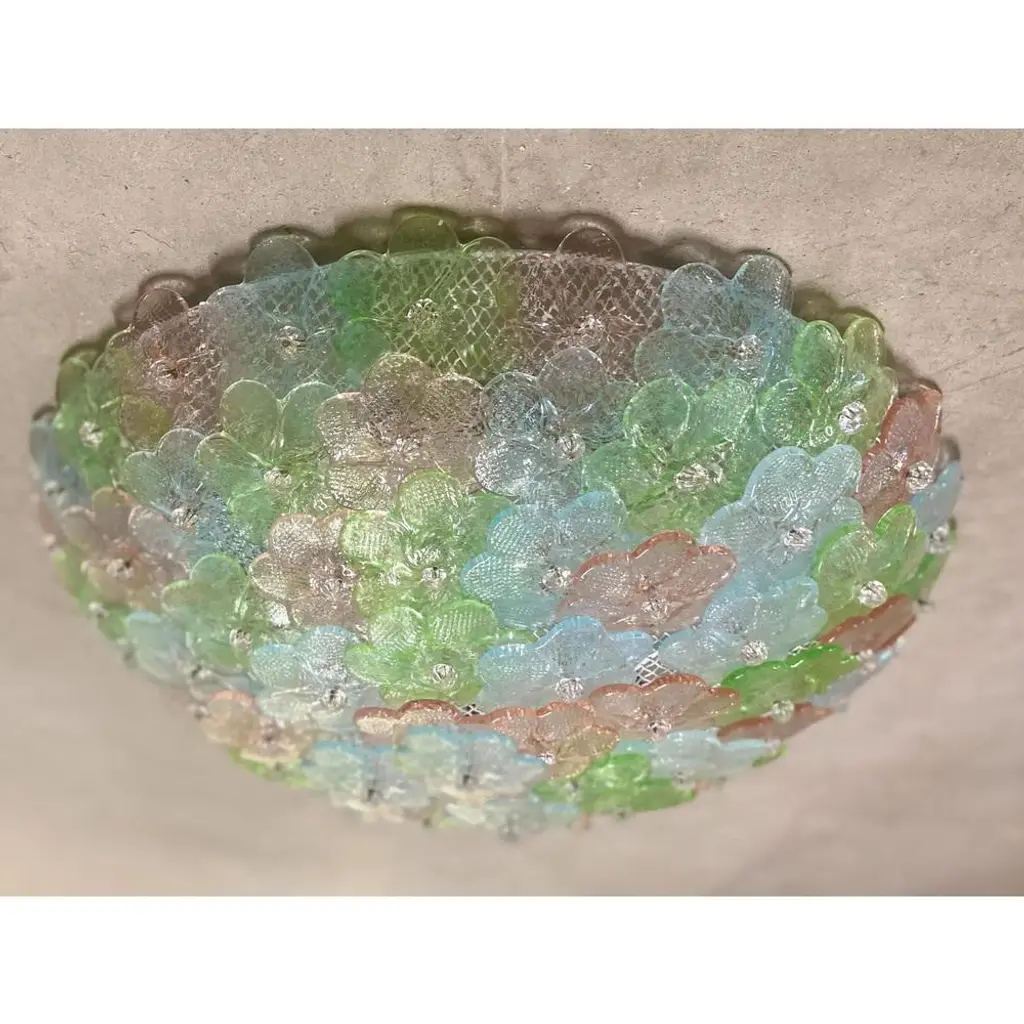 Traditional venetian little flowers flush mount in multicolored murano glass. pretty jewels of hight italian han-craftmanship. Little flowers in pink, light-blue and green murano glass.delic ate combination of colors. traditional working of murano glass for all interiors. metal frame in white diameter 50cm height 20 cm /d 19.7" h.7.8" 6 bulbs. Now are wired europe, we need 3 weeks for wired usa us plug (up to 110v).