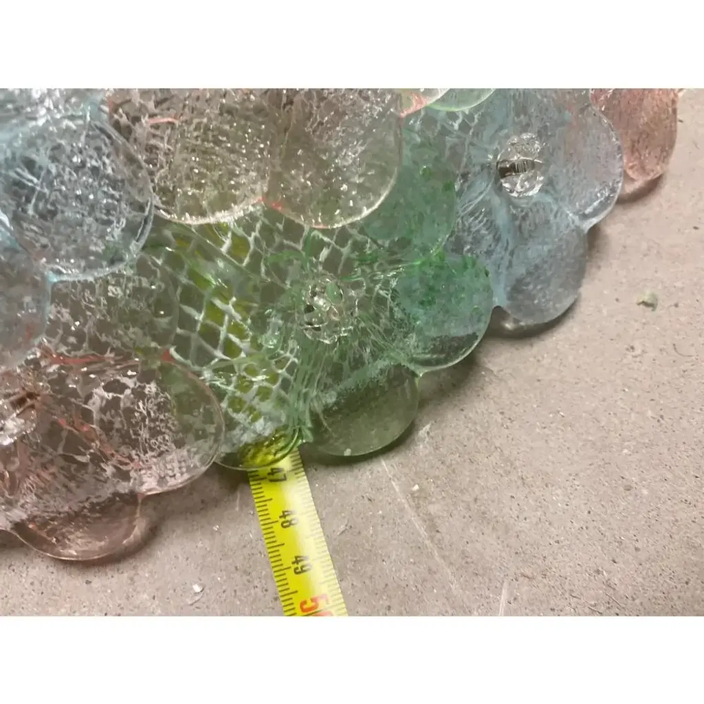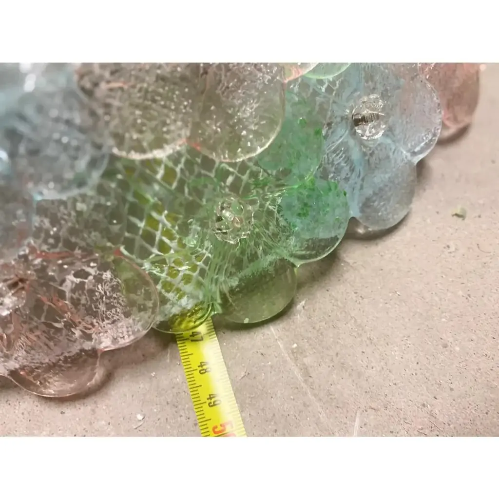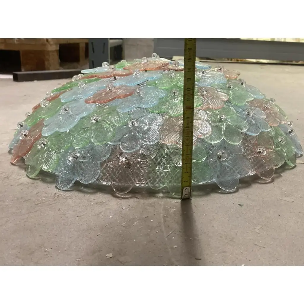 Traditional venetian little flowers flush mount in multicolored murano glass. pretty jewels of hight italian han-craftmanship. Little flowers in pink, light-blue and green murano glass.delic ate combination of colors. traditional working of murano glass for all interiors. metal frame in white diameter 50cm height 20 cm /d 19.7" h.7.8" 6 bulbs. Now are wired europe, we need 3 weeks for wired usa us plug (up to 110v).